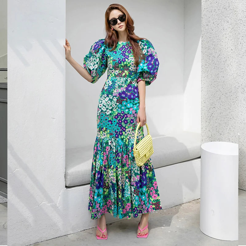 Korean Floral Print Long Dress - 2023 Summer Fashion for Women - Slim Fit with Puff Sleeves and Fishtail - O-Neck - Vintage Style
