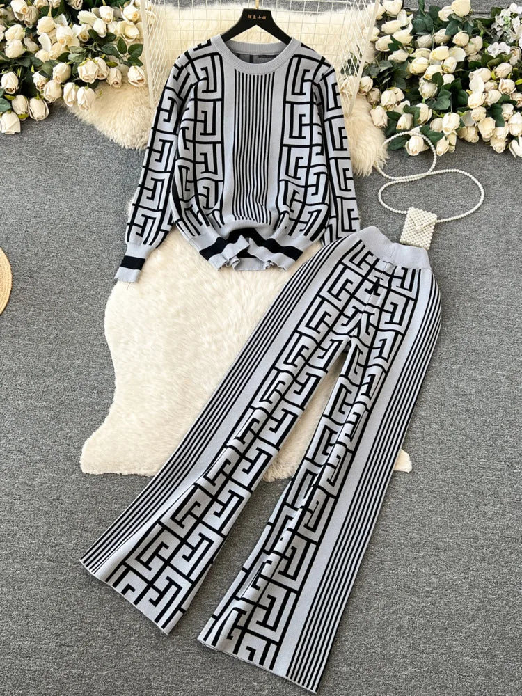 Korean Style Knit Sweater and Pants Set - Labyrinth Print - Loose Fit - Sizes XS-XL