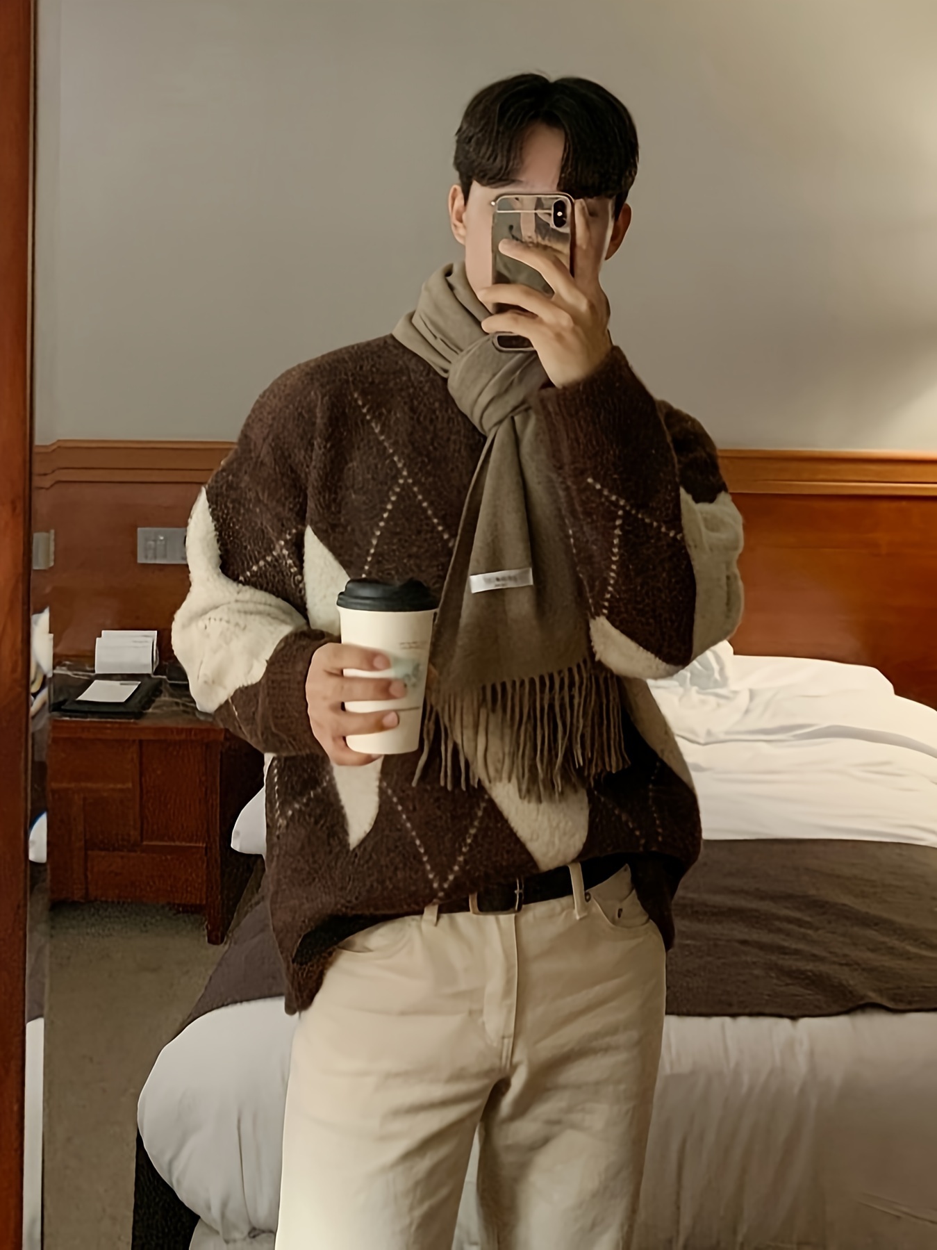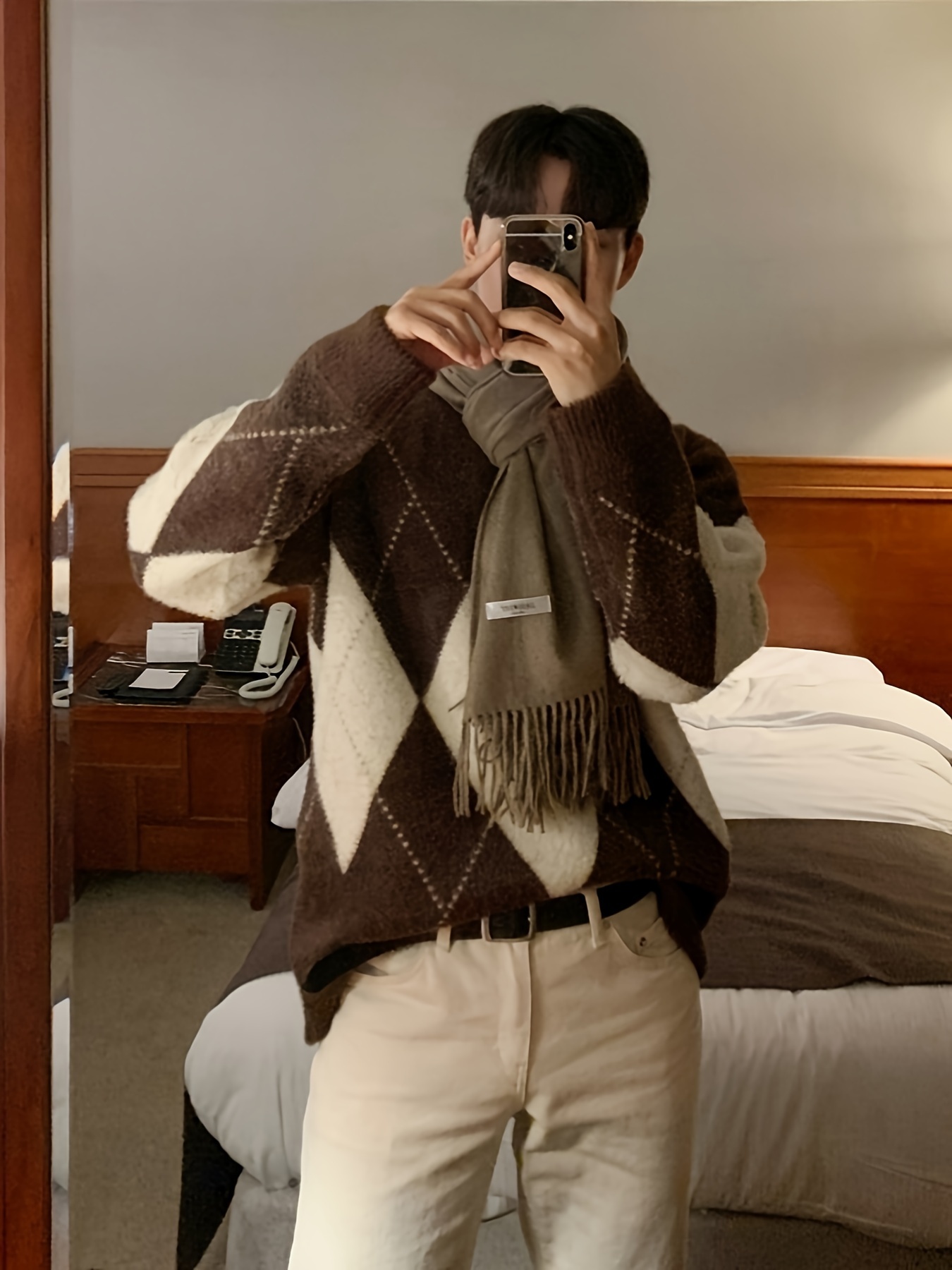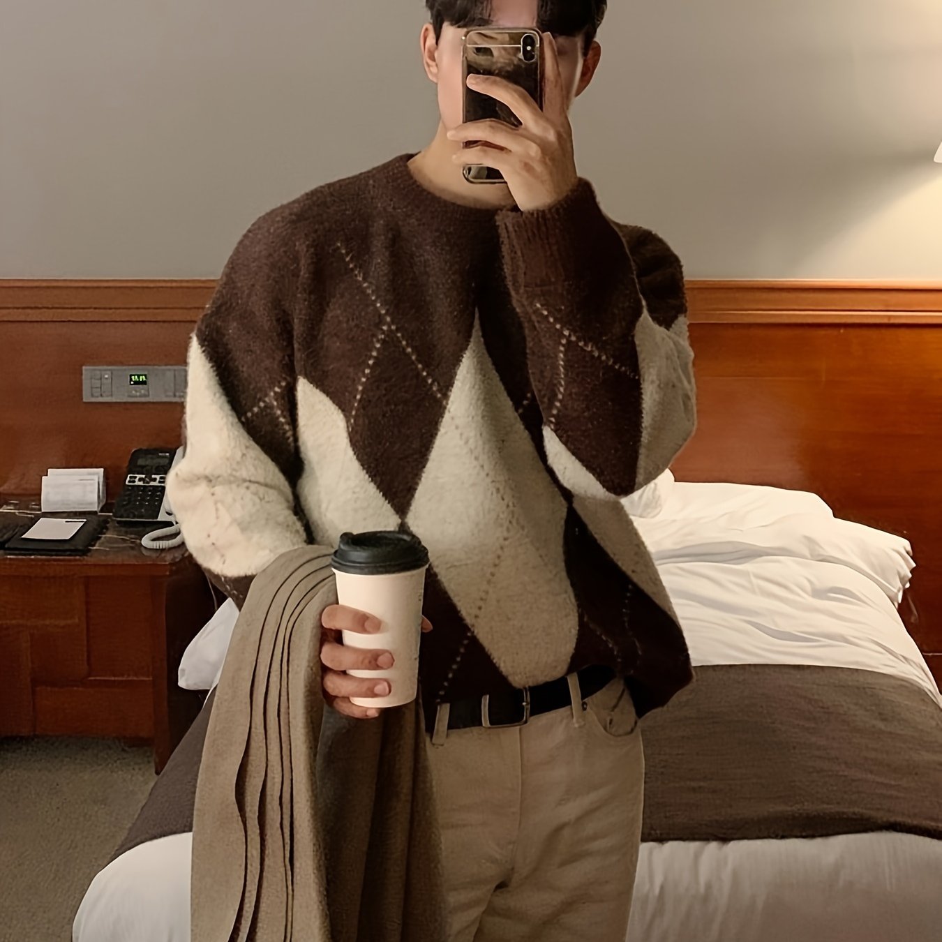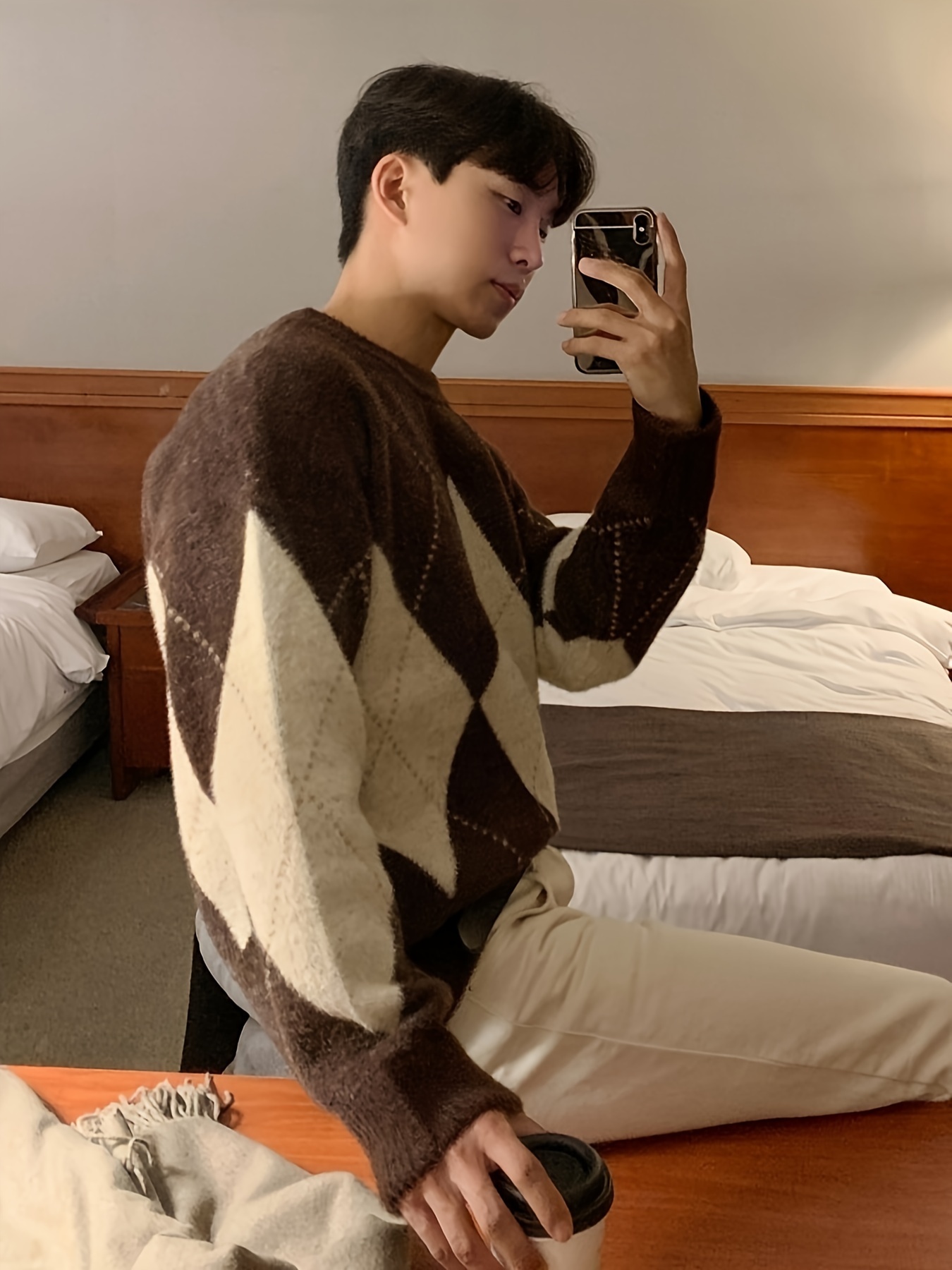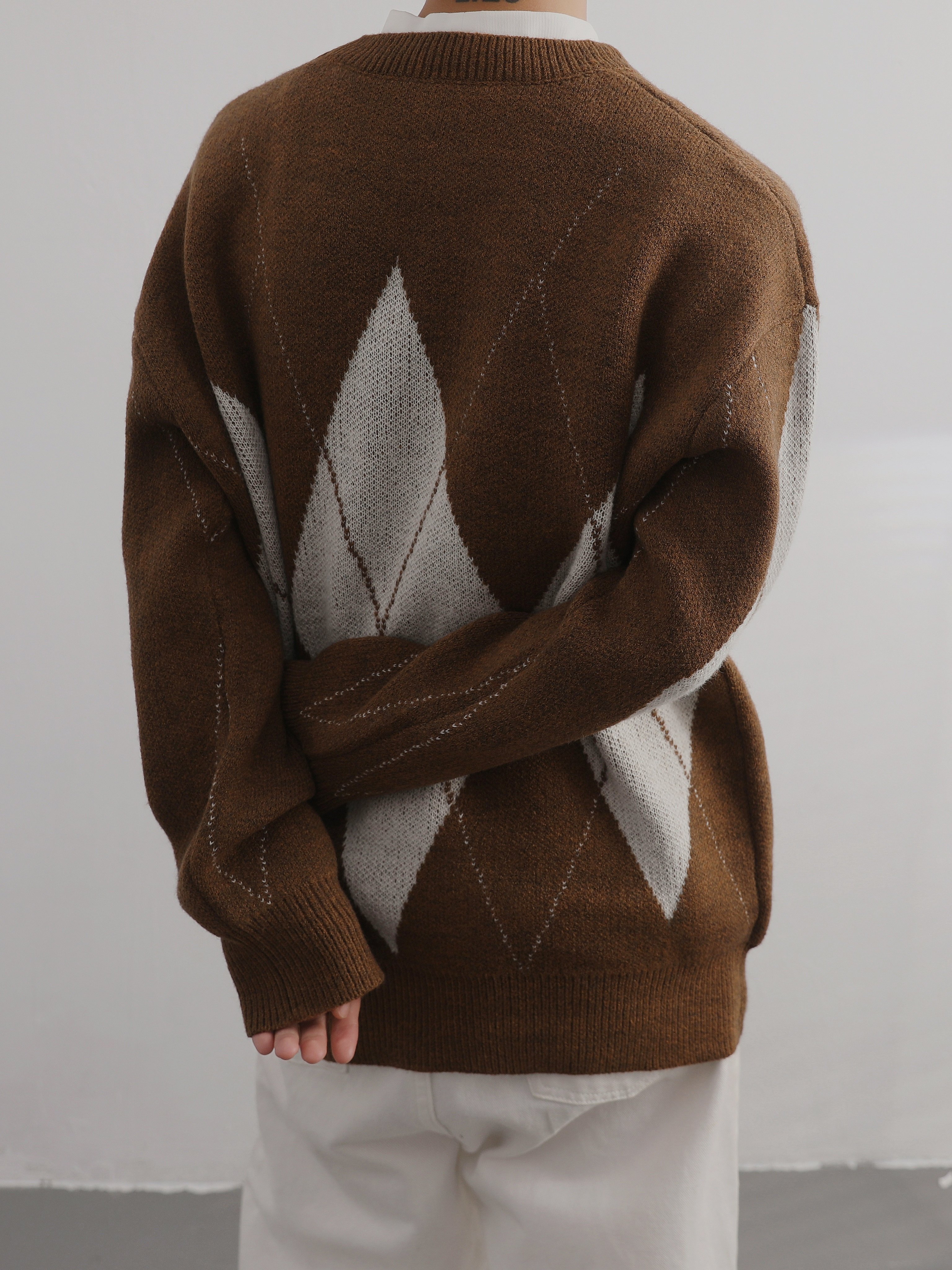 Men's Trendy Argyle Pattern Sweater, Casual High Stretch Breathable Loose Fit Pullover Top For Fall Winter