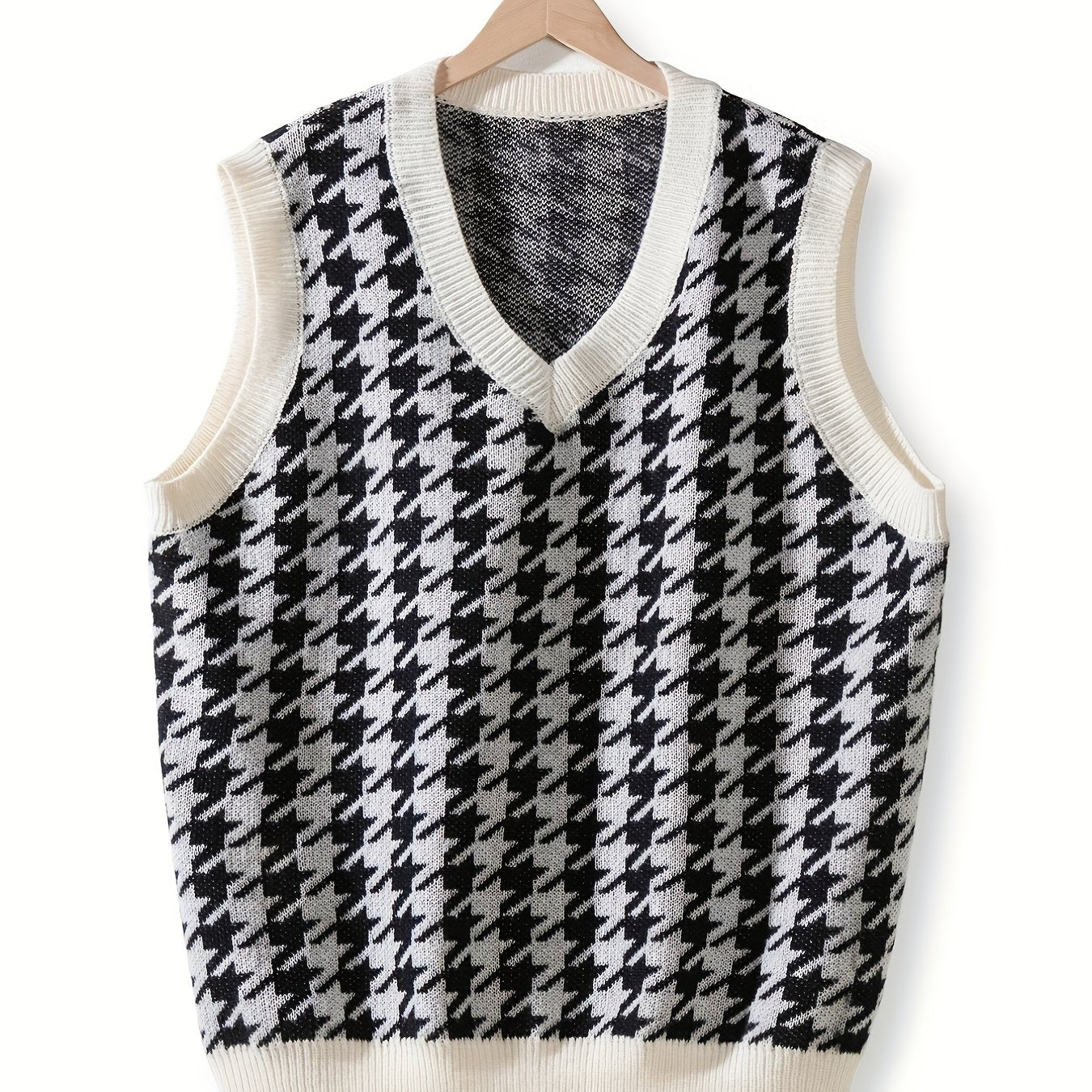 Men's V-neck Houndstooth Casual Sleeveless Knitted Sweater Vest, Men's Clothing For Autumn Winter