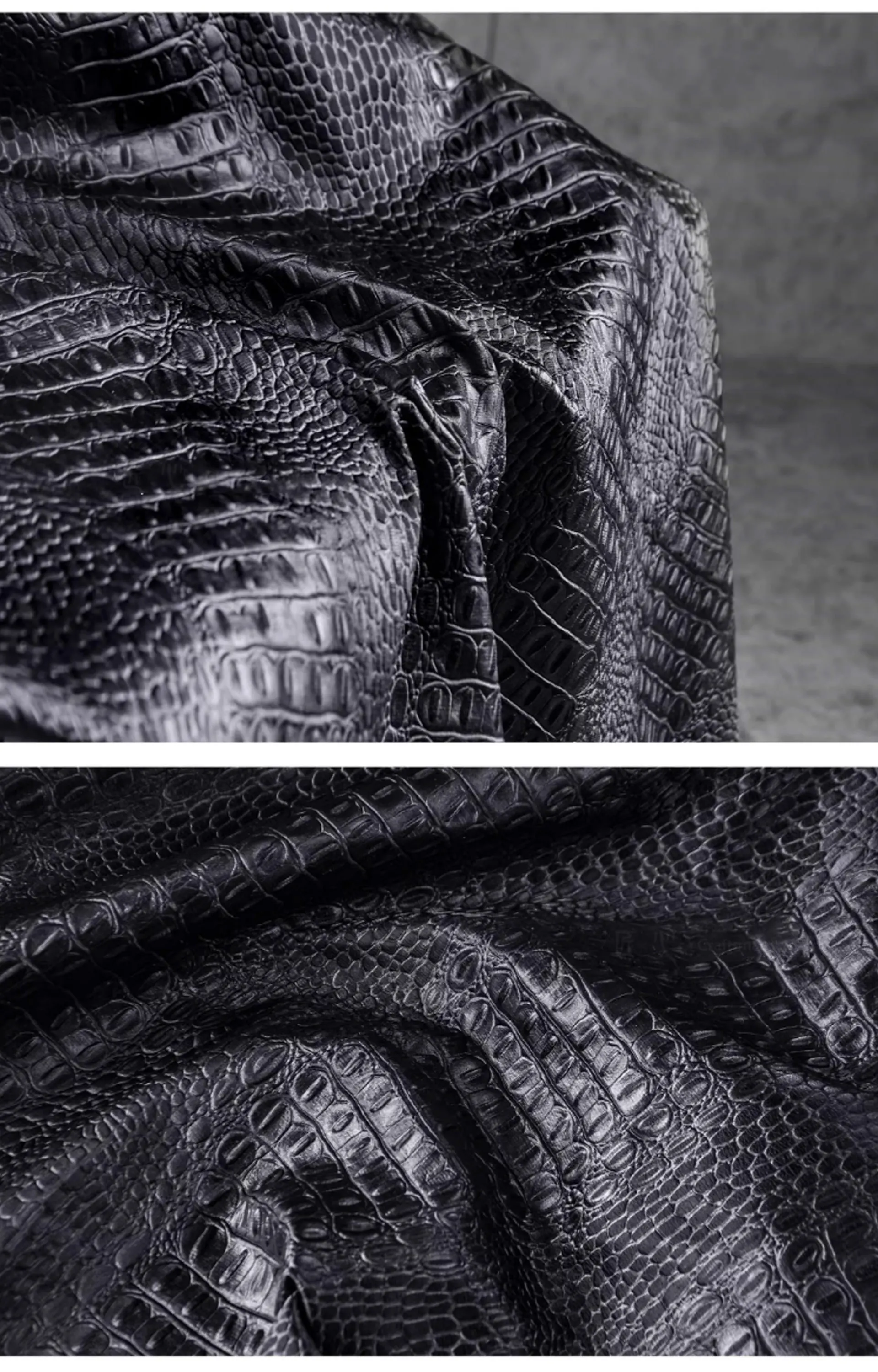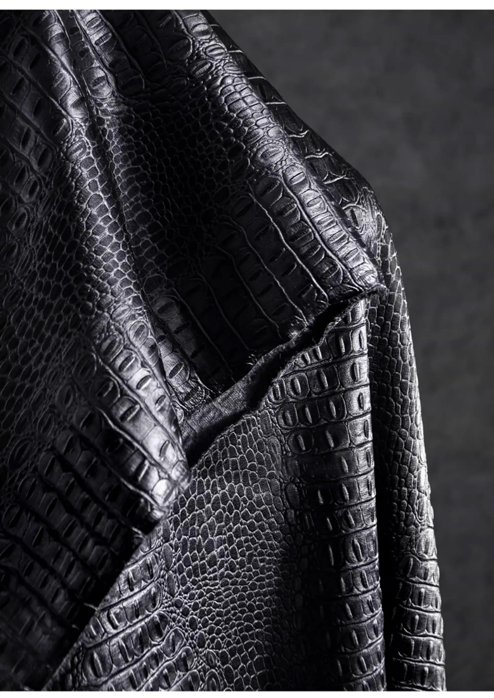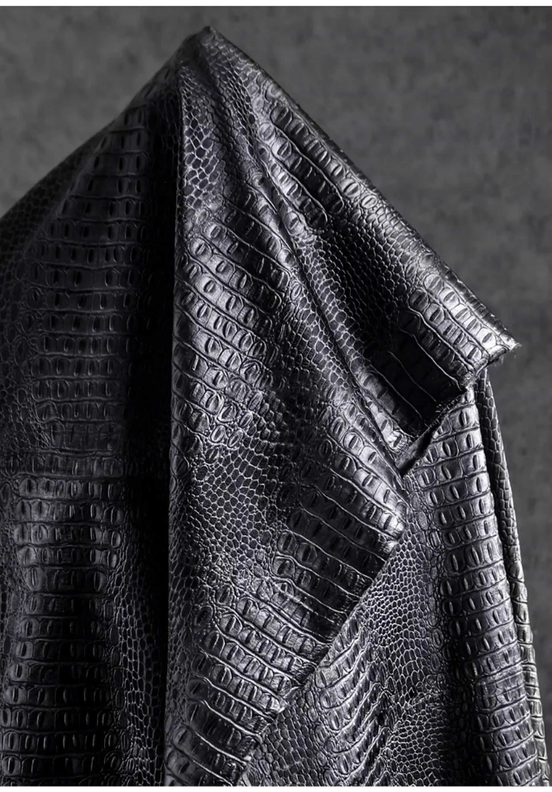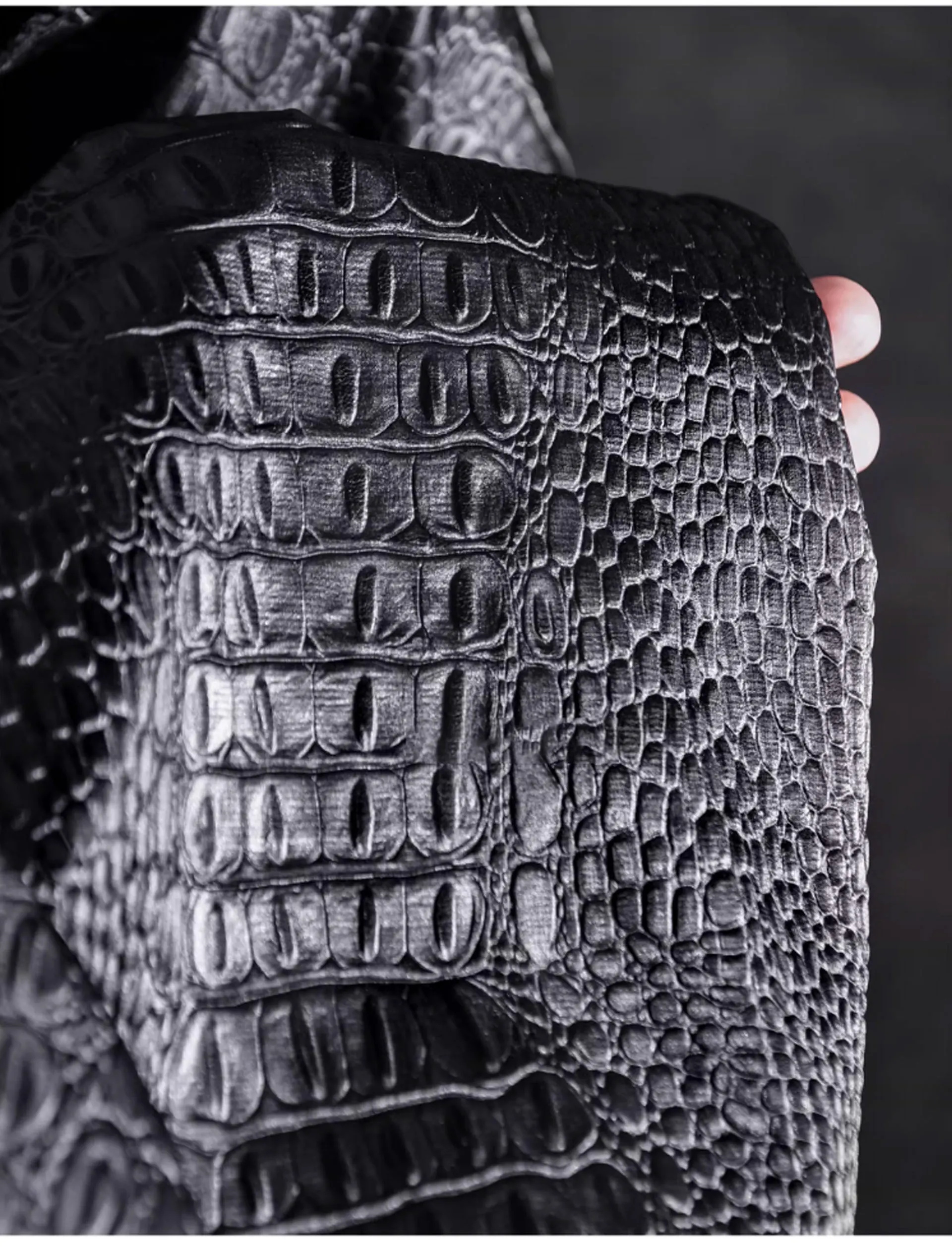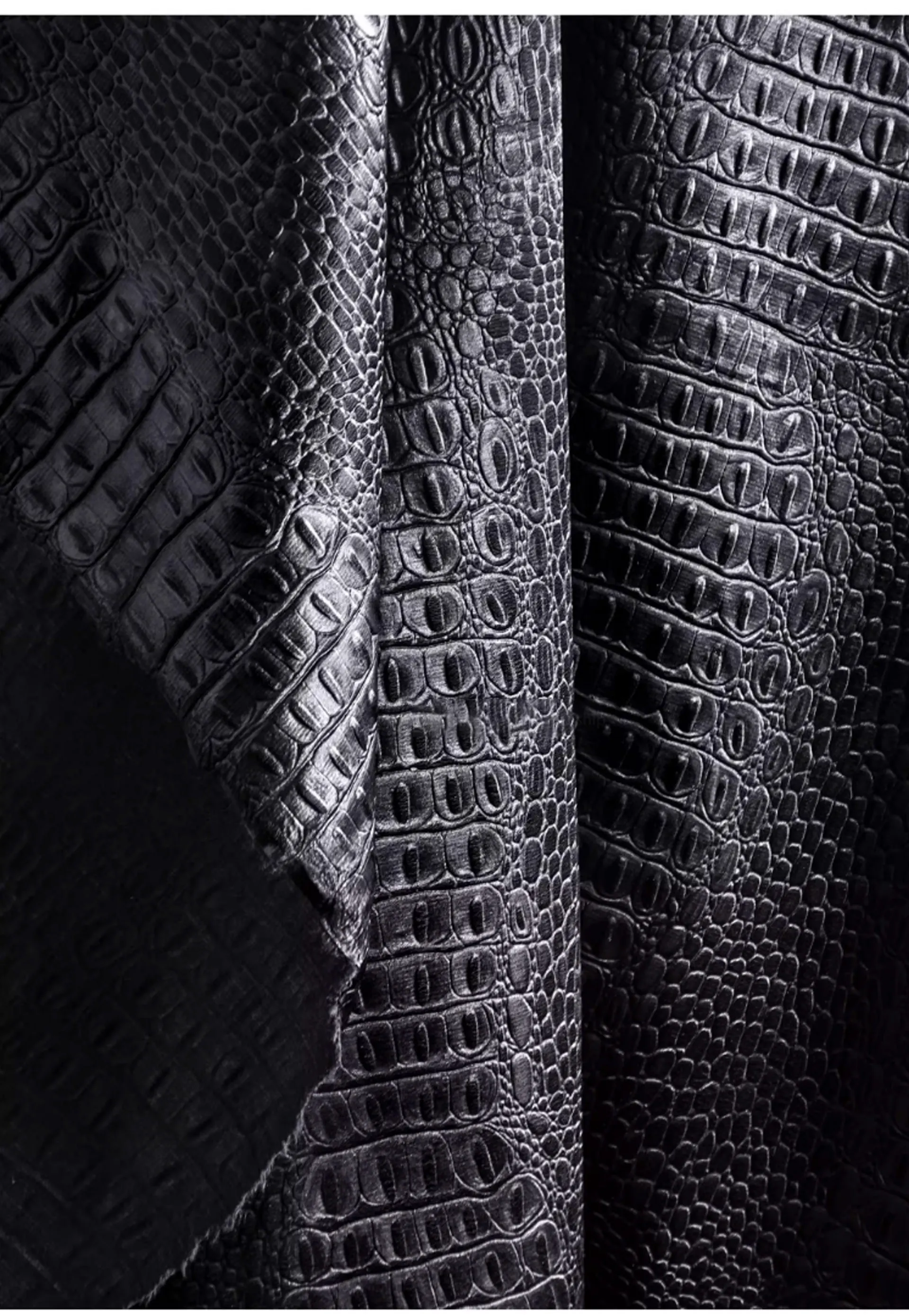 🖤 What it is - Luxurious black fabric featuring a three-dimensional crocodile texture, perfect for crafting leather coats, bags, and more.
