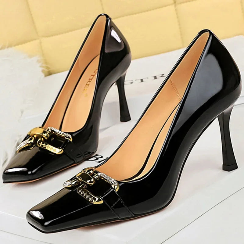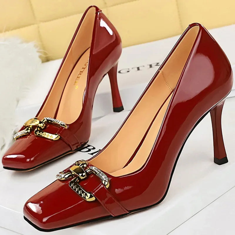 Luxury Designer Wedding Heels - 8.5cm High, Square Toe, Metal Chain - Nude/Burgundy