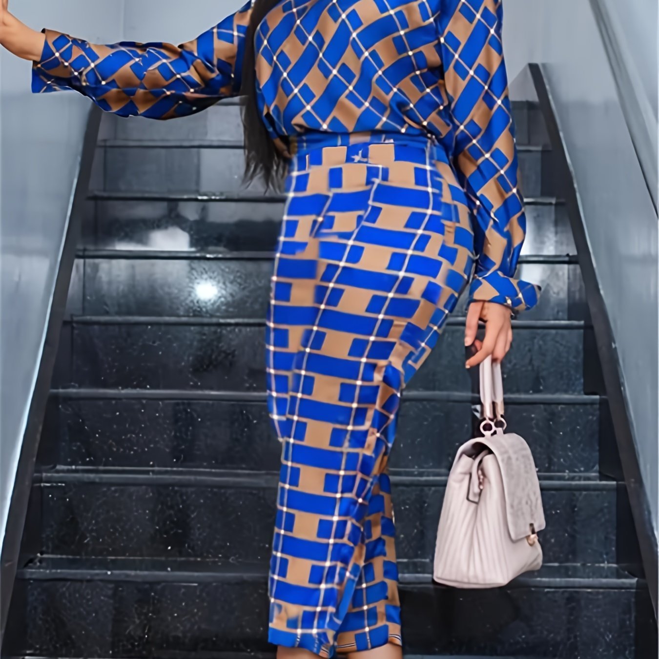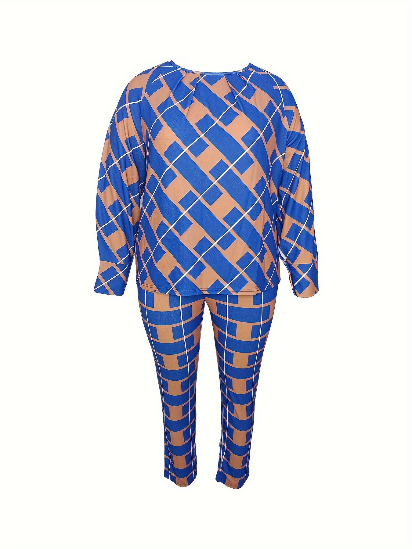 Plus Size Casual Outfits Set, Women's Plus Geometric Print Long Sleeve Round Neck Top & Pants Outfits 2 Piece Set