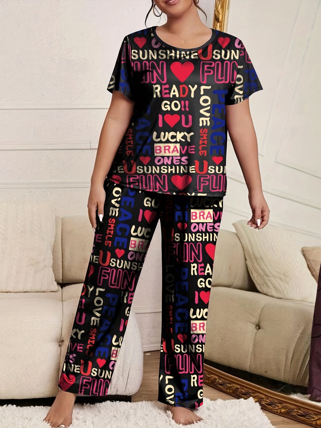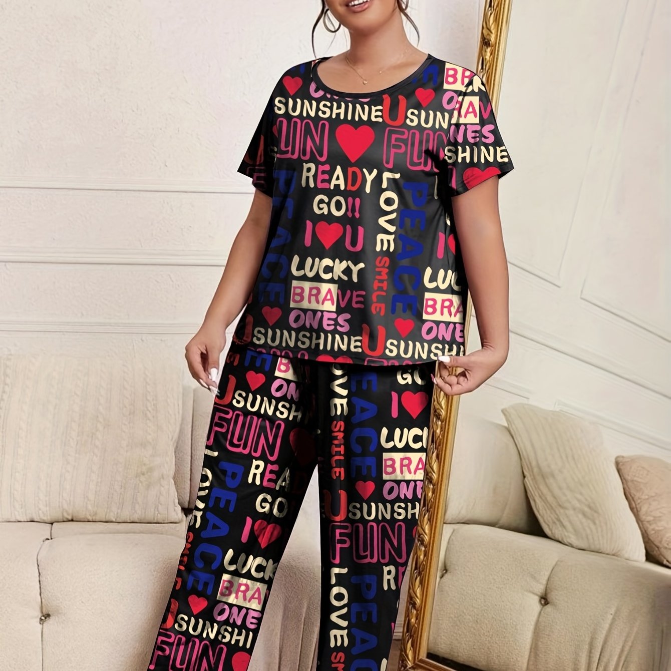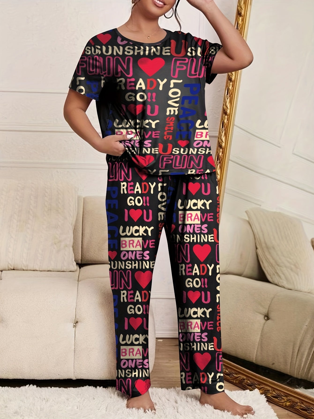 Plus Size Casual Pajama Set, Women's Plus Heart & Letter Print Short Sleeve Round Neck T-shirt & Pants Comfort Pajama Two Piece Set
