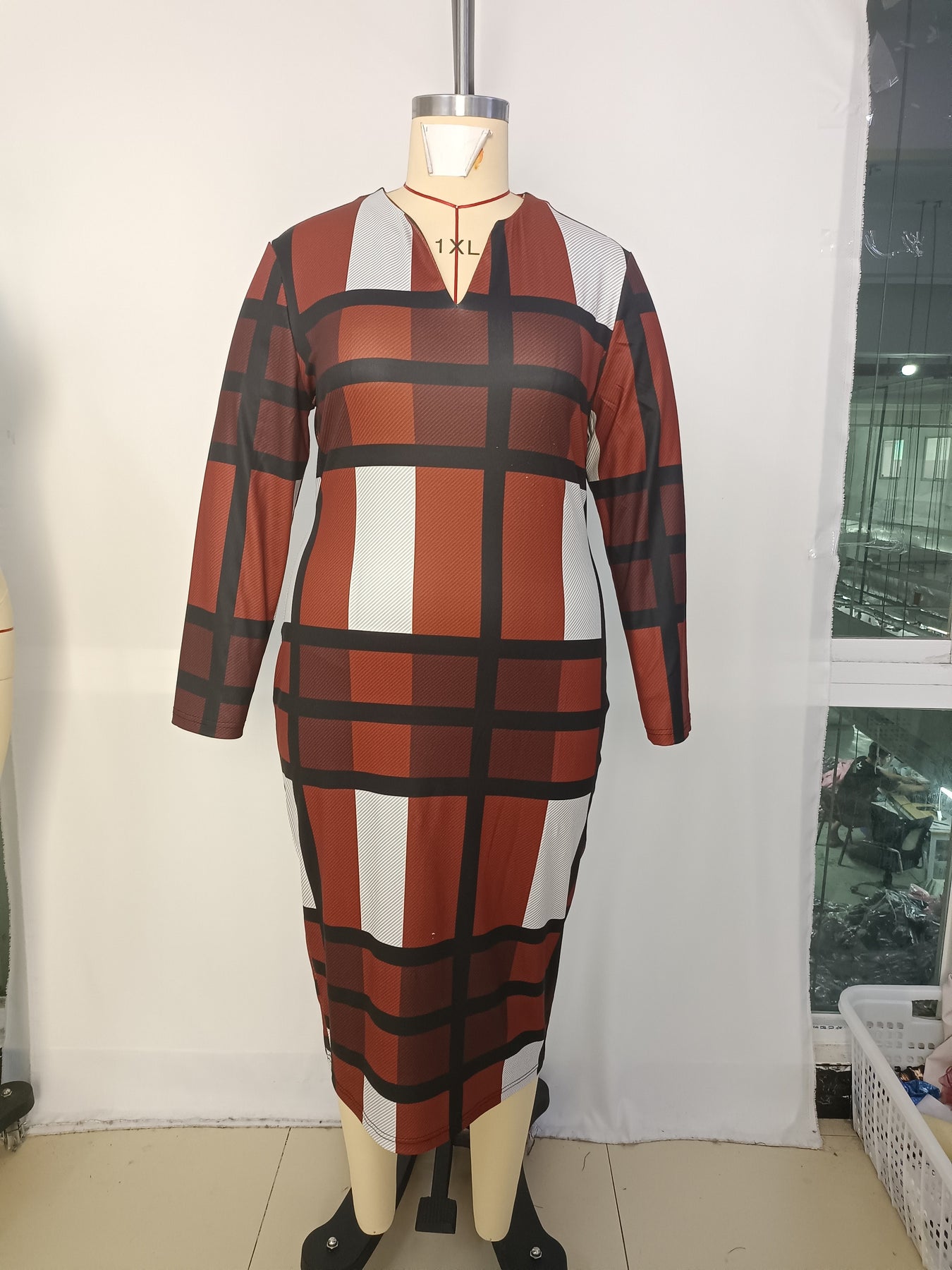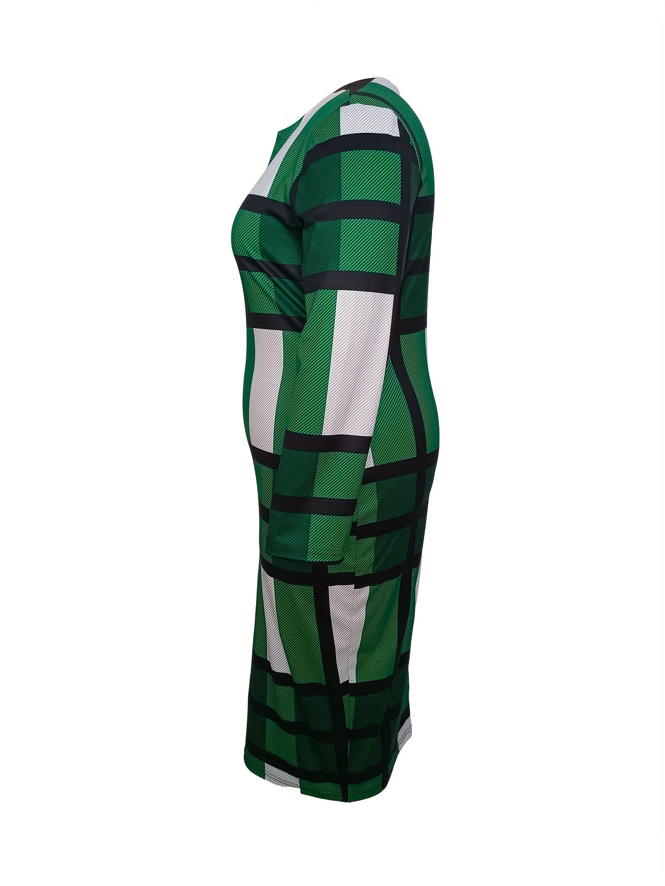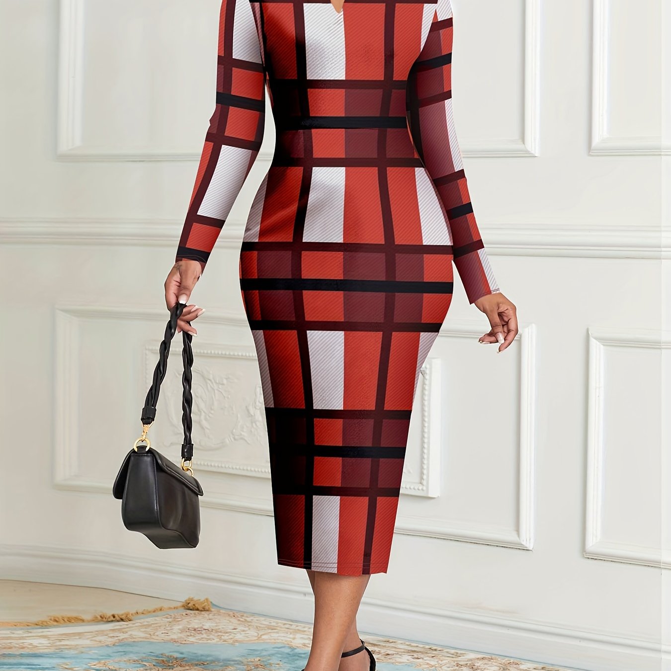 Plus Size Elegant Dress, Women's Plus Plaid Print Long Sleeve Notched Neck Bodycon Midi Dress