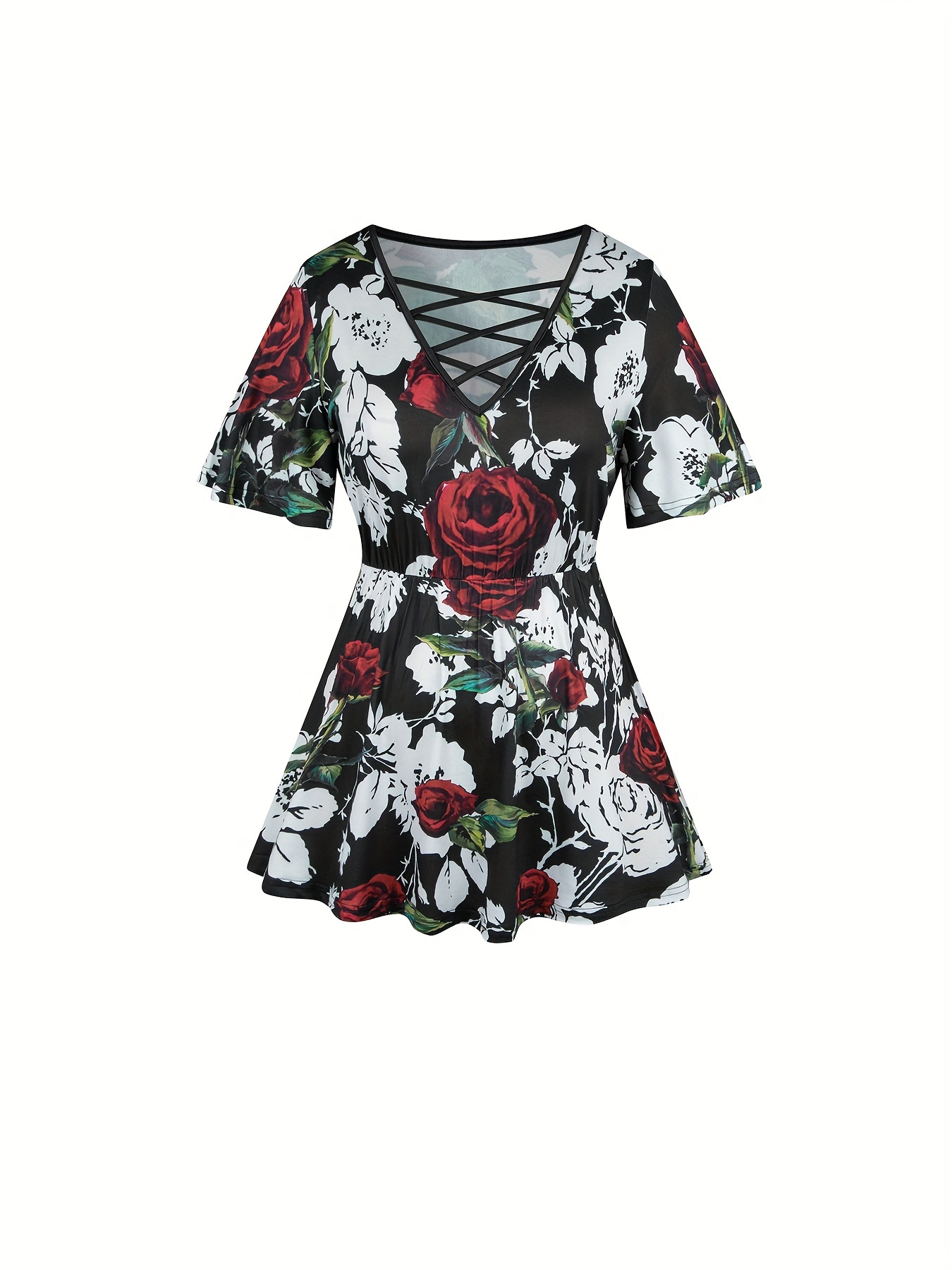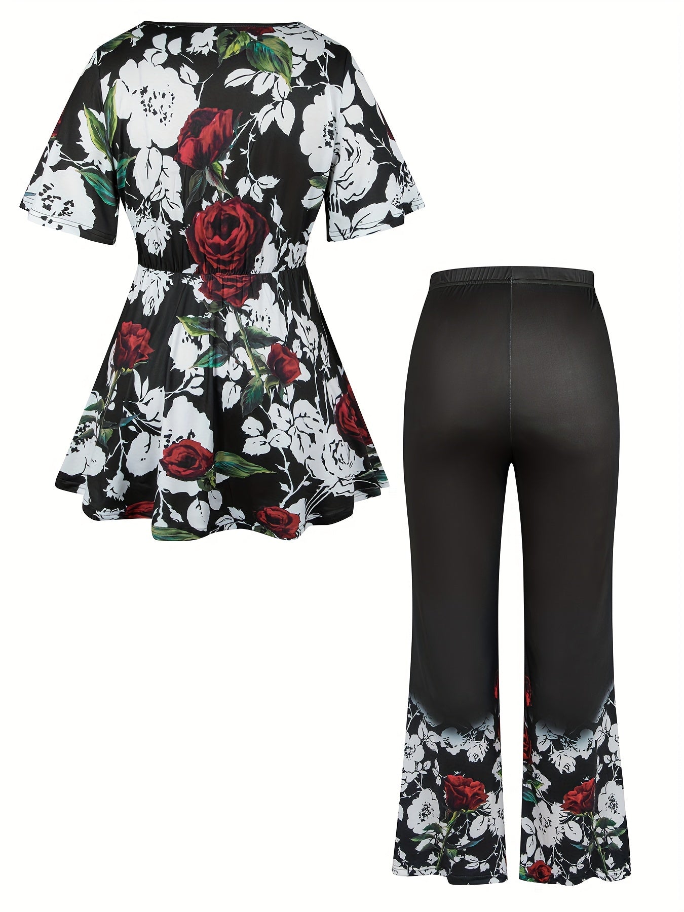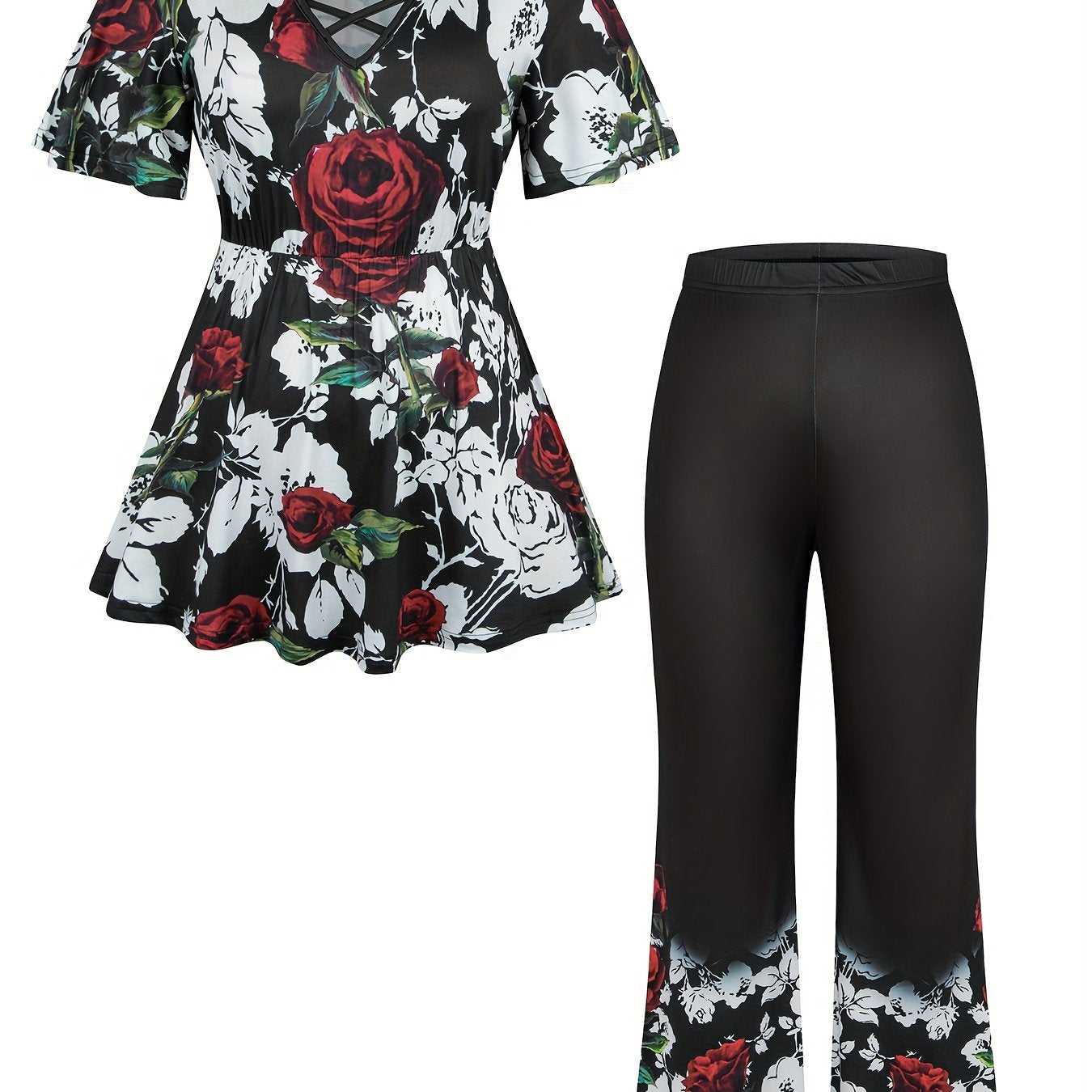 Plus Size Floral Print Two-piece Set, Cross Front Short Sleeve Top & Wide Leg Pants Outfits, Women's Plus Size Clothing
