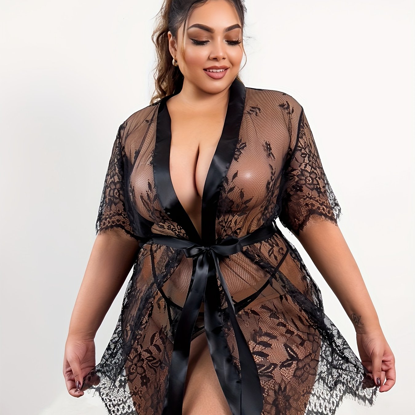 Plus Size Sexy Lingerie Robe Set, Women's Plus Eyelash Lace Satin Trim Open Front Belted Robe & Thong Lingerie 2 Piece Set
