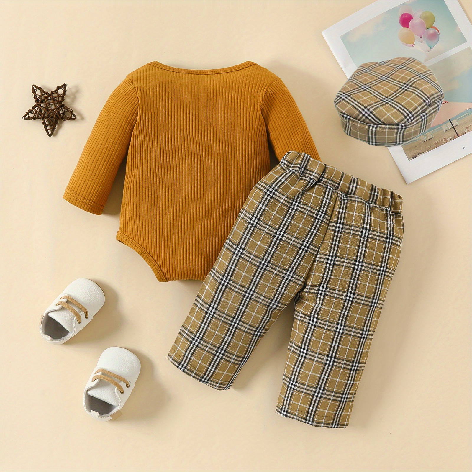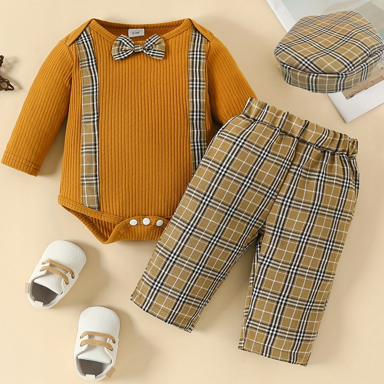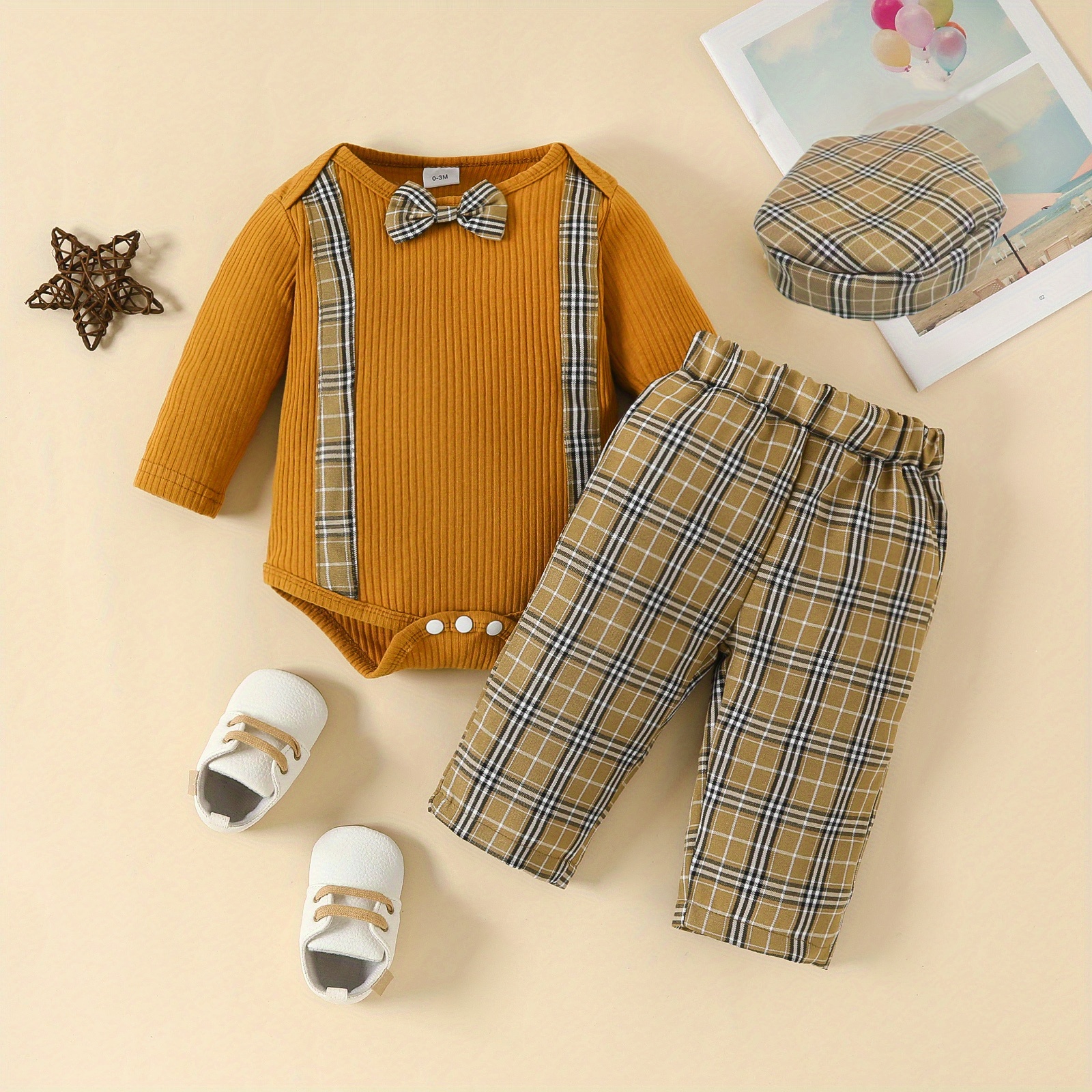 Popular Gentleman Style Striped Fake Strap Long Sleeve Romper + Plaid Trousers + Small Top Hat Baby Boys 3pcs Set