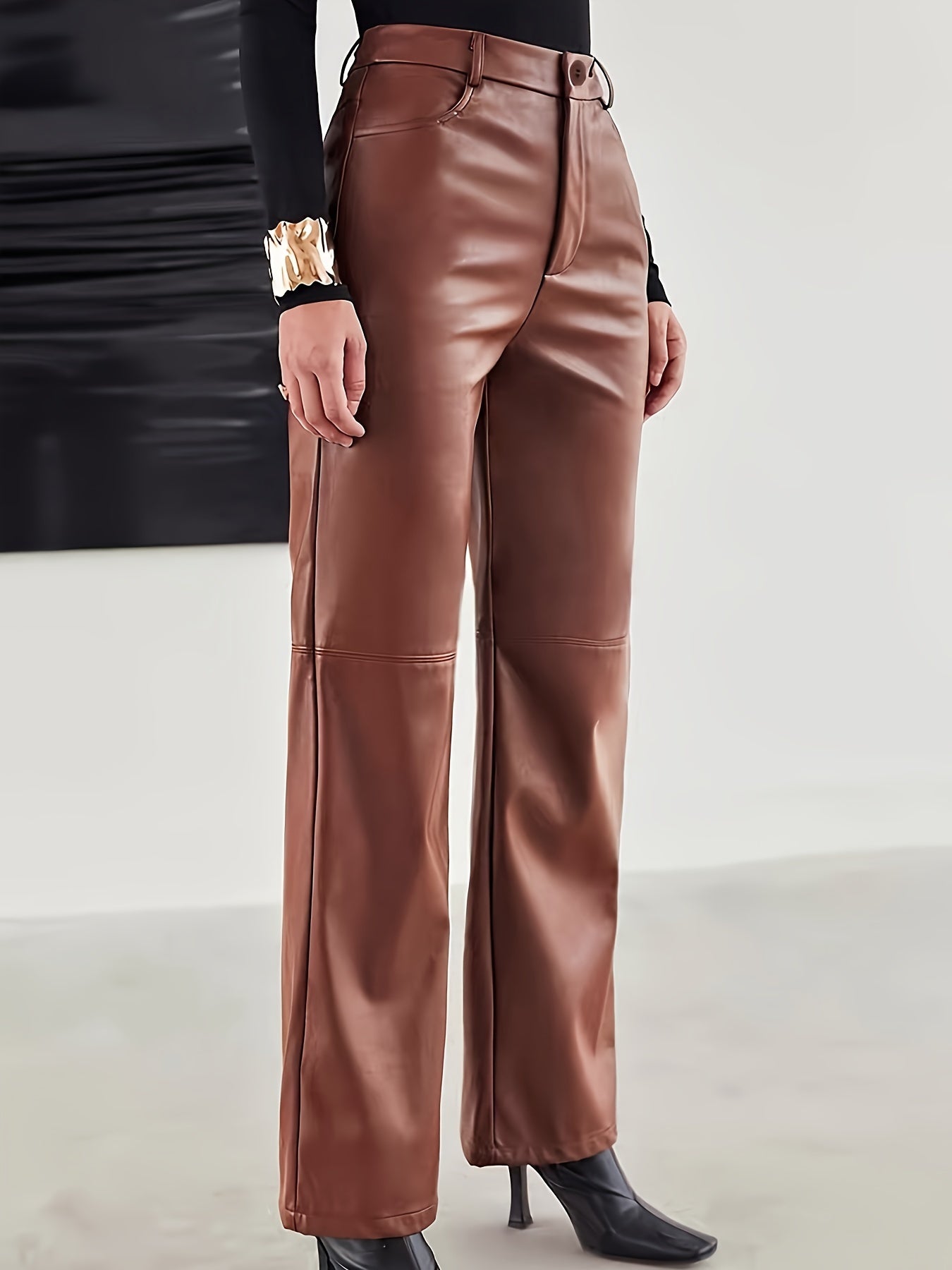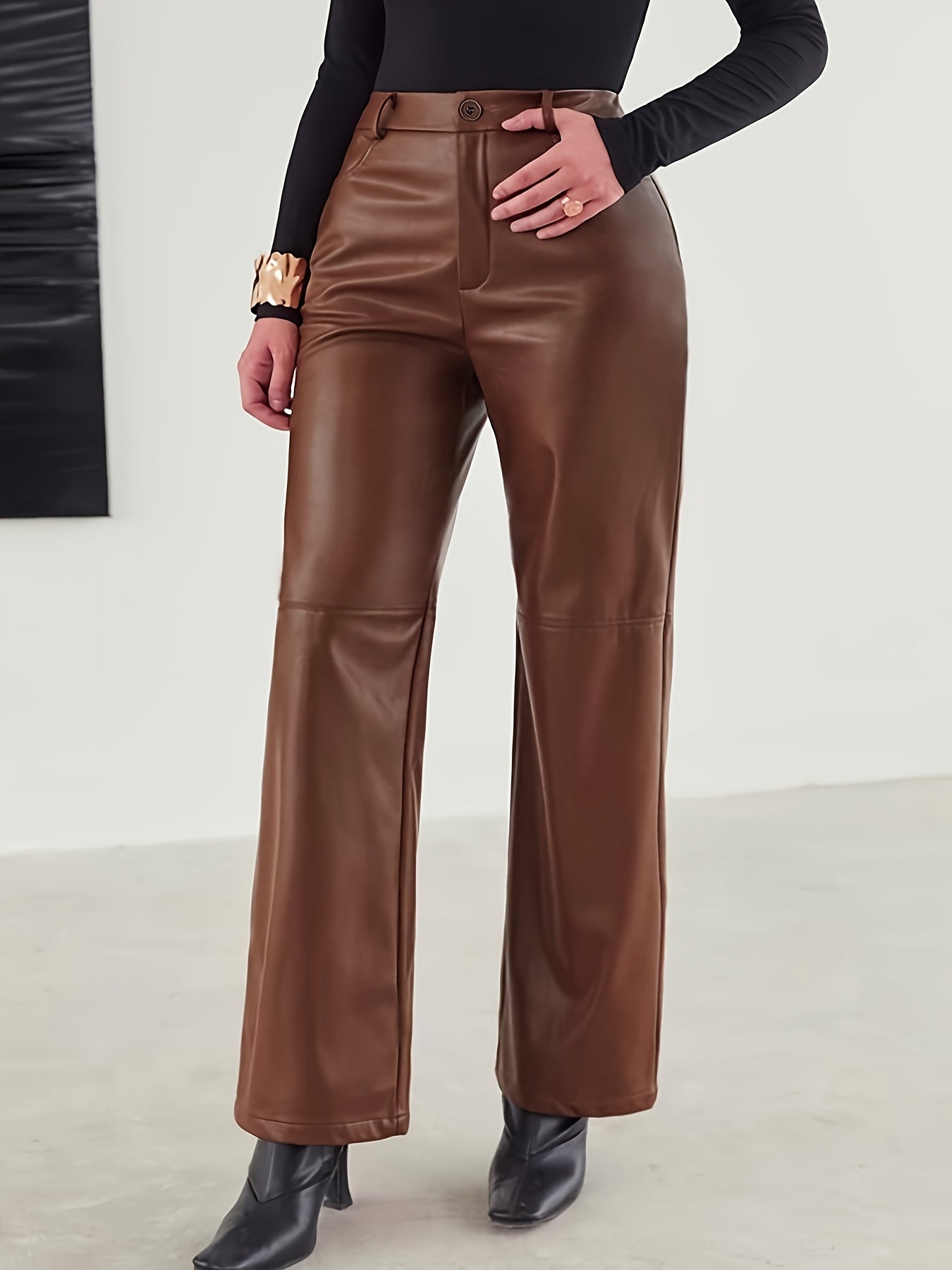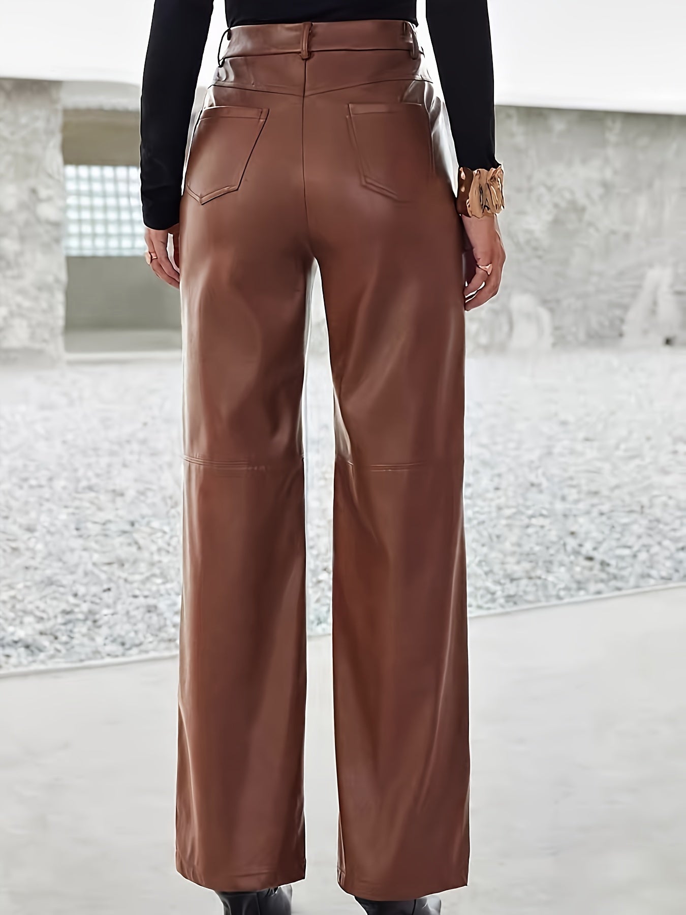 PU Leather Straight Leg Pants, Casual Pocket High Waist Pants, Women's Clothing
