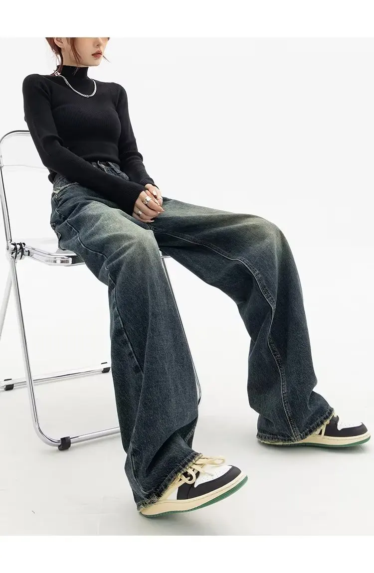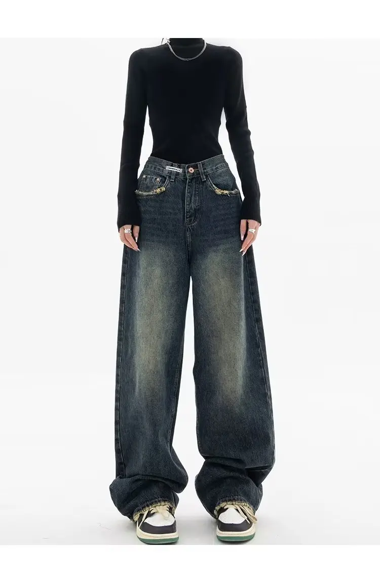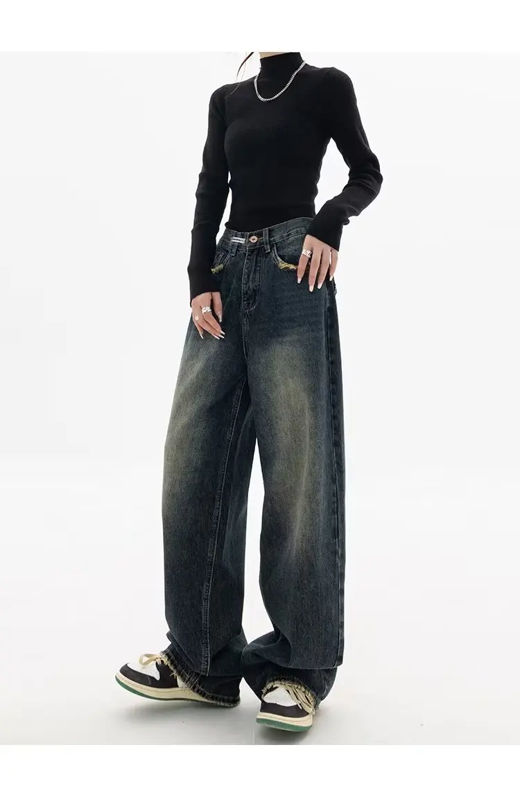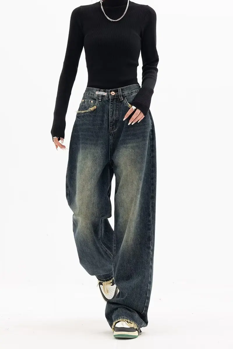 Retro Korean Baggy Jeans - High Waisted Straight Leg Denim Pants