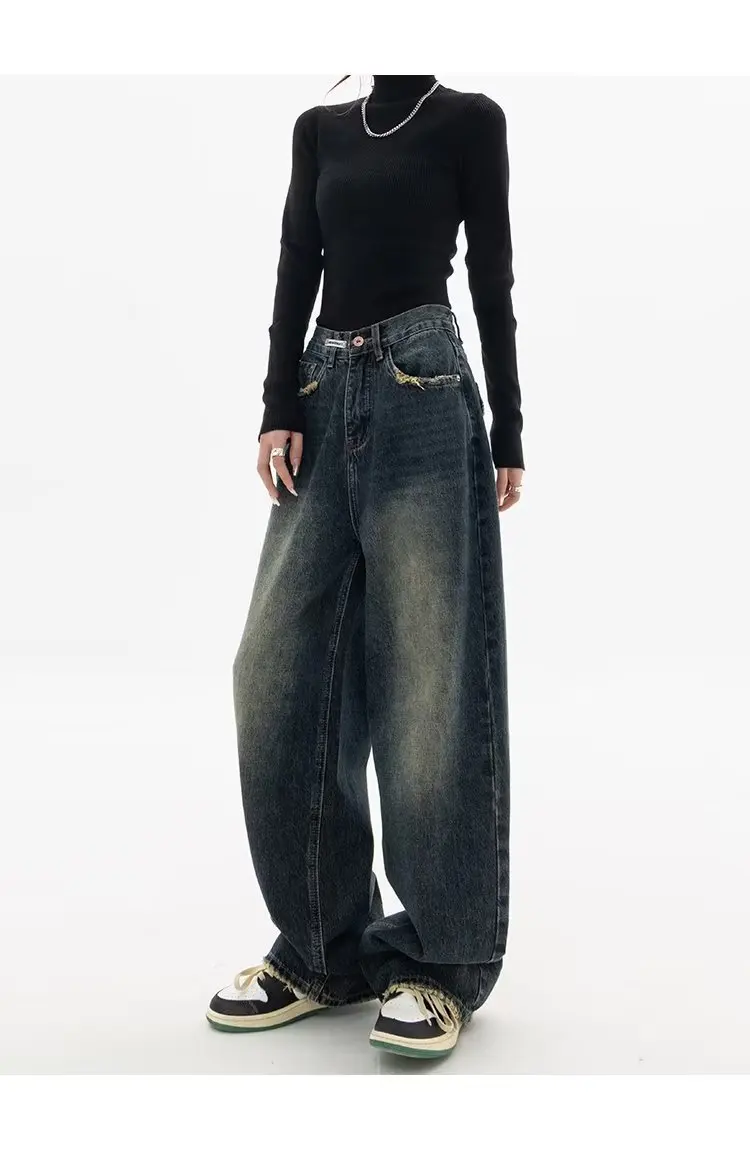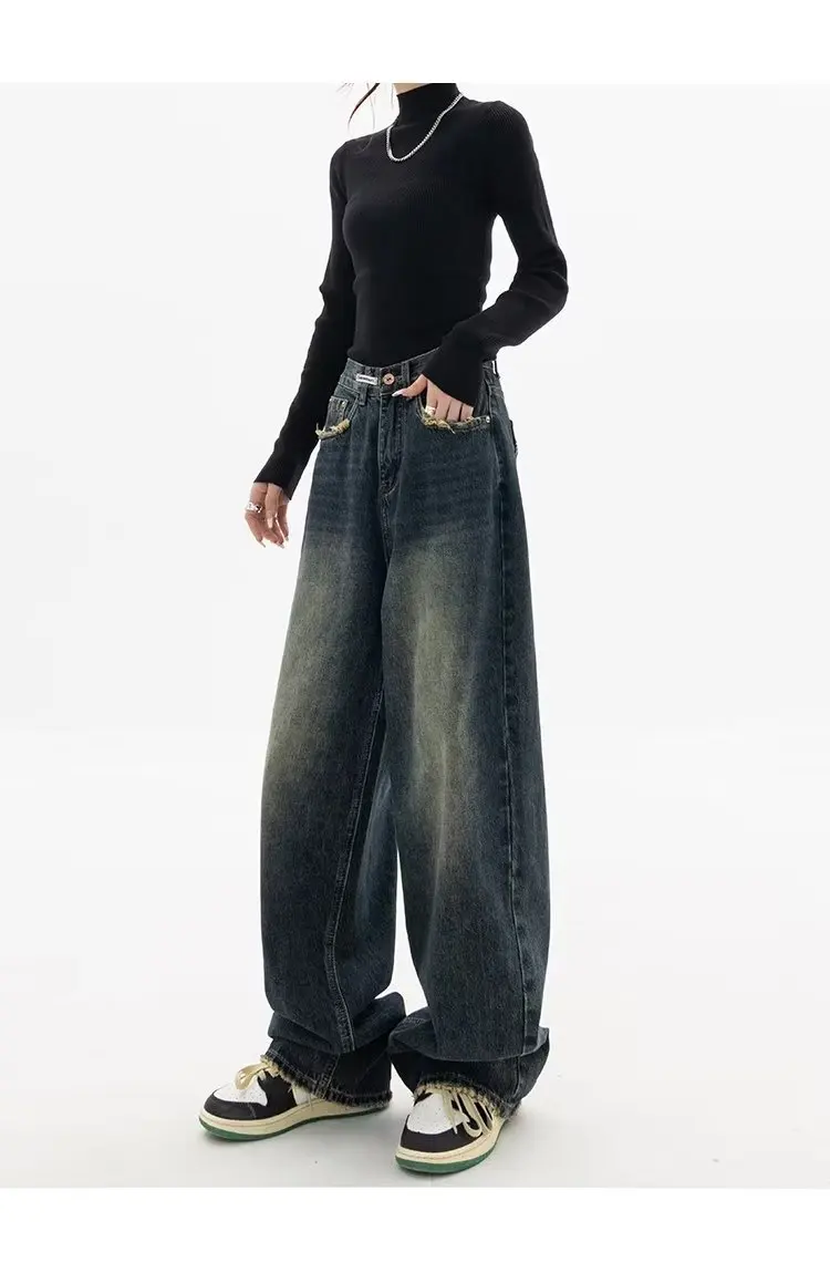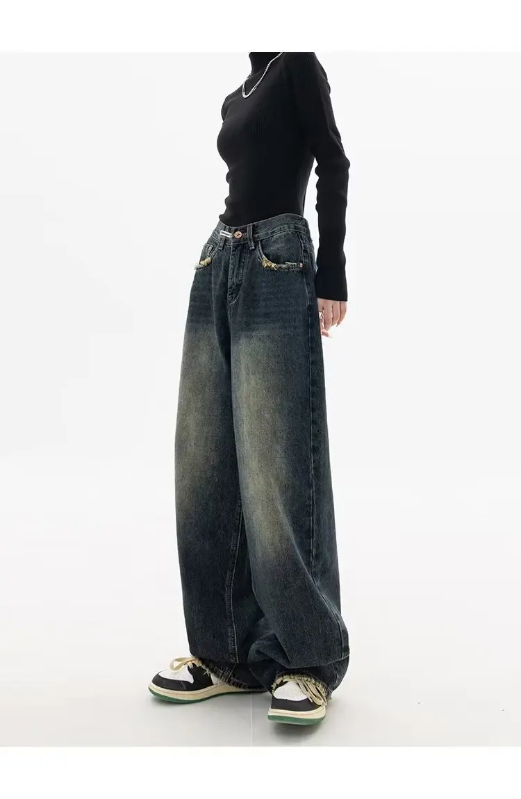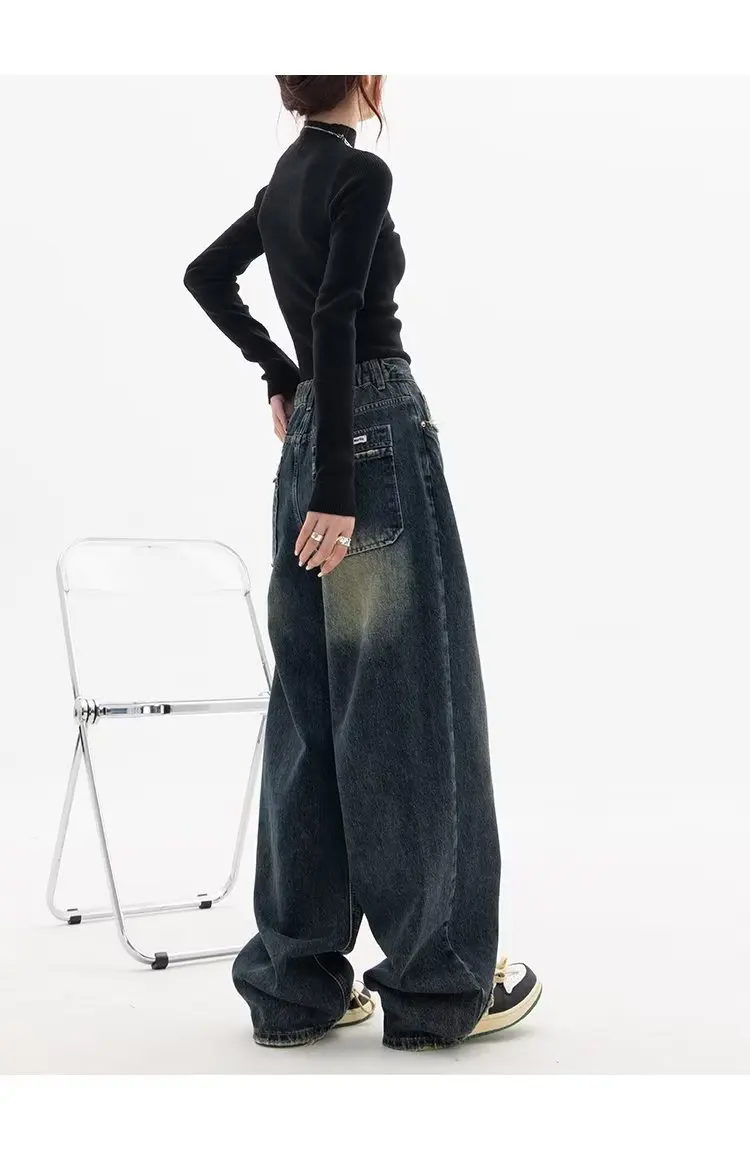 Retro Korean Baggy Jeans - High Waisted Straight Leg Denim Pants
