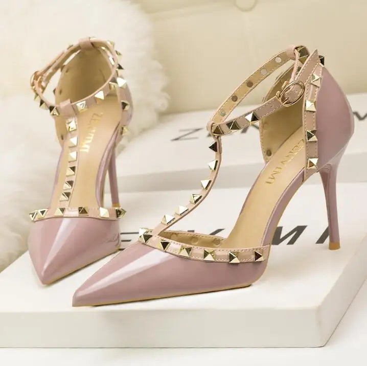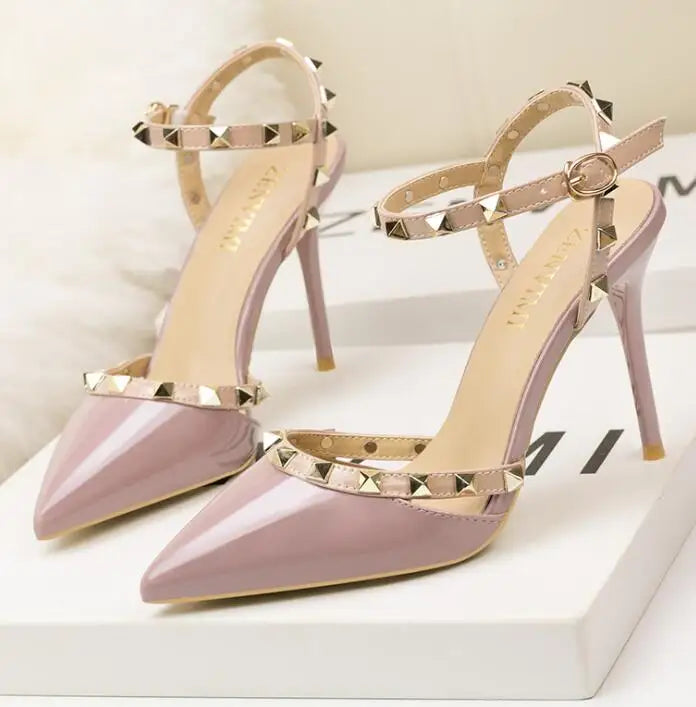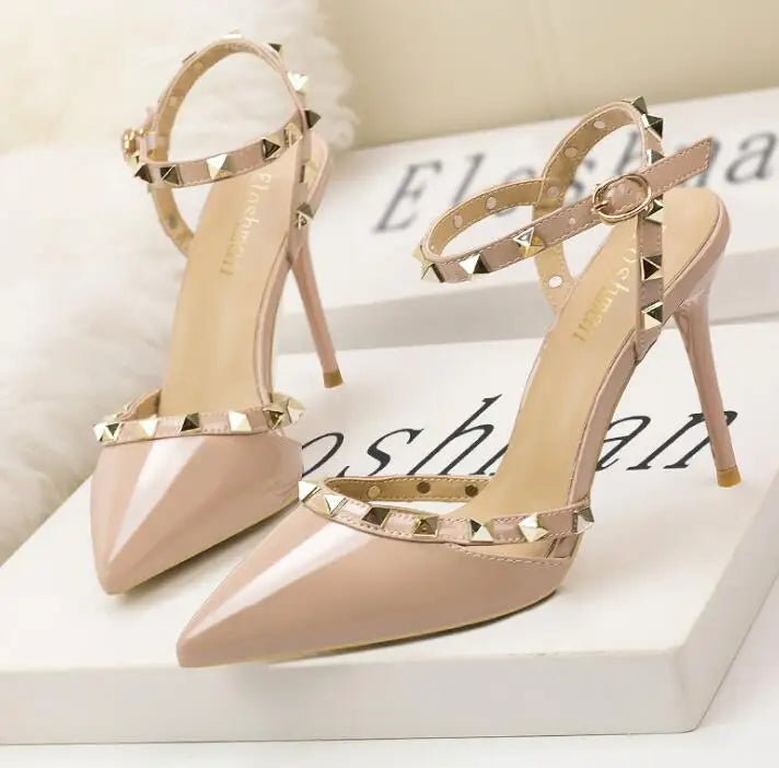 Introducing our must-have Women's Roman Fashion Rivet Sandals! These stunning pumps feature a 10CM stiletto heel and a sleek patent-leather metallic finish, perfect for adding a touch of glamour to any outfit. The waterproof platform and single layer PU material provide both style and comfort. The popular European and American style, combined with the sexy nightclub and slim Roman elements, make these sandals a standout choice. Don't miss out on our limited time offer for these premium and exclusive sandals that are sure to be a best seller. Upgrade your shoe game with our ZWM-9616-56ZWM-6289-29268-286289-5 sandals.