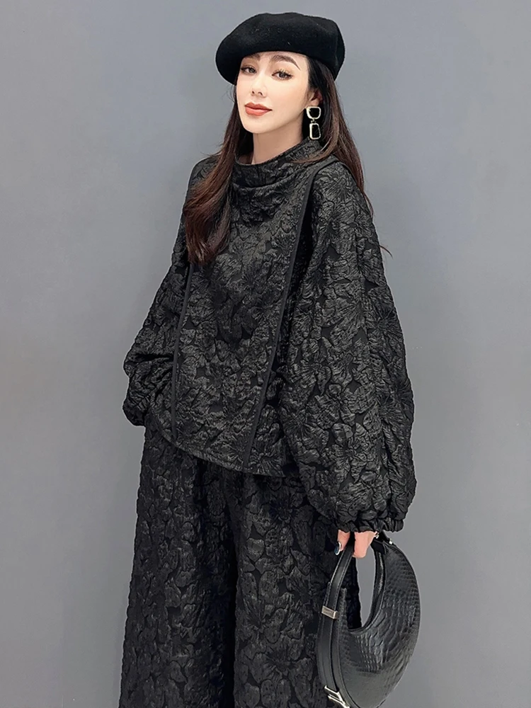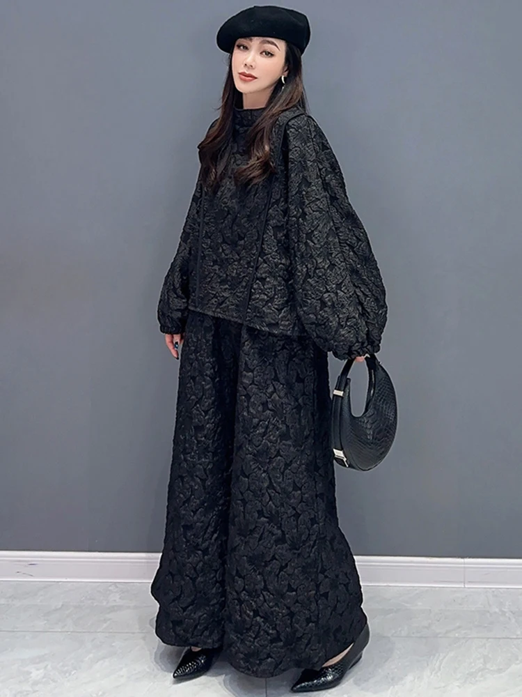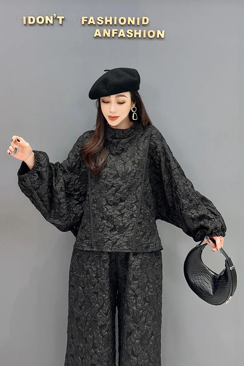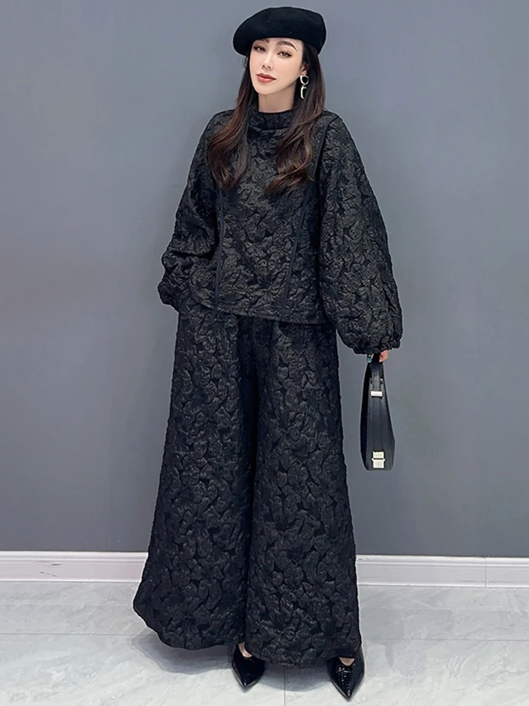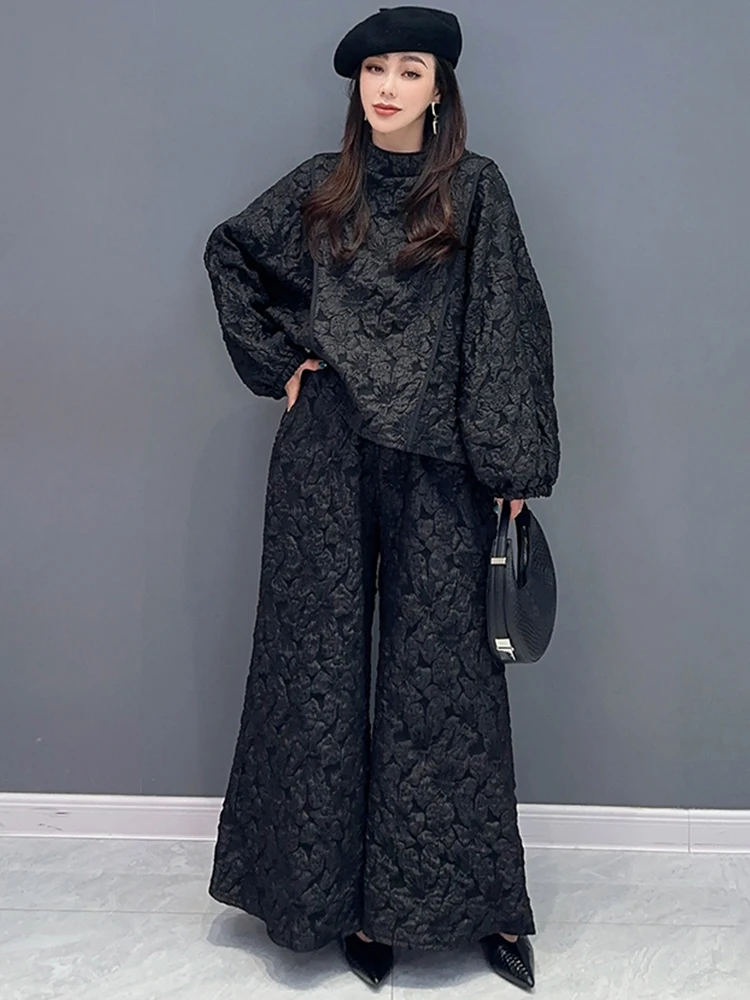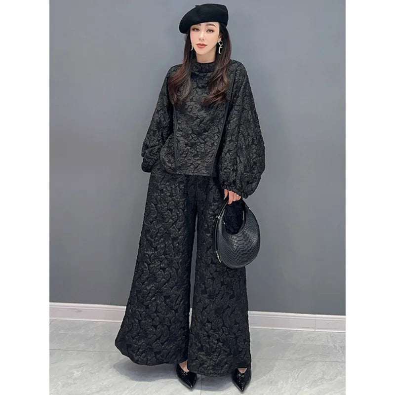 SHENGPALAE Fashion Women's Jacquard 2 Piece Set Casual Full Sleeve Patchwork Pullover Tops Spring 2024 New Wide Leg Pants 5R8783