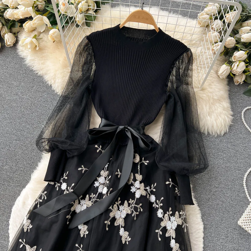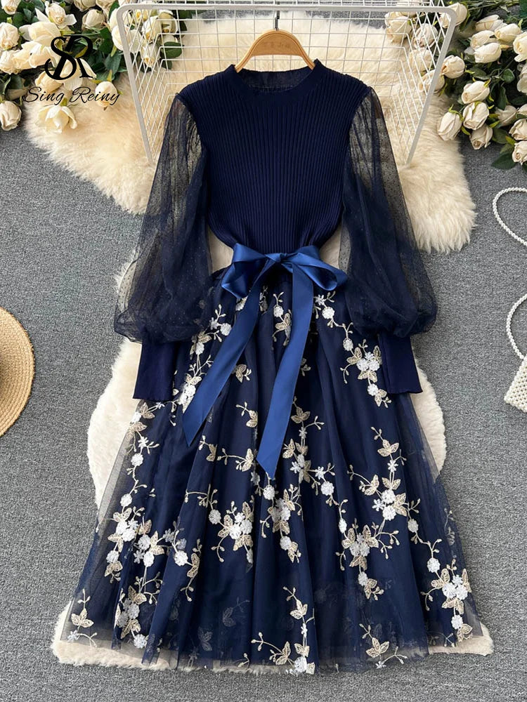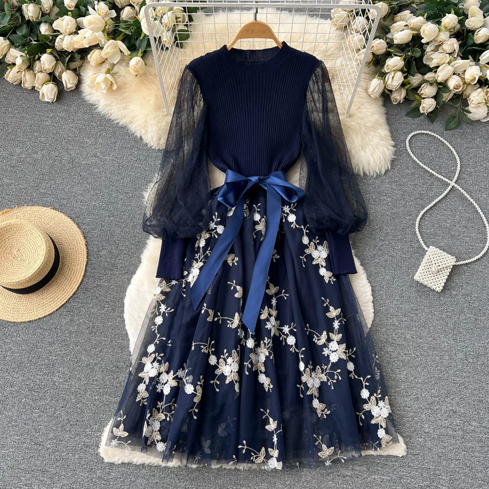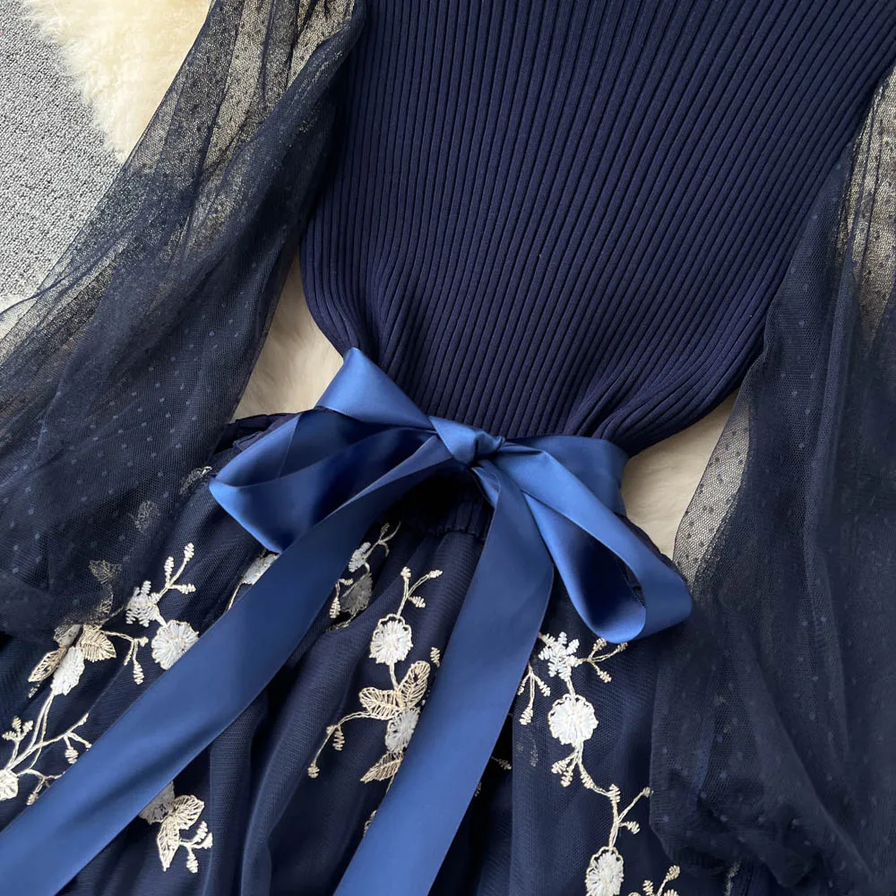 🌼 What it is - Embrace the essence of spring in our Spring Floral Knitted Long Dress featuring long sleeves, a bow design, A-line silhouette, patchwork details, and delicate mesh embroidery.