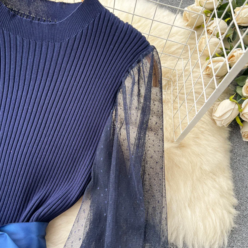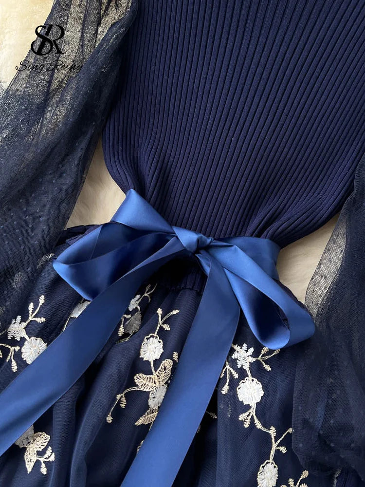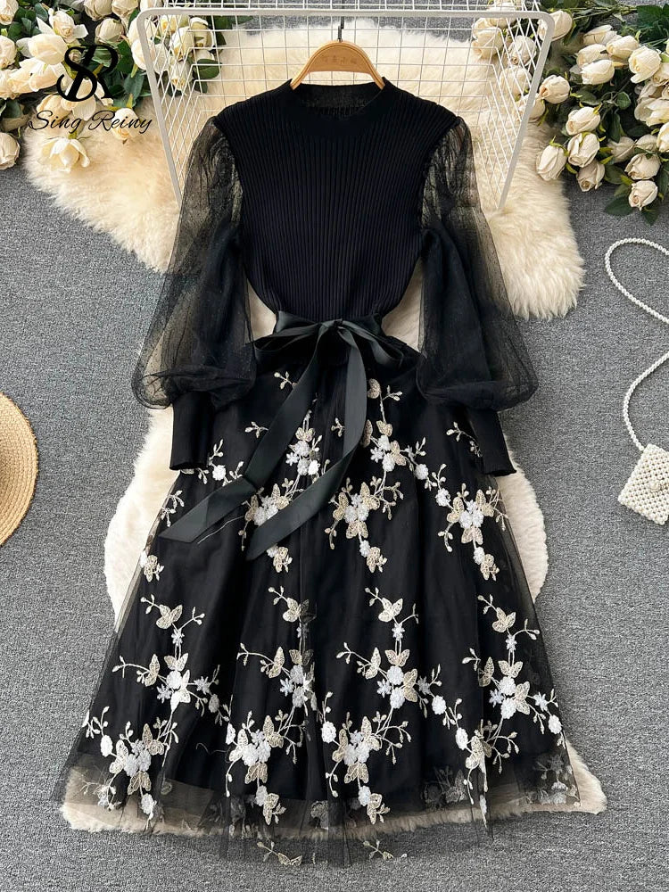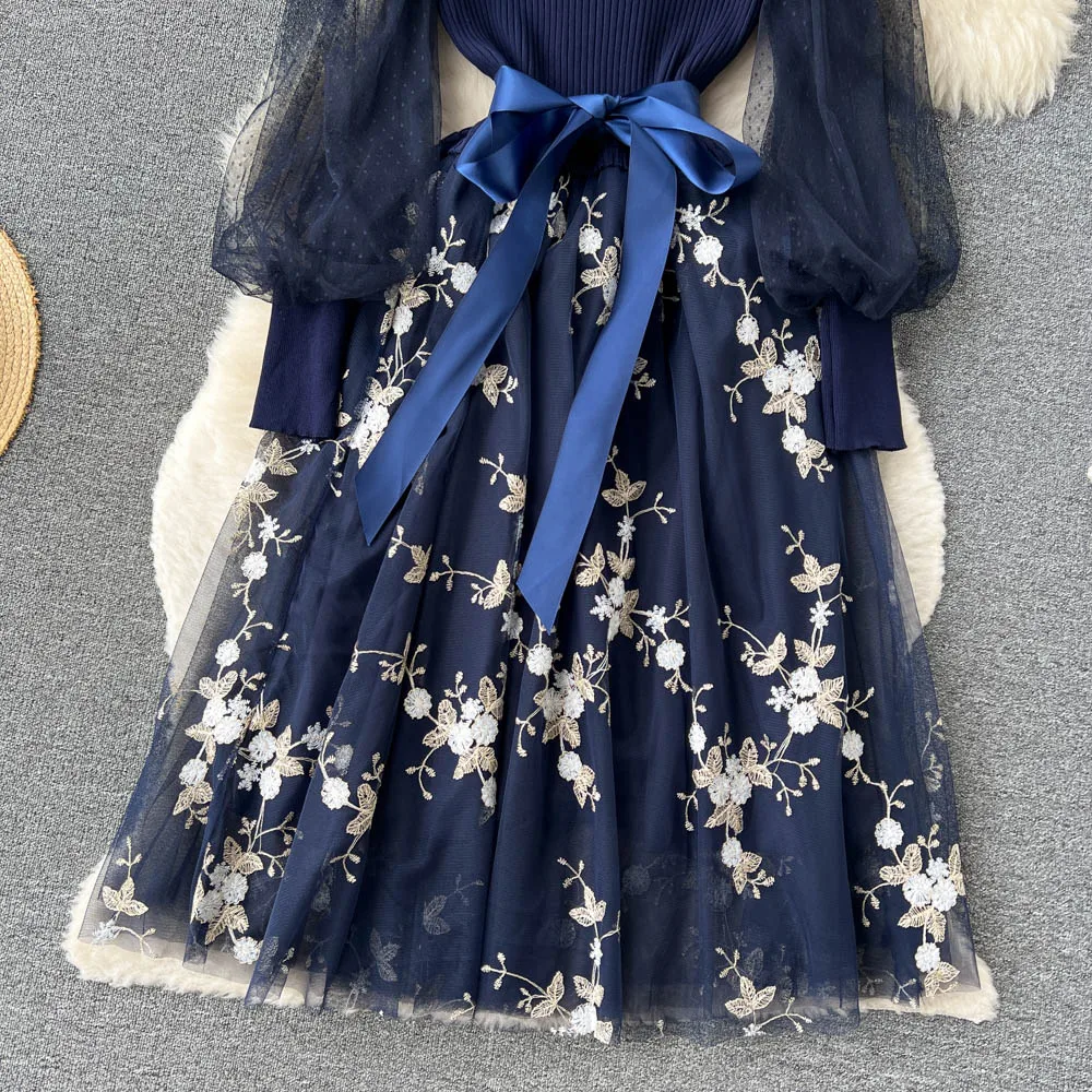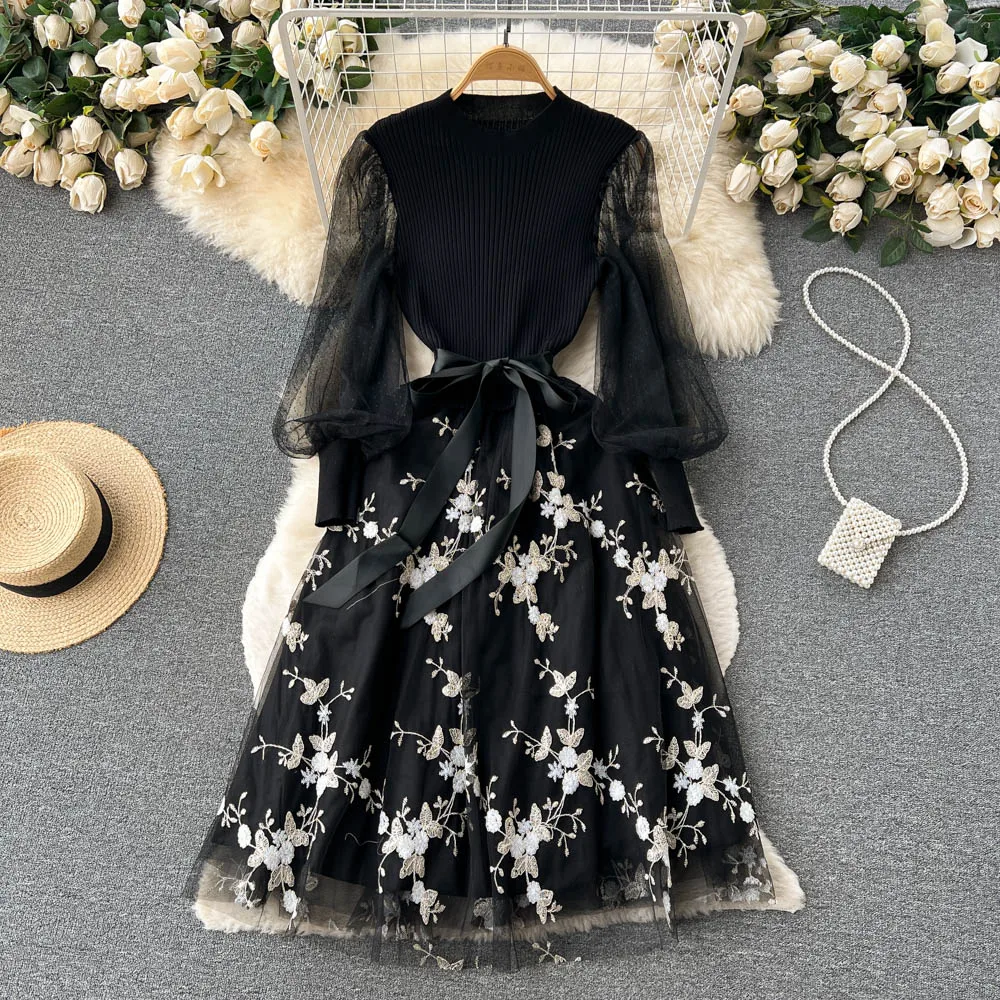 🌼 What it is - Embrace the essence of spring in our Spring Floral Knitted Long Dress featuring long sleeves, a bow design, A-line silhouette, patchwork details, and delicate mesh embroidery.