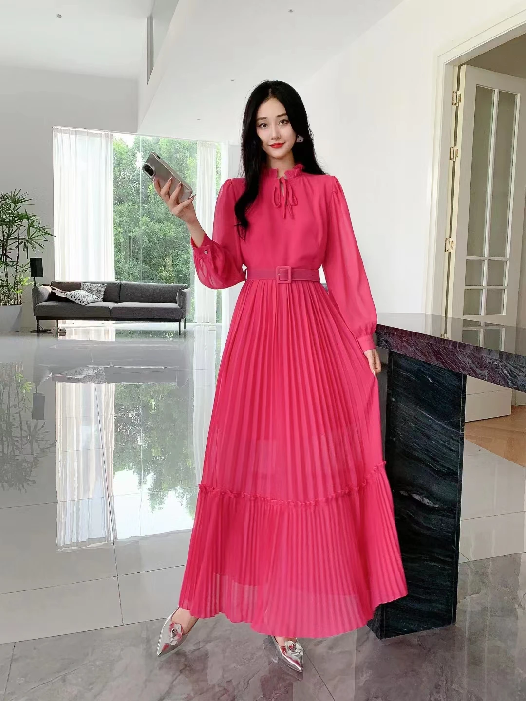 🌺 What it is - Elevate your style with this stunning dress featuring a ruffled neckline, long sleeves, and a pleated big hem in a solid color chiffon fabric.