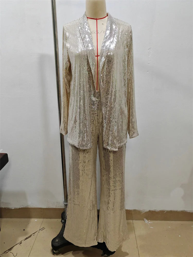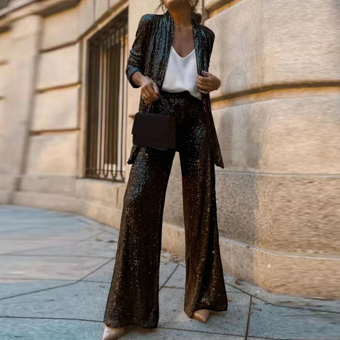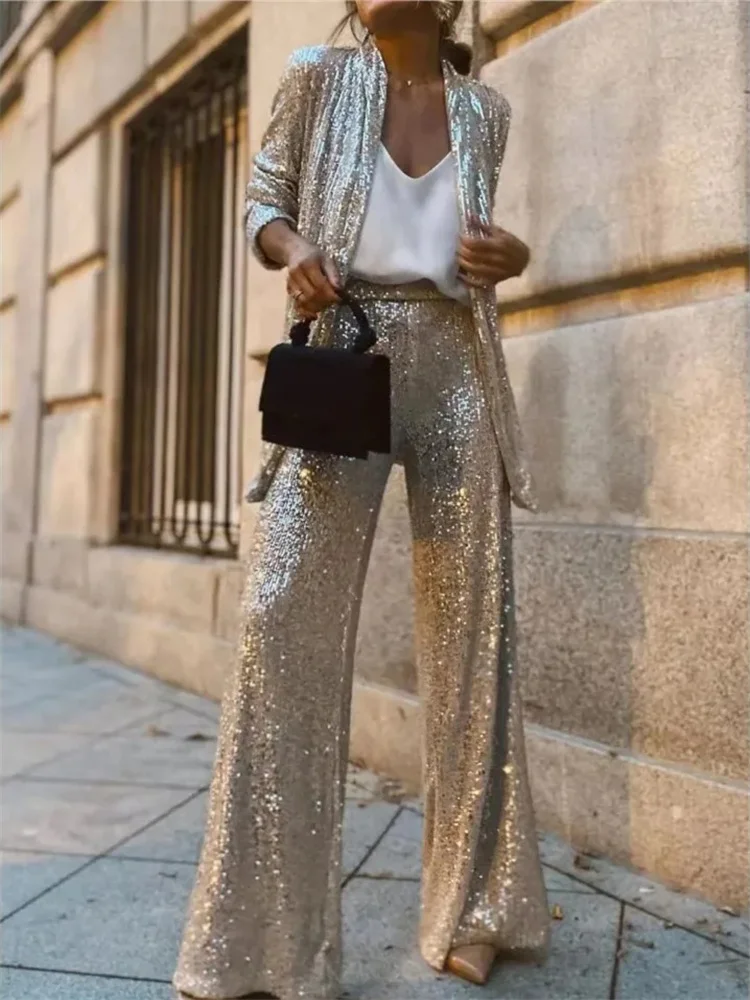 Introducing our Tossy Sequin Fashion 2 Piece-Set, the perfect outfit for any fashion-forward woman. This set includes a stunning glitter patchwork suit outwear and slim-fit straight leg pants, creating a stylish and flattering silhouette. Available in sizes S-XL, our set is designed to fit and flatter all body types. Made with premium materials, this set is both comfortable and durable, perfect for any occasion. With its eye-catching sequin design, our set is a must-have for any fashionista. Don't miss out on this limited time offer and add this exclusive set to your wardrobe today!