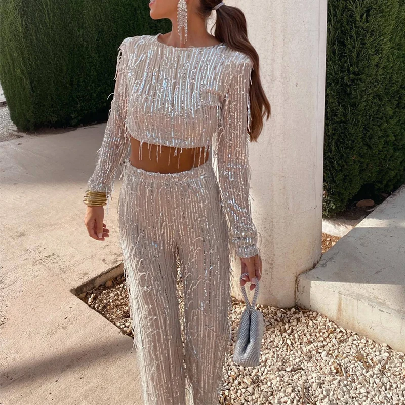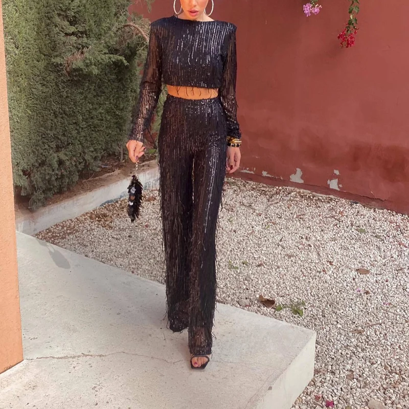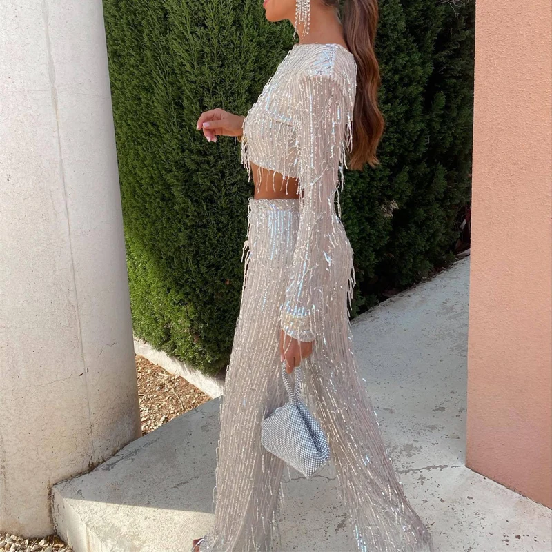 Introducing our new Women Glitter Outfits - the perfect choice for a glamorous and elegant look! Made with high-quality sequin material, this two-piece set features a slim fit design with a long sleeve blouse top and high waist pants. Available in a range of sizes, it offers a perfect fit for every body type. With its eye-catching glitter details, this outfit is perfect for special occasions, such as banquets and parties. Plus, it's versatile enough to be dressed up or down for any event. Don't miss out on this limited time offer and get yours today!