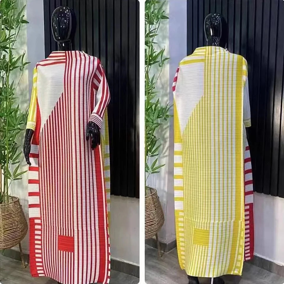 Introducing our newest addition to the Miyake fashion line - the Pleated Stripe Print Dress. This elegant and relaxed dress is perfect for any spring occasion, with its unique pleated design and eye-catching stripe print. It is the perfect blend of fashion and comfort, making it a must-have for any woman's wardrobe. Our dress solves the problem of finding a stylish and comfortable outfit for any party or event. Customers will gain confidence and sophistication in this premium, best-selling dress. Don't miss out on this exclusive and limited-time piece that is sure to be the perfect fit for any woman. Upgrade your wardrobe with our Miyake Pleated Stripe Print Dress today.