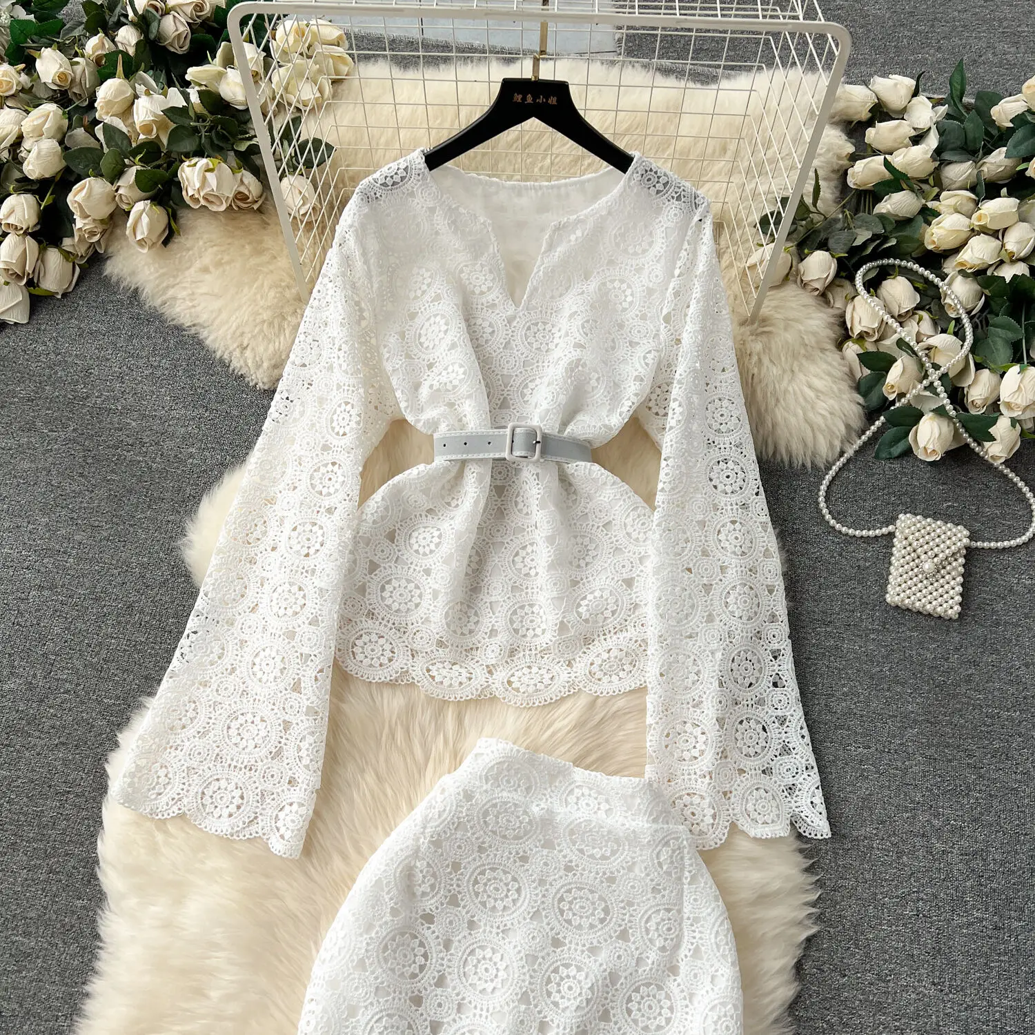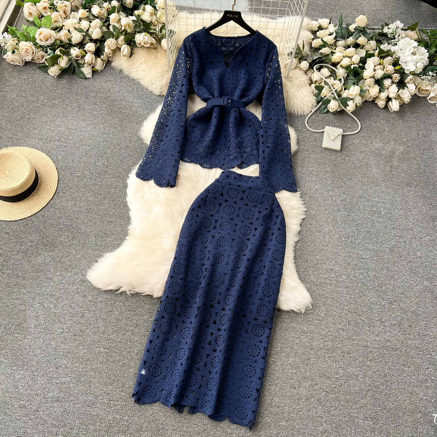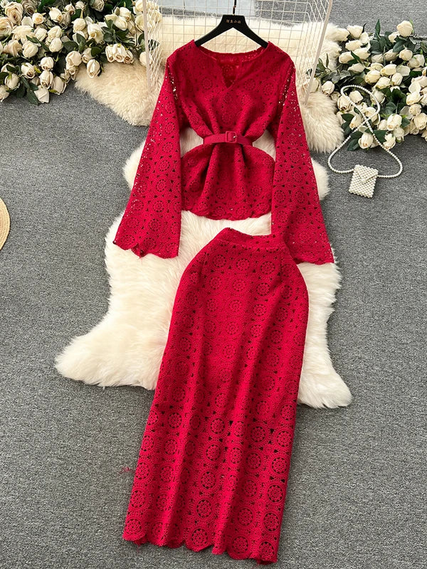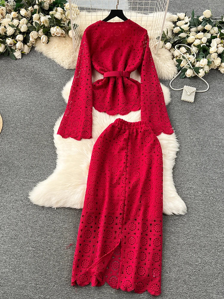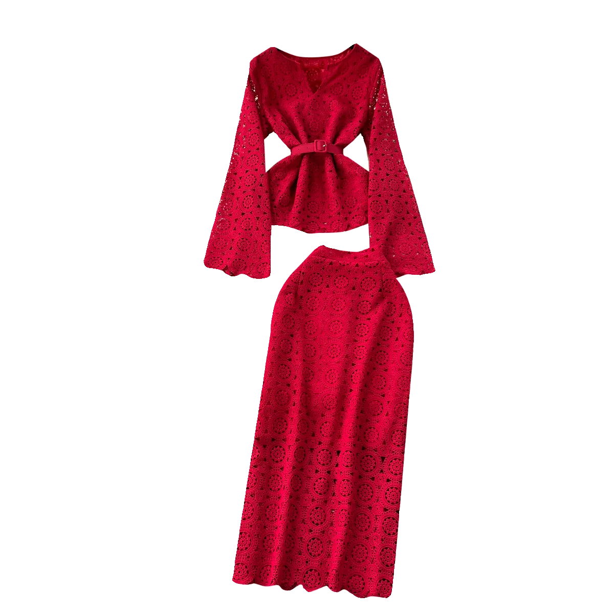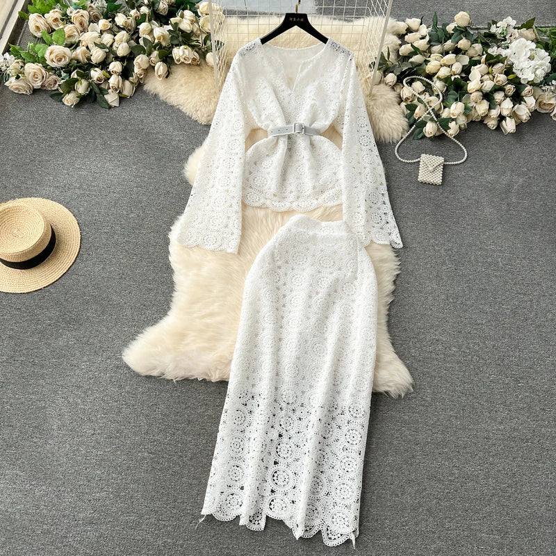 ⭐ Why you need it: - Embrace timeless elegance with this chic two-piece set. - Effortlessly transition from day to night in style. - Flatter your figure with the high waist A-line skirt. - Stay comfortable and trendy with the loose lace flare sleeves.
