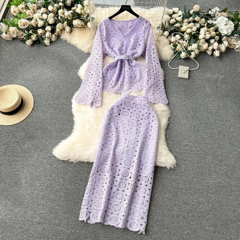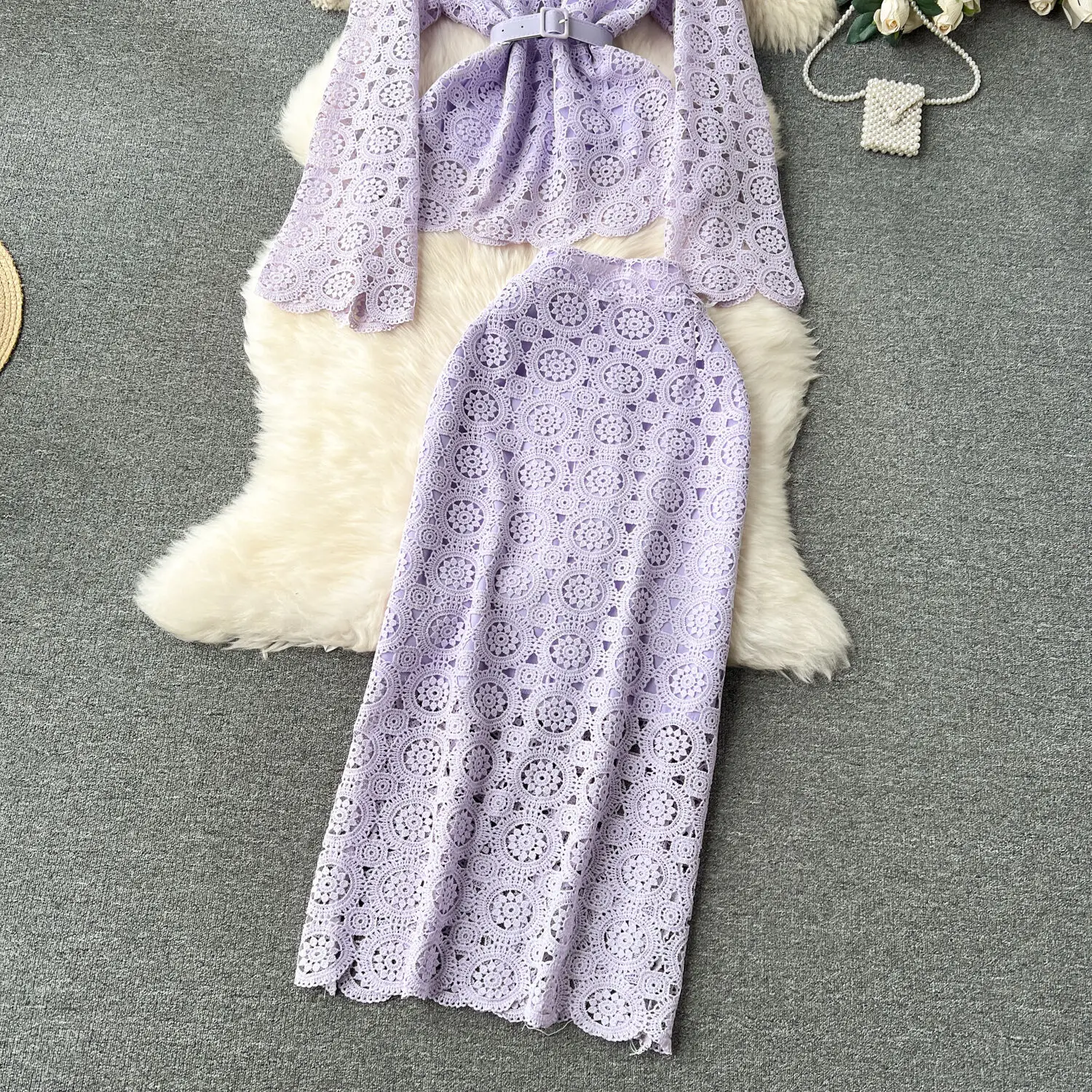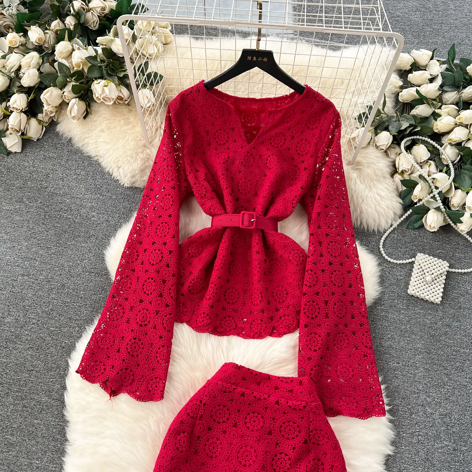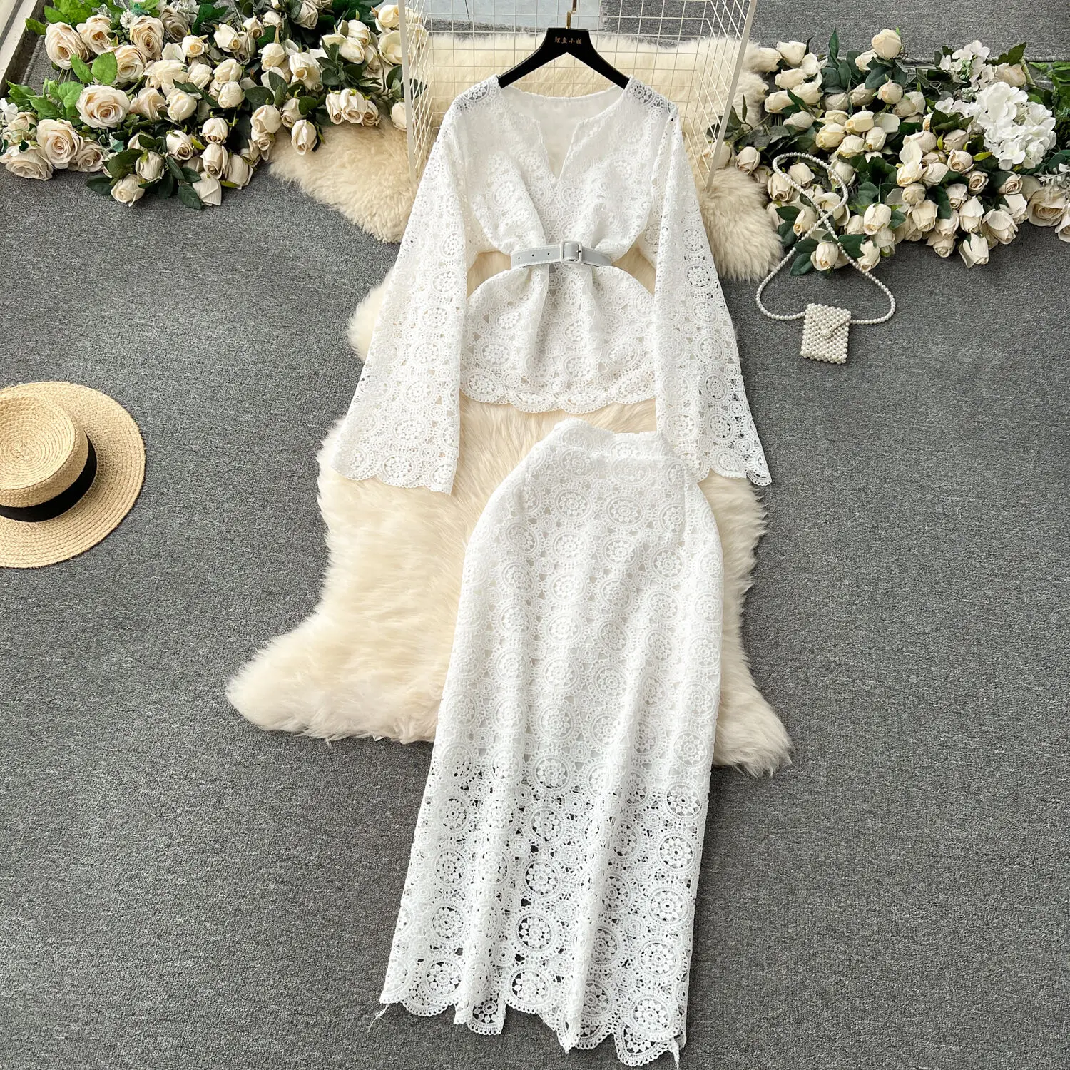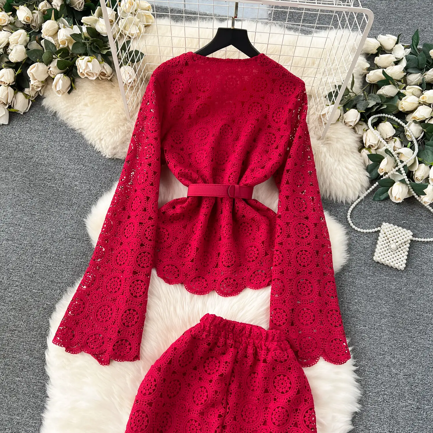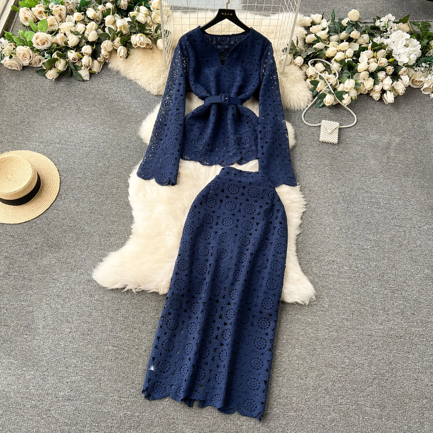 ⭐ Why you need it: - Embrace timeless elegance with this chic two-piece set. - Effortlessly transition from day to night in style. - Flatter your figure with the high waist A-line skirt. - Stay comfortable and trendy with the loose lace flare sleeves.