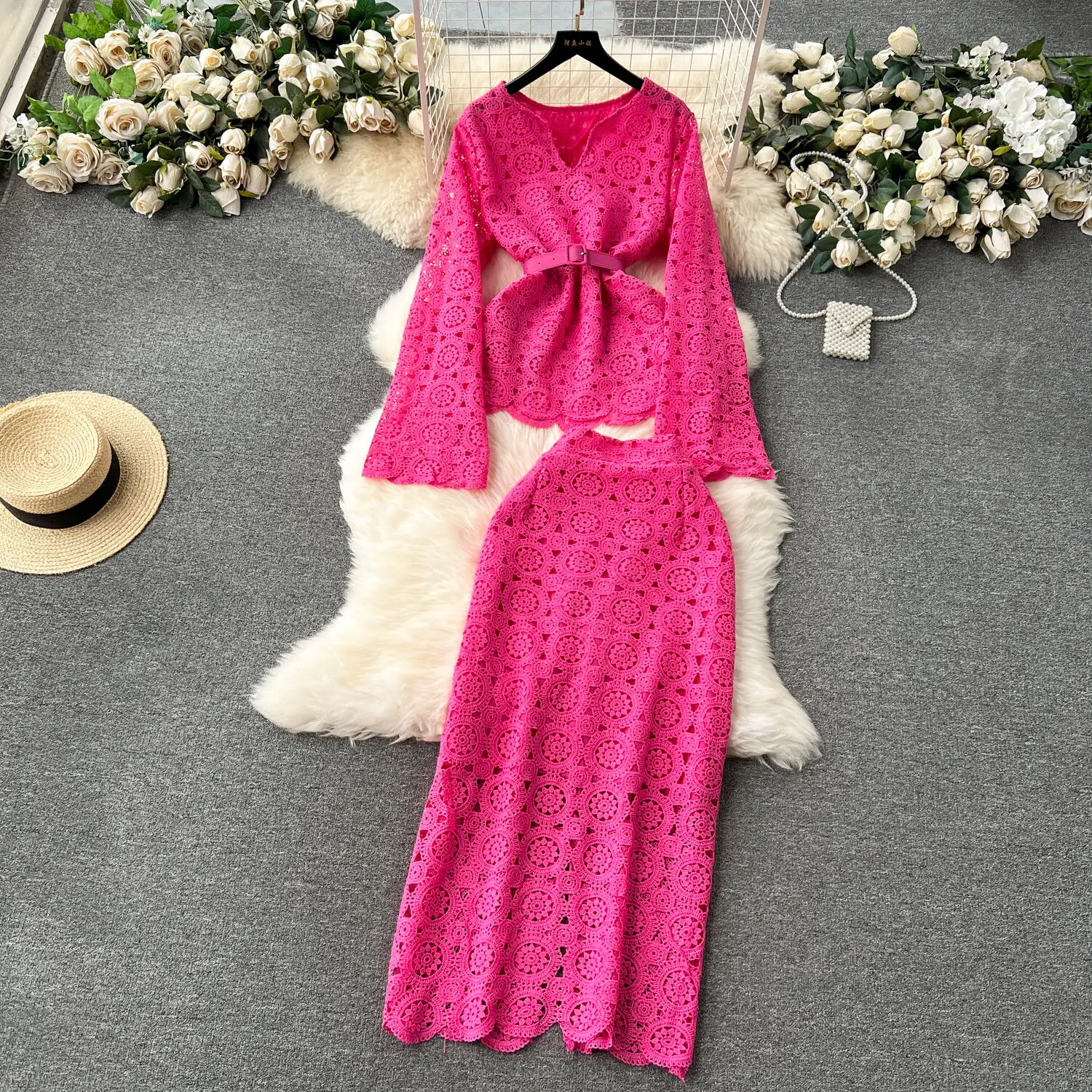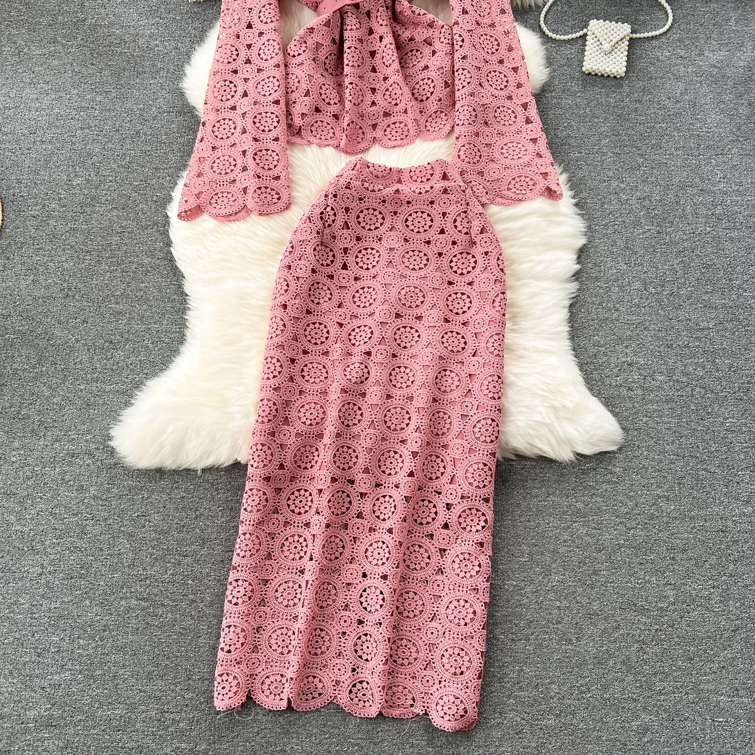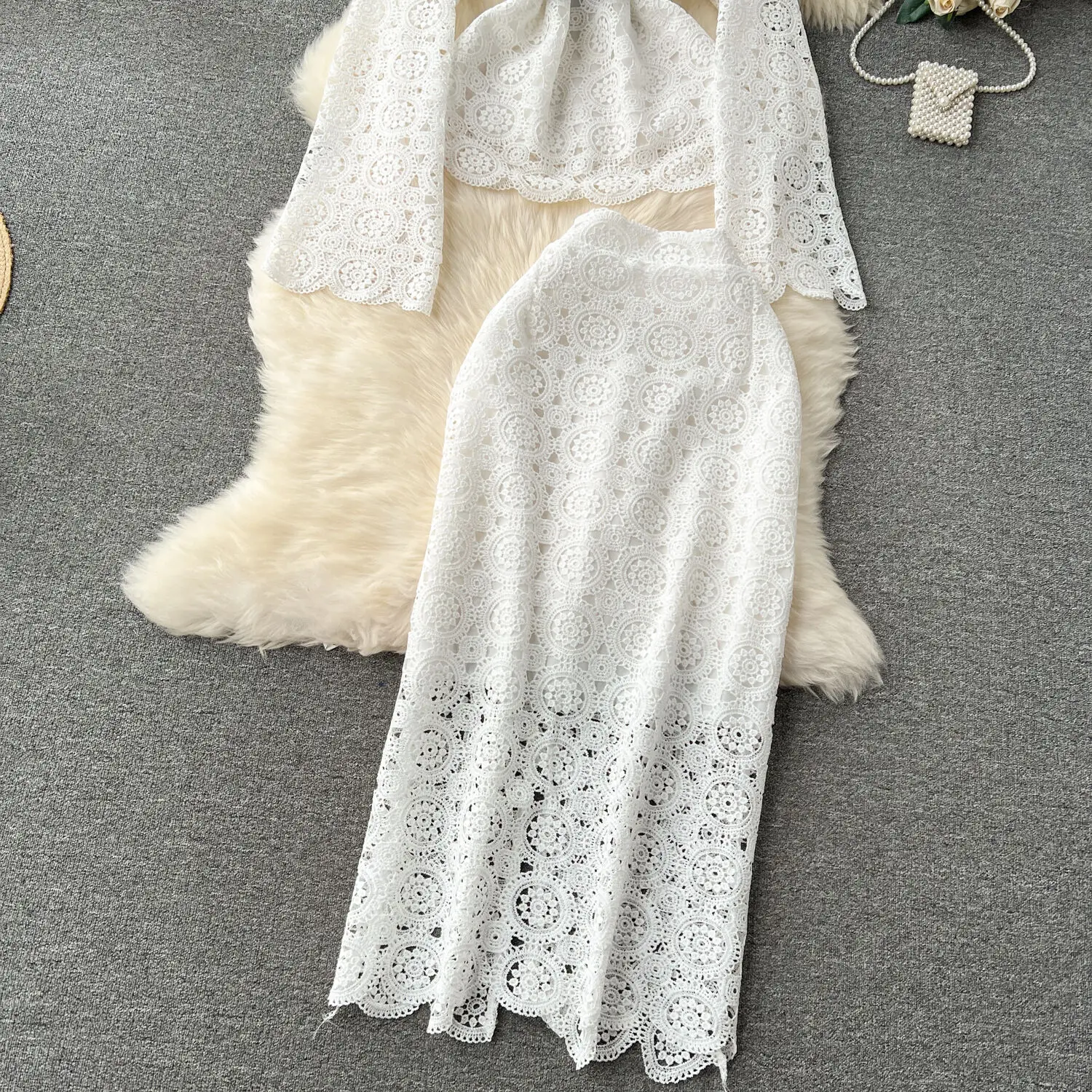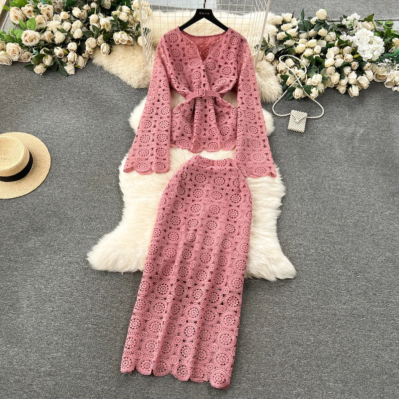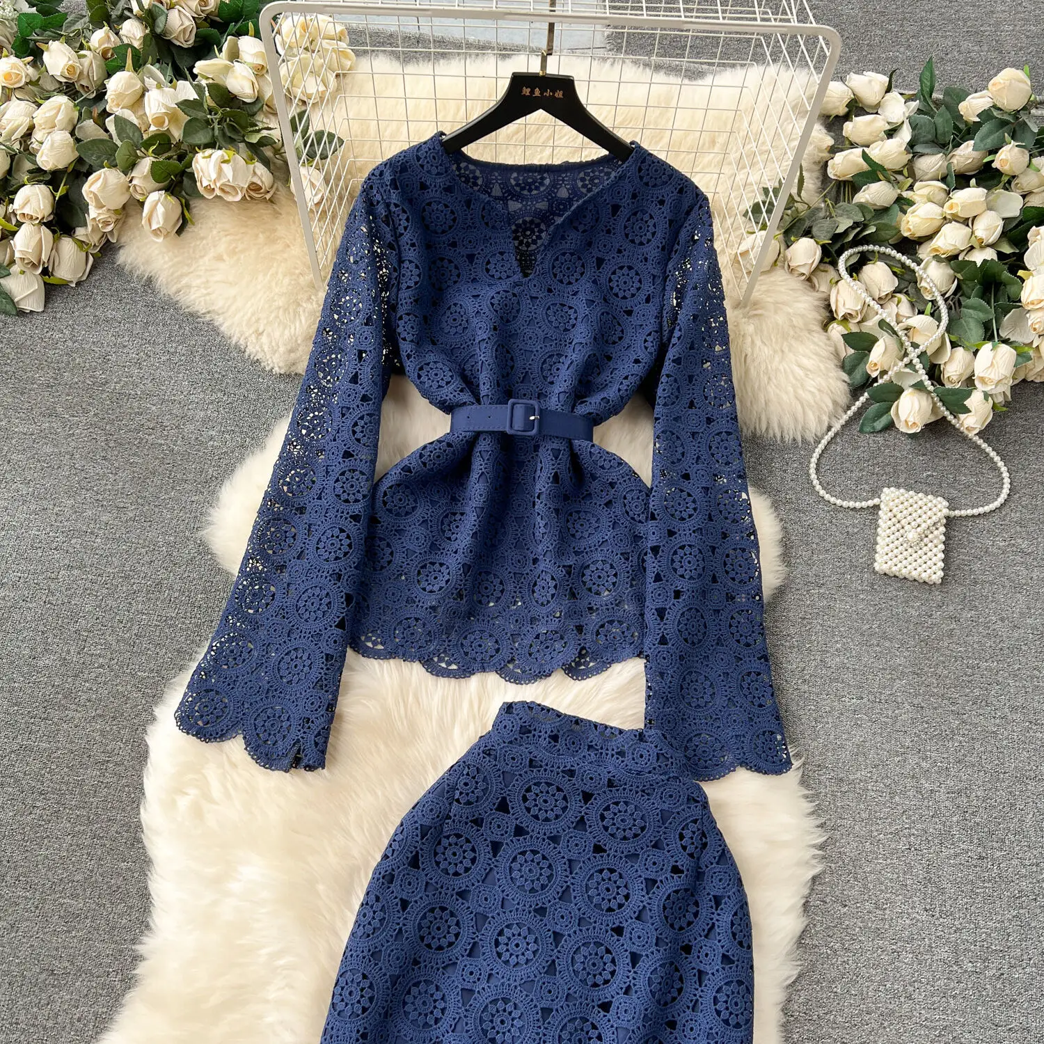 ⭐ Why you need it: - Embrace timeless elegance with this chic two-piece set. - Effortlessly transition from day to night in style. - Flatter your figure with the high waist A-line skirt. - Stay comfortable and trendy with the loose lace flare sleeves.