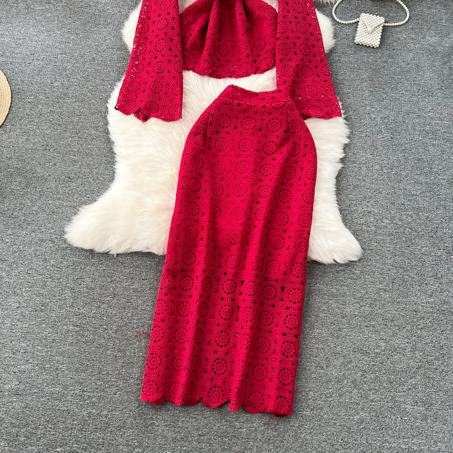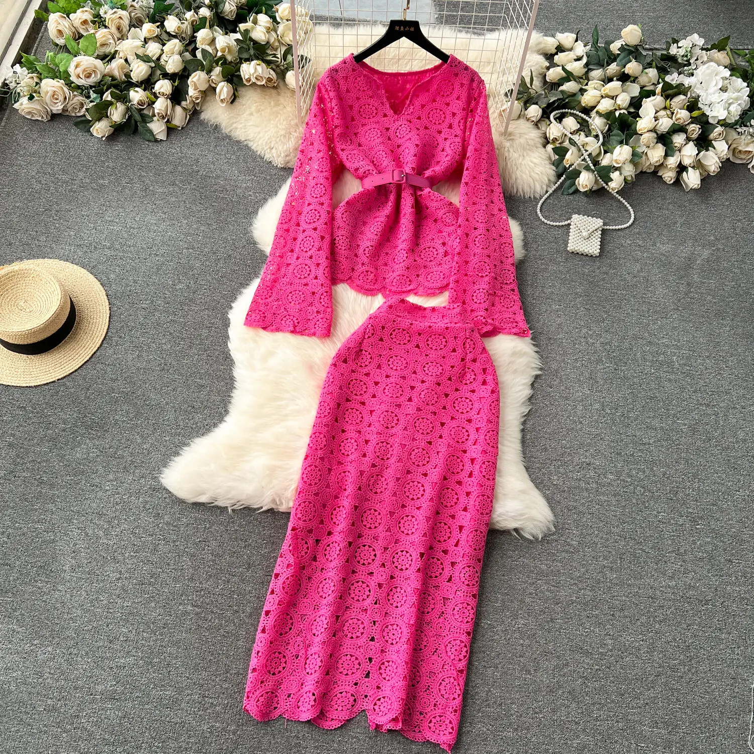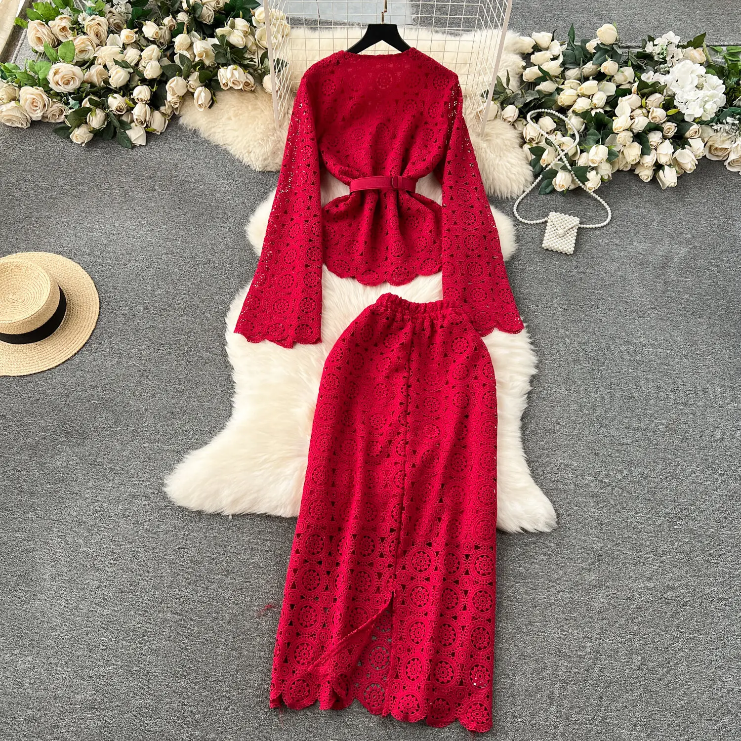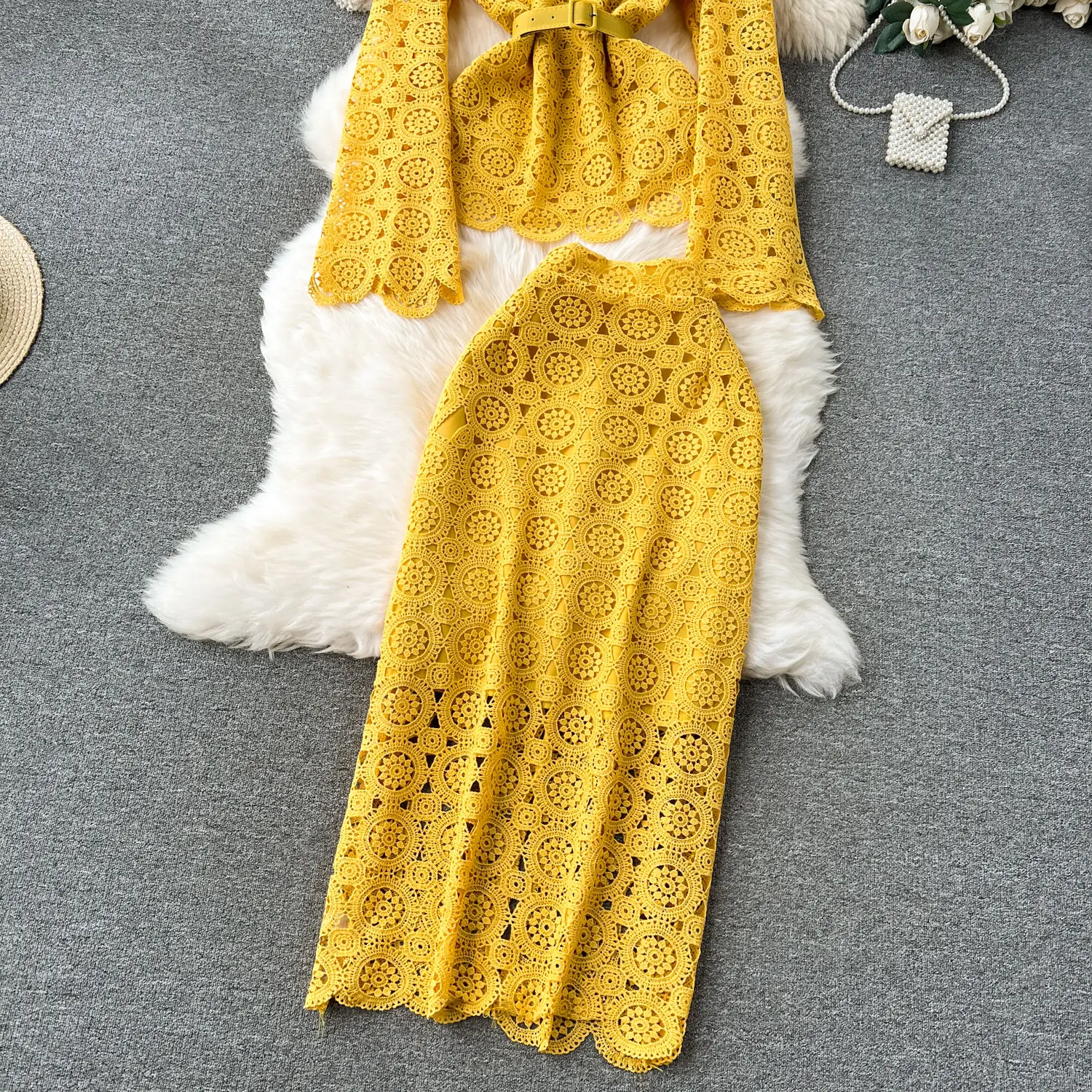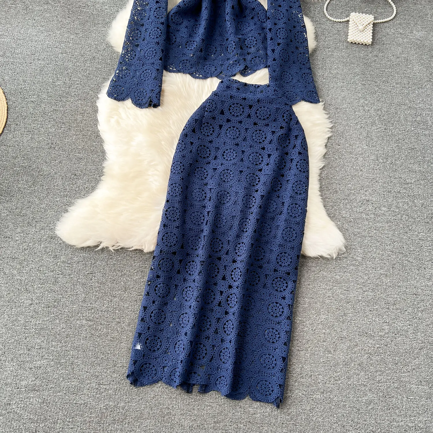 ⭐ Why you need it: - Embrace timeless elegance with this chic two-piece set. - Effortlessly transition from day to night in style. - Flatter your figure with the high waist A-line skirt. - Stay comfortable and trendy with the loose lace flare sleeves.