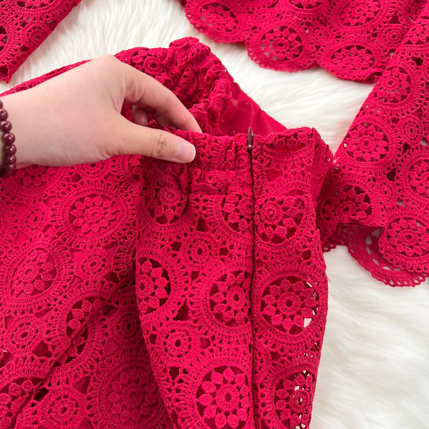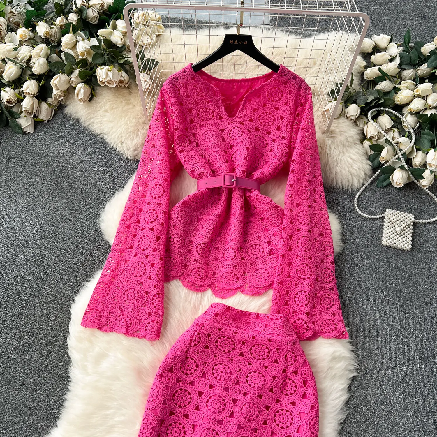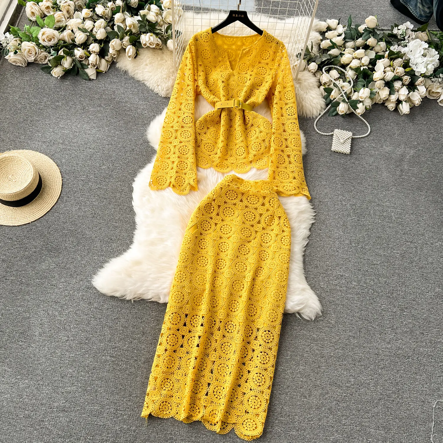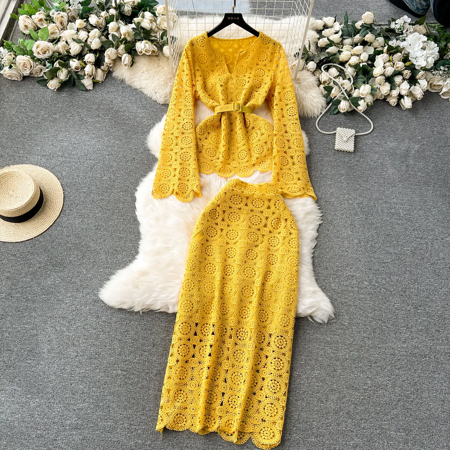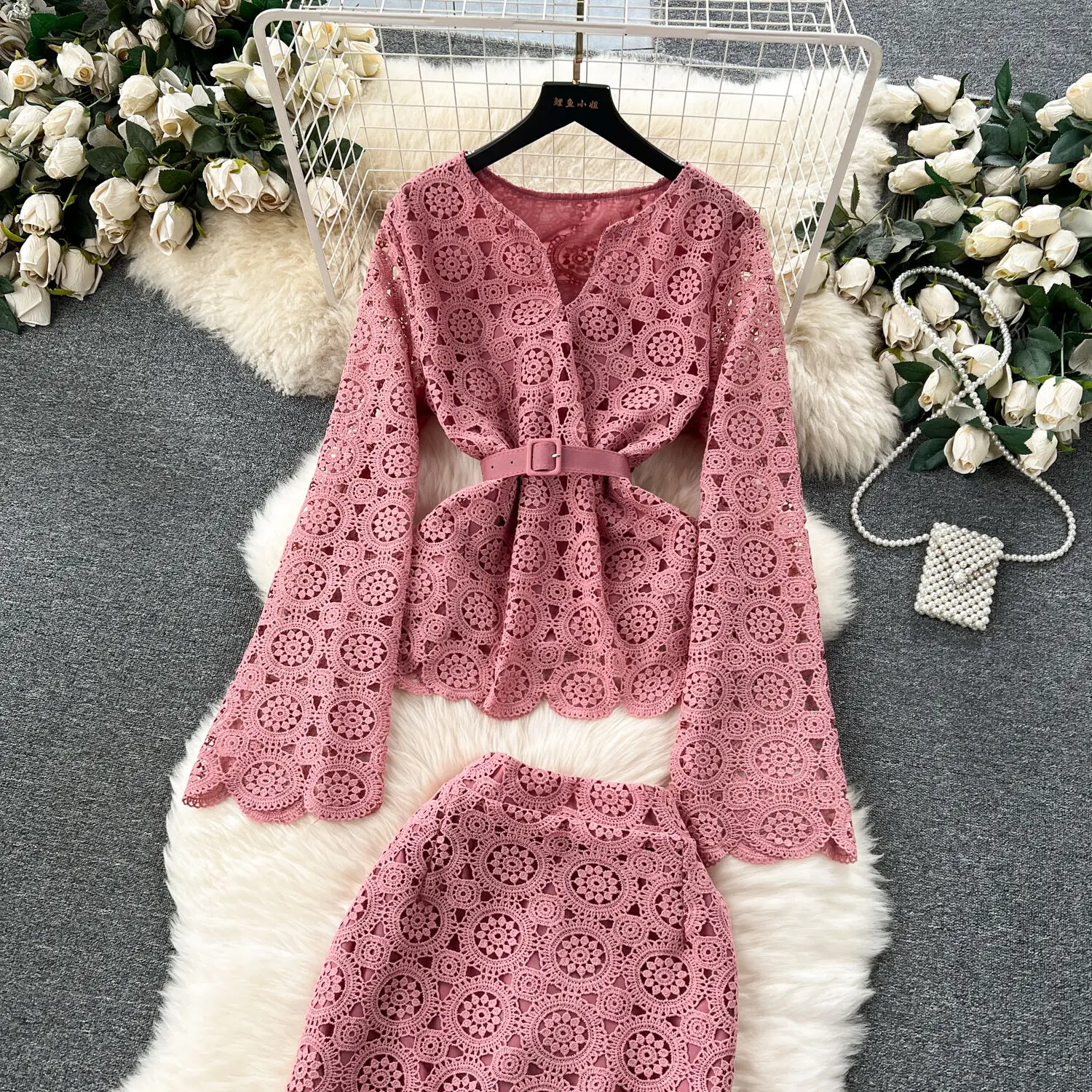 ⭐ Why you need it: - Embrace timeless elegance with this chic two-piece set. - Effortlessly transition from day to night in style. - Flatter your figure with the high waist A-line skirt. - Stay comfortable and trendy with the loose lace flare sleeves.