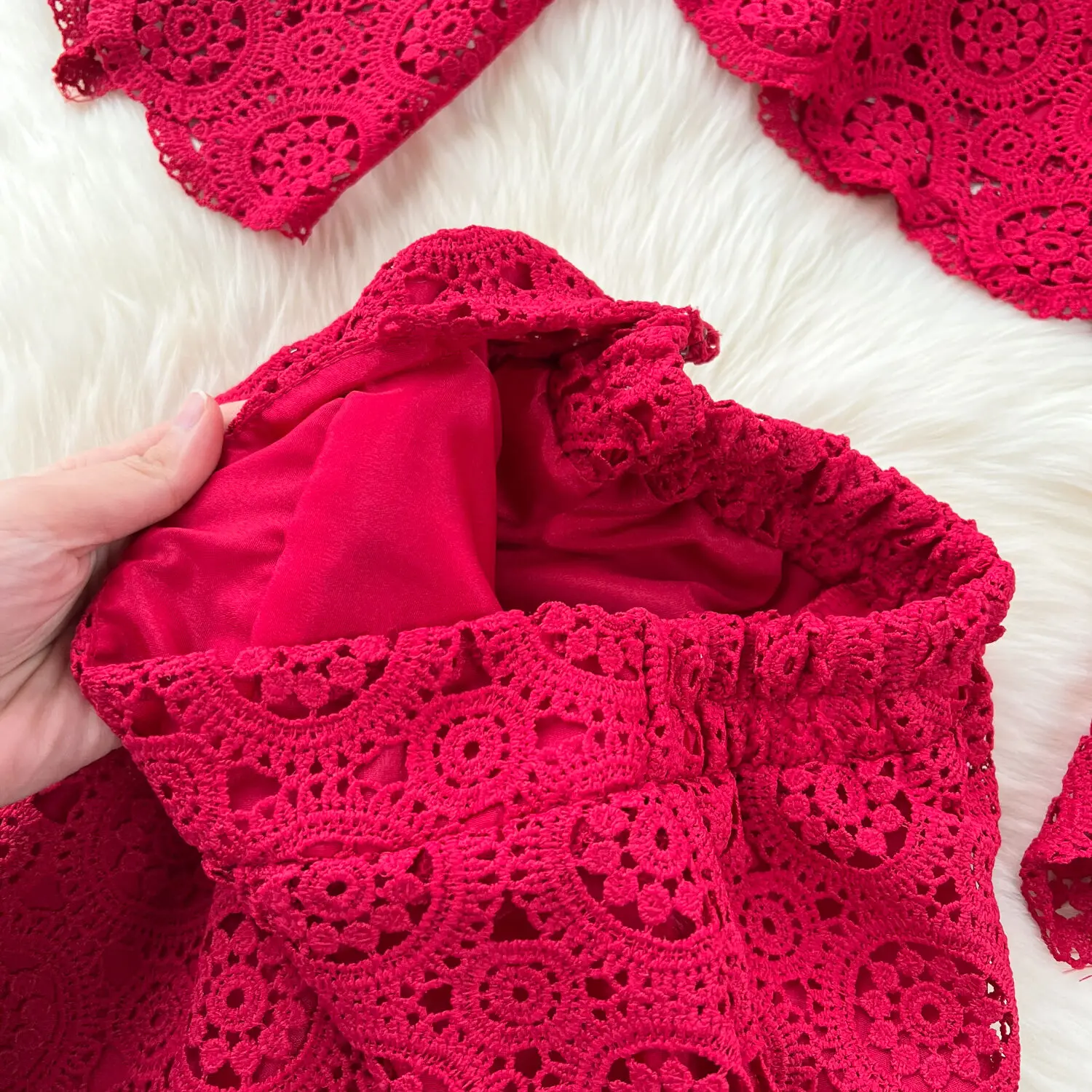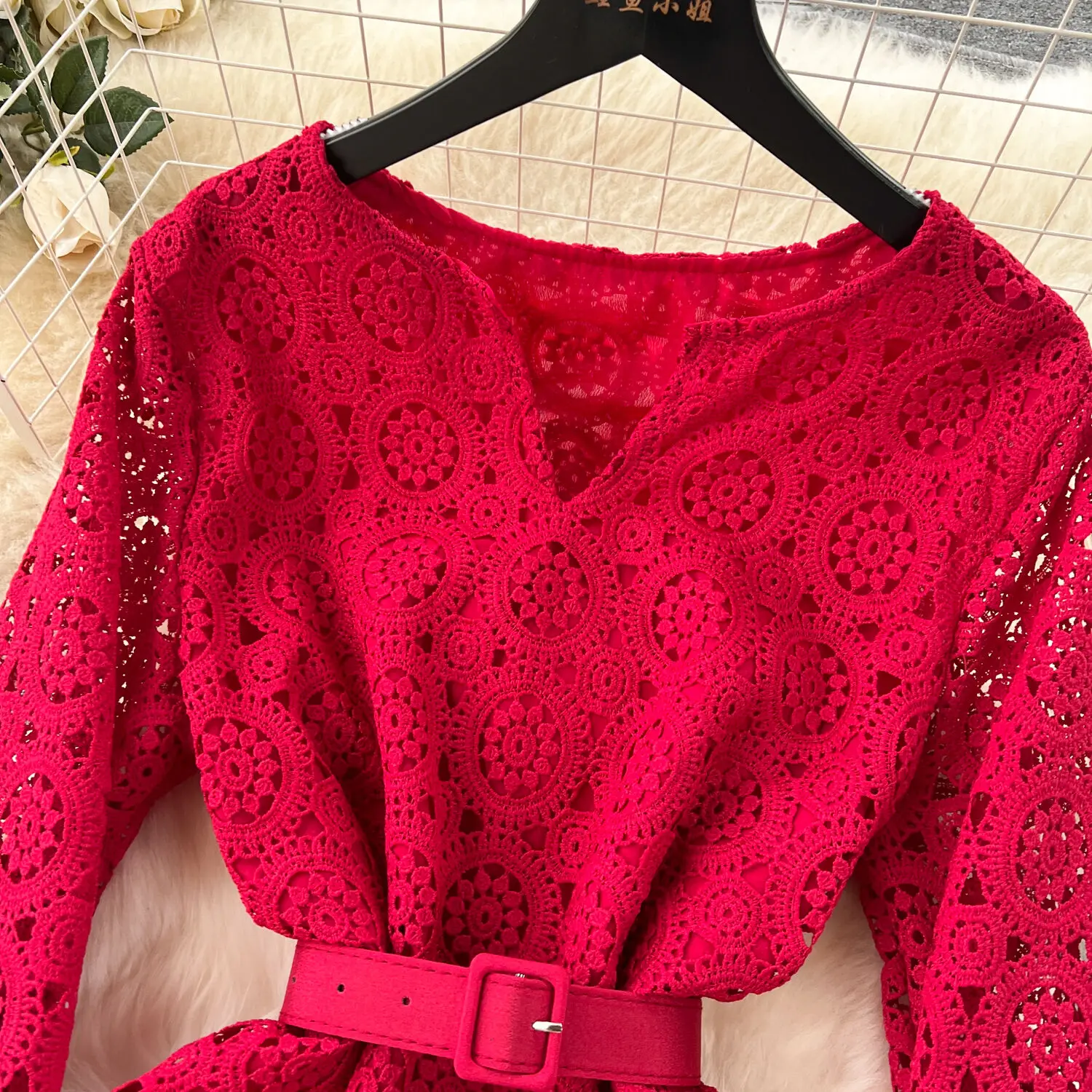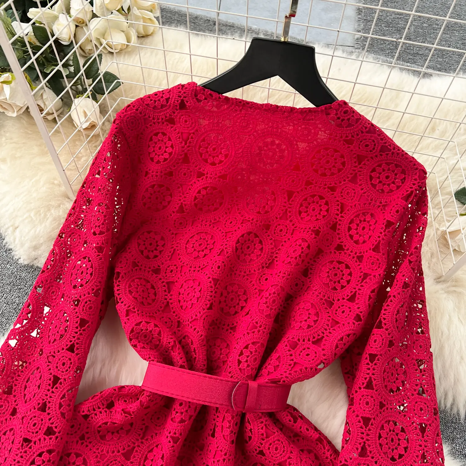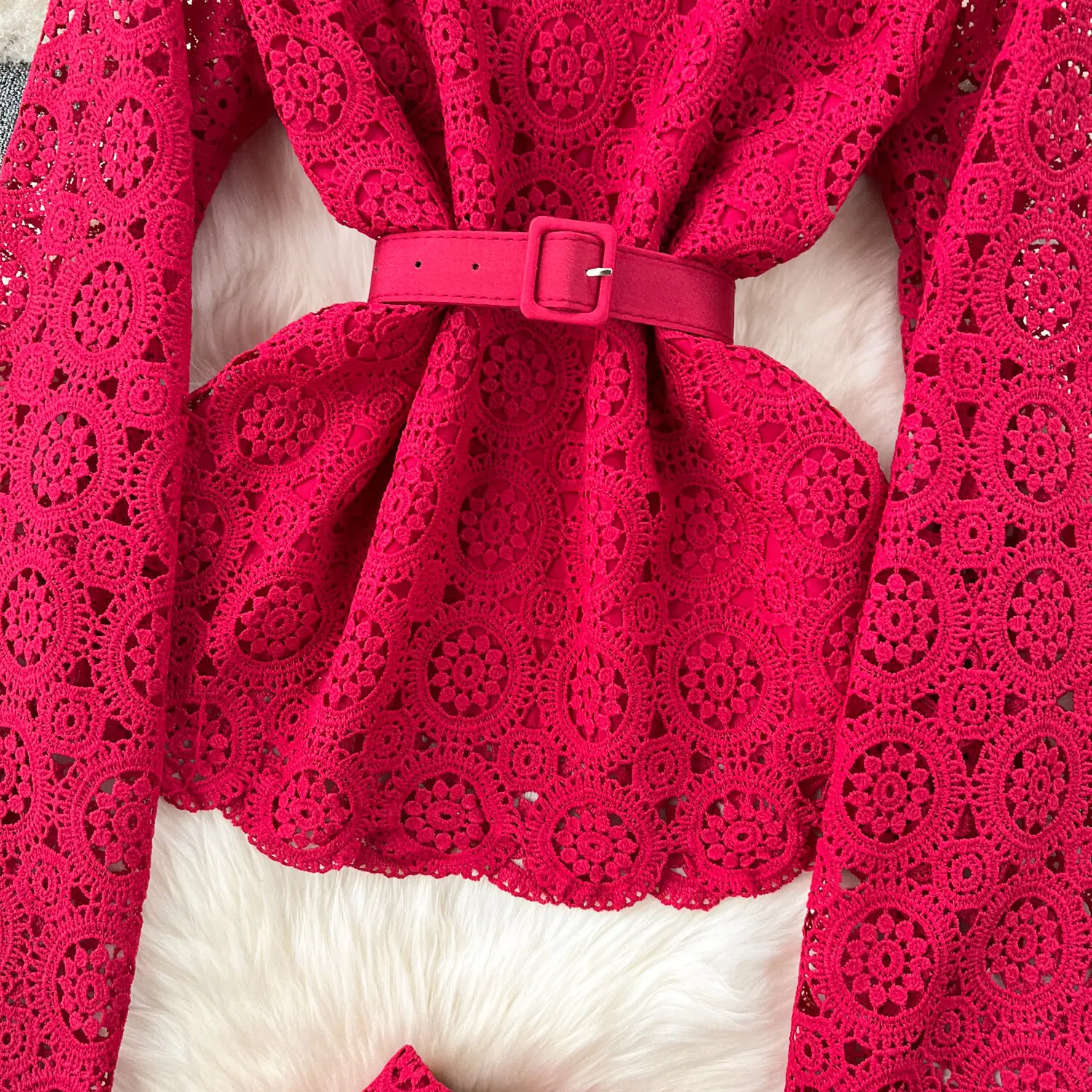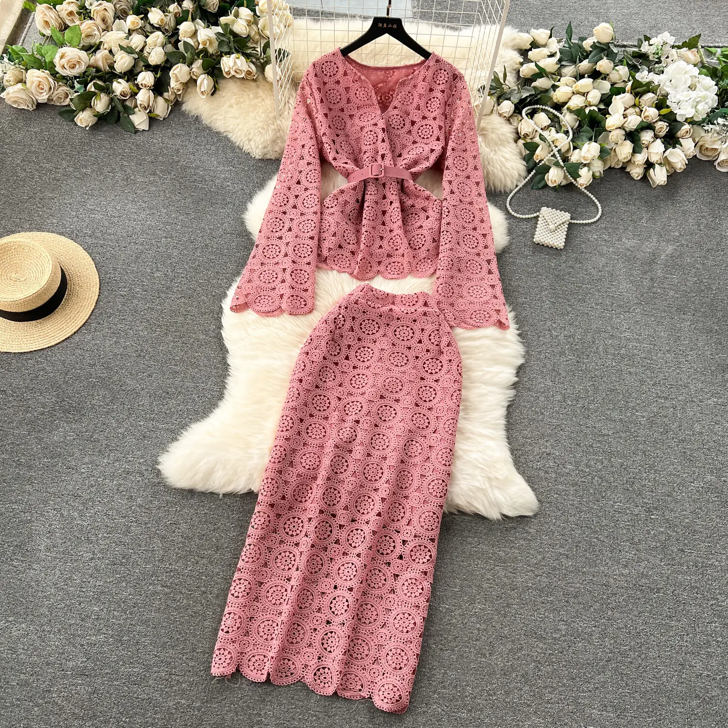 ⭐ Why you need it: - Embrace timeless elegance with this chic two-piece set. - Effortlessly transition from day to night in style. - Flatter your figure with the high waist A-line skirt. - Stay comfortable and trendy with the loose lace flare sleeves.