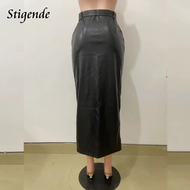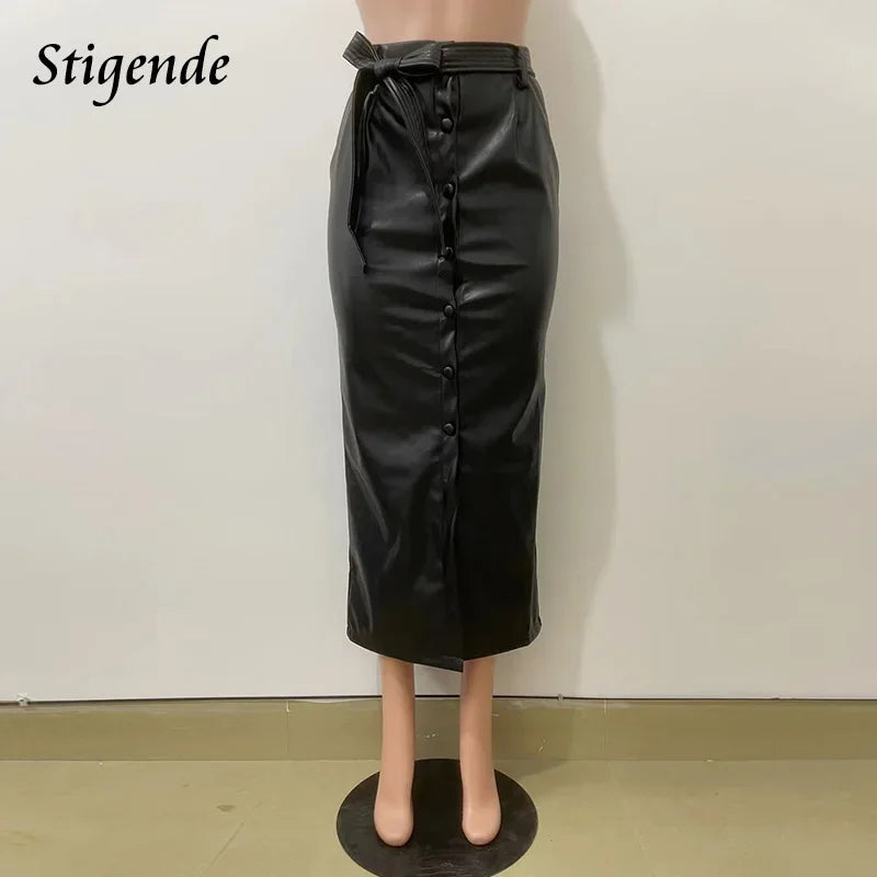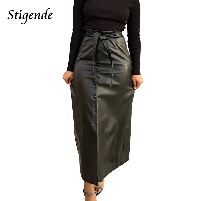 Stigende Single Breasted Pu Leather Long Skirt Women Bandage Button Bodycon Black Faux Leather Maxi Skirt