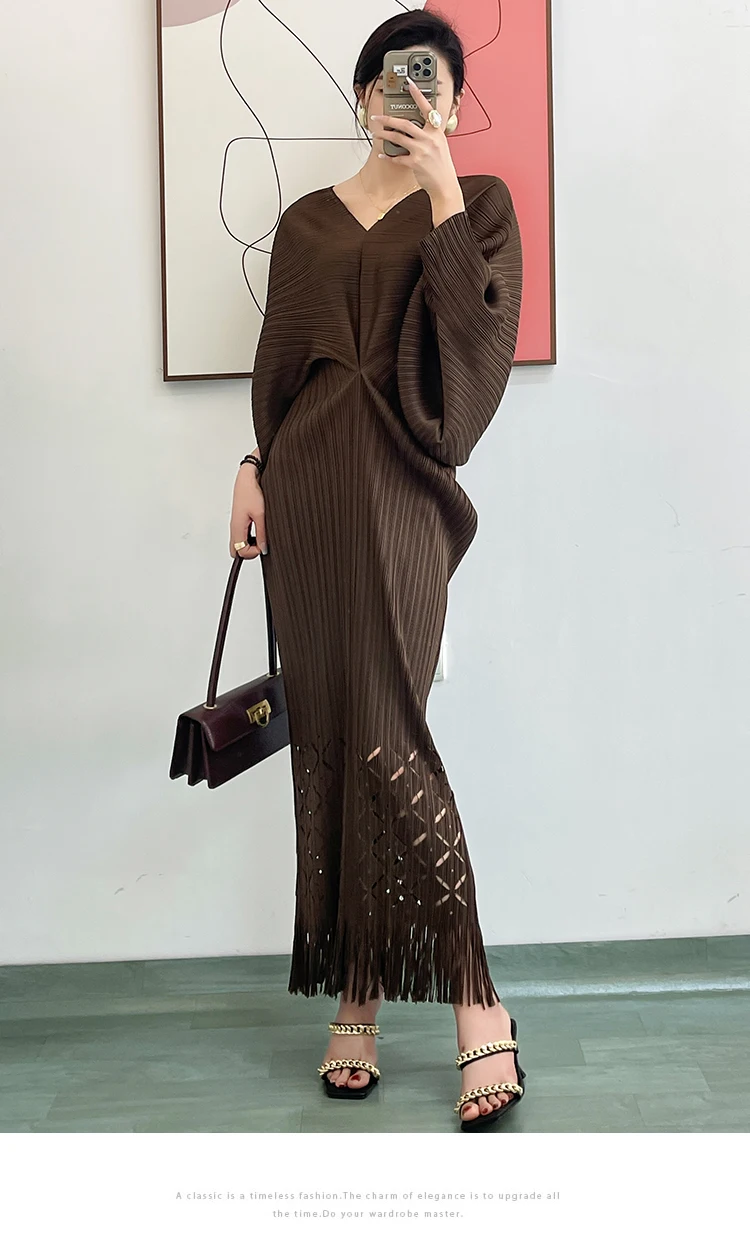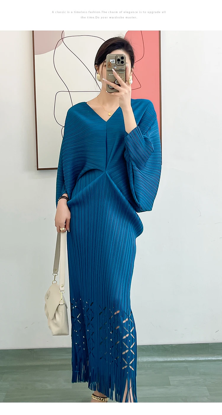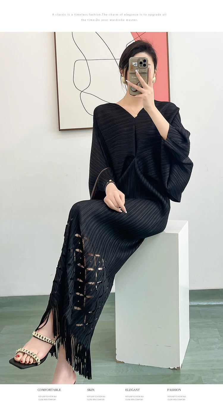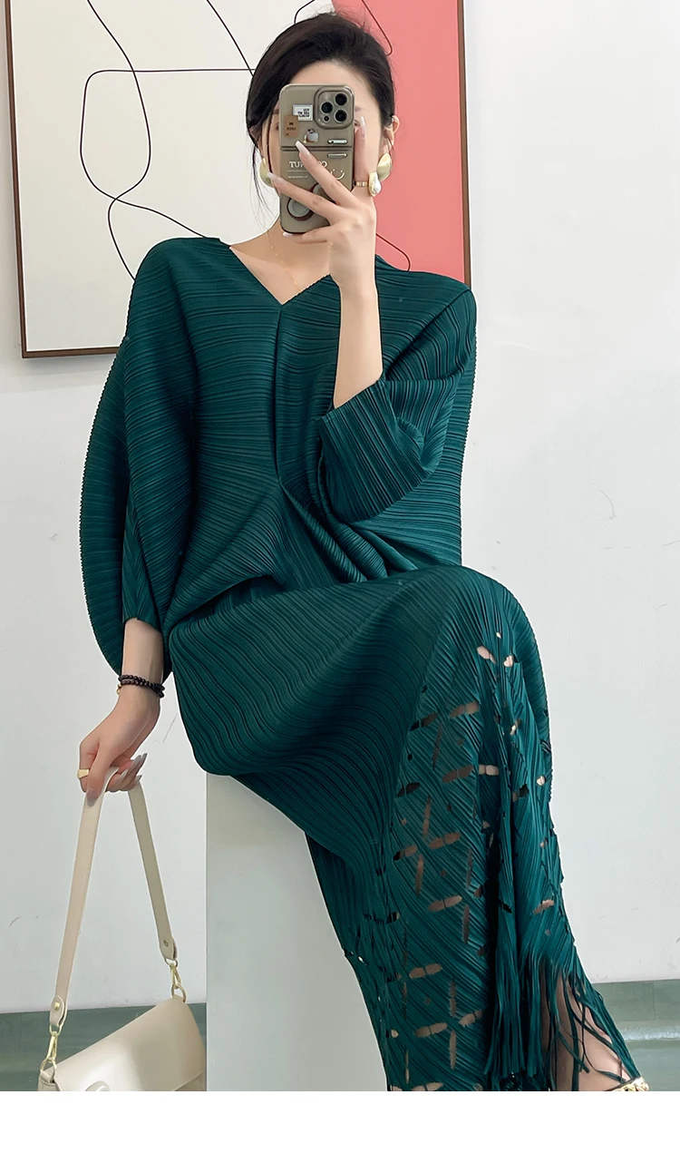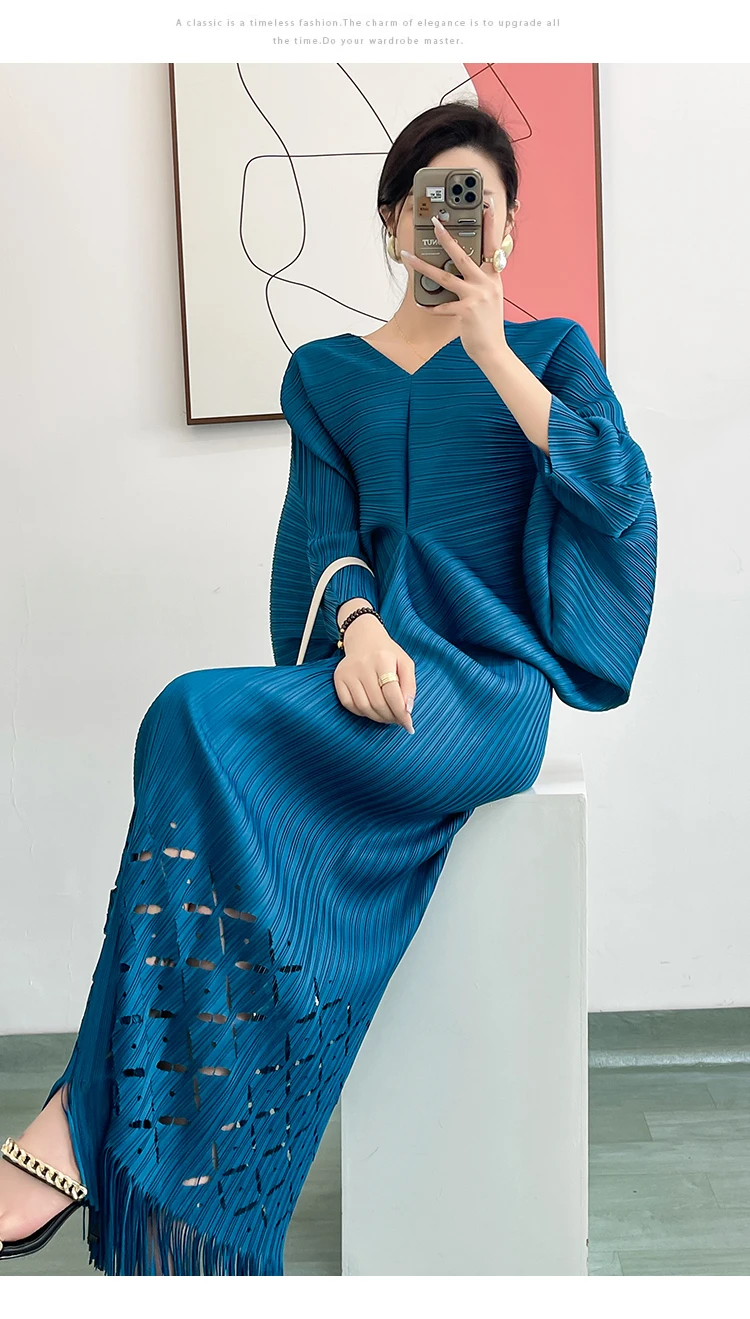 Introducing the ultimate party dress for the 2023 summer season - the 5Color Miyak Pleated Chic and Elegant Tassel Hollow Long Party Prom Dress for Women! This stunning dress features a unique left and right pleated design and bat sleeves, creating a chic and elegant look. The tassel details add a touch of fun and playfulness to the dress. The best part? The bust is free and can fit anyone between 40-80kg, making it a perfect fit for all body types. With its premium quality and limited time availability, this dress is a must-have for any fashion-forward woman looking to make a statement at their next party or prom. Don't miss out on this best-selling and exclusive dress - get yours now and be the center of attention!