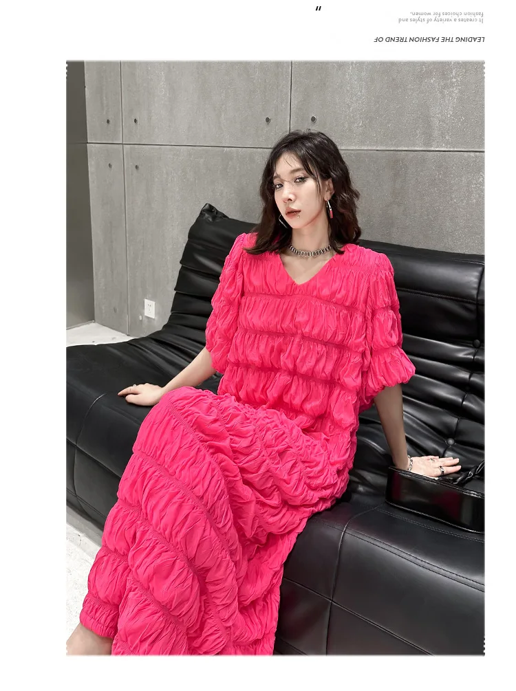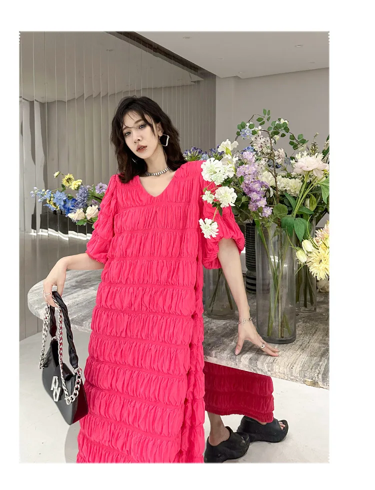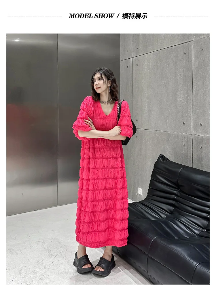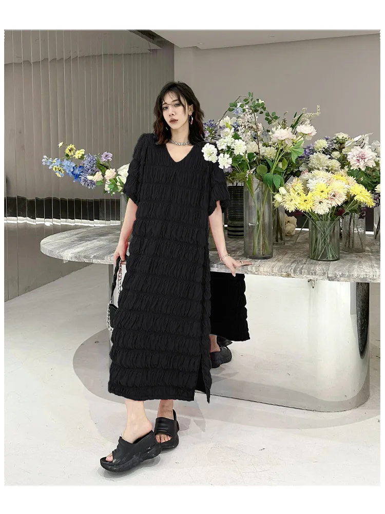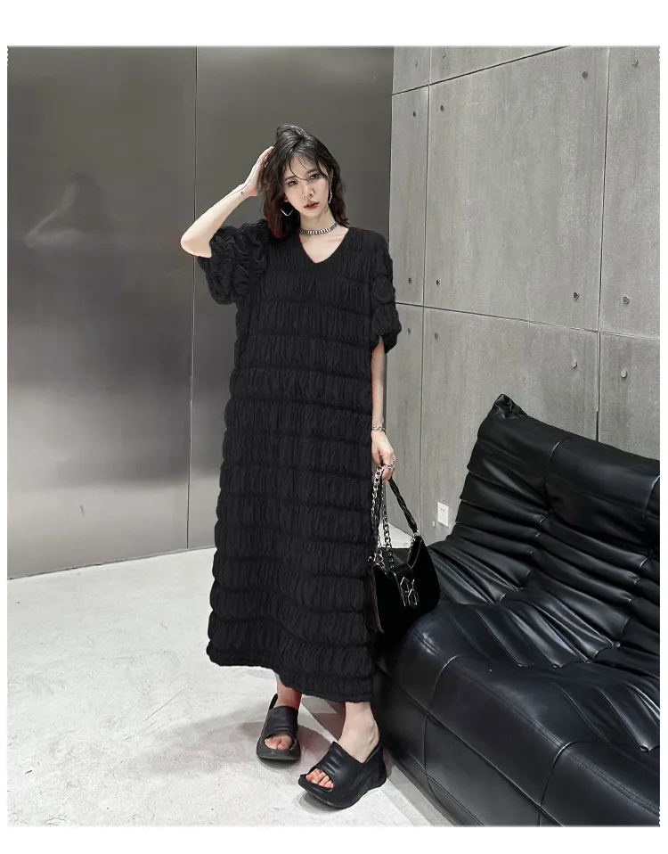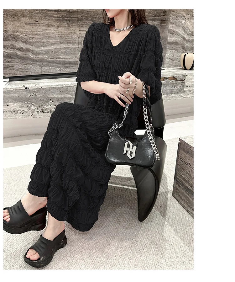 Introducing the [EWQ] Temperament Beautiful Pleated Folds Black A-line V-neck Half Bubble Sleeve Long Dress for Women, the perfect addition to your wardrobe for the 2024 Spring Summer season. This dress boasts a one size fit, with measurements of Bust:116-136, Length:124, Shoulder:40, Sleeve: Waist:114-134 (unit:cm). Made with high-quality materials, this dress offers a comfortable and stylish fit for any body type. The pleated folds add a touch of elegance, while the V-neck and half bubble sleeves create a flattering silhouette. Whether you're on the go or attending a special event, this dress is a must-have. Don't miss out on this limited time offer and add this best-selling dress to your collection today!