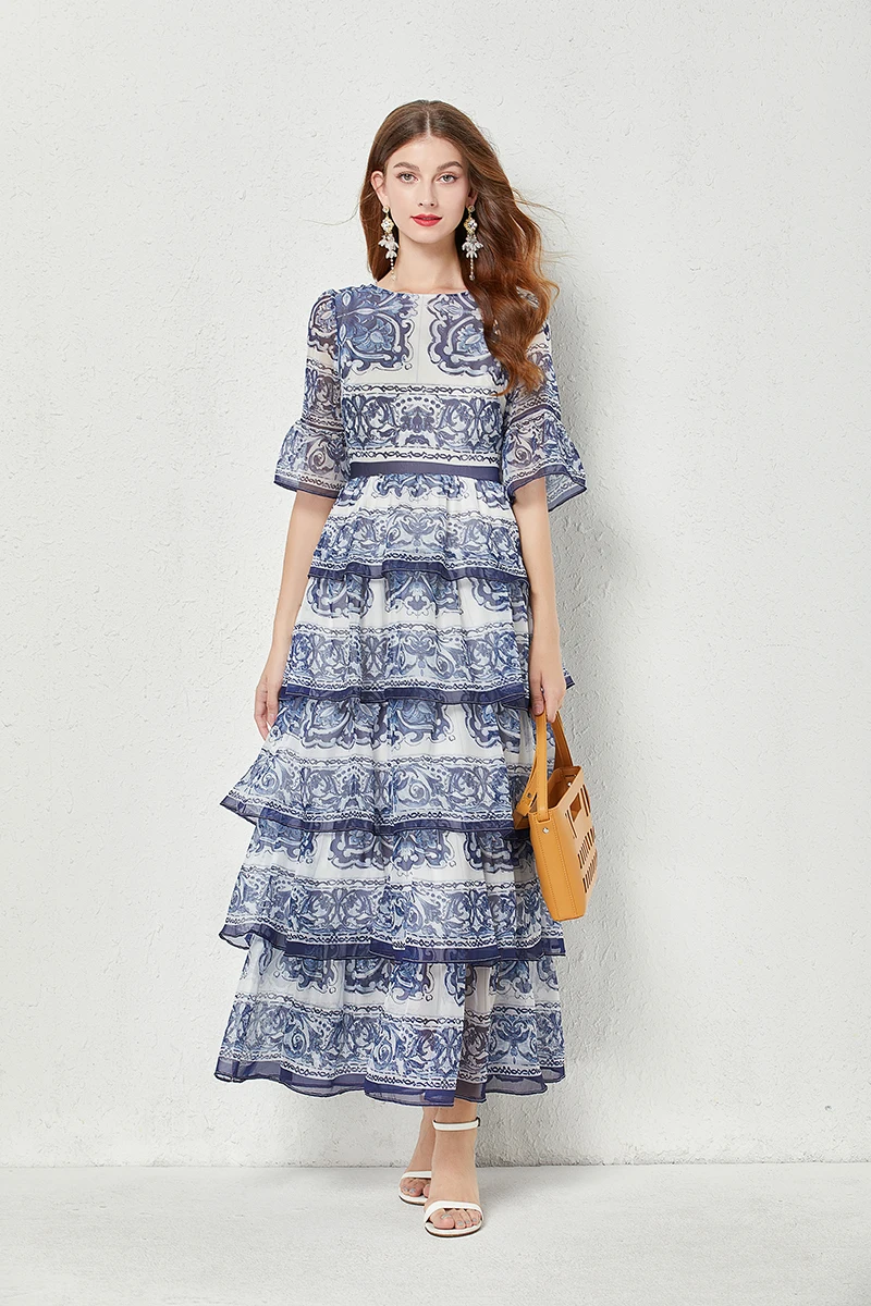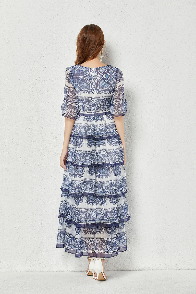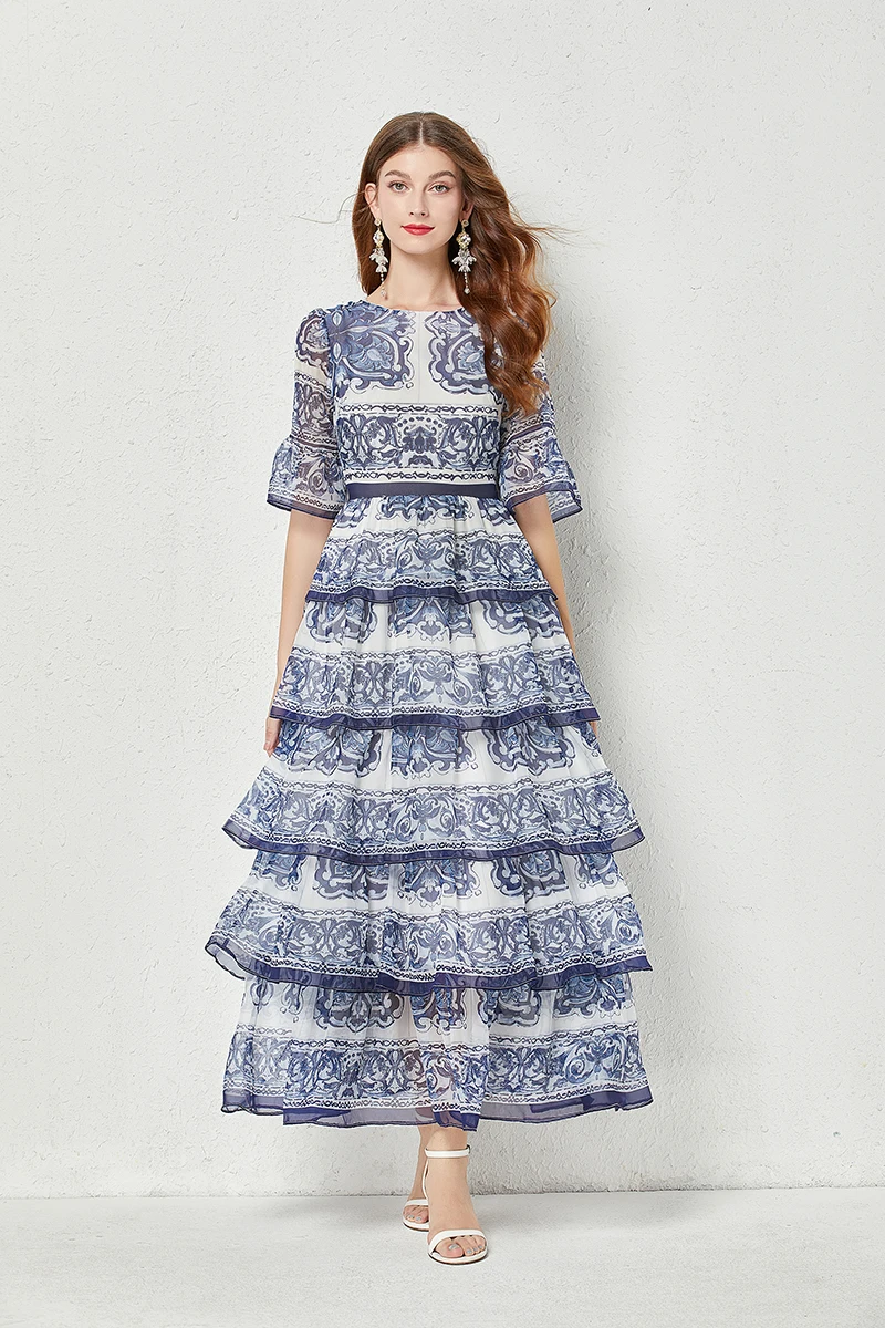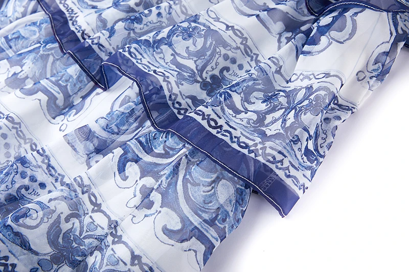 Introducing our newest addition to the 2023 summer collection - the stunning 'Gorgeous Blue And White Porcelain Printed Cascading Ruffles Maxi Dress'. Made from premium chiffon fabric, this dress features 5 layers of cascading ruffles and flare sleeves, giving you a perfect fit and a flattering silhouette. It's the perfect dress for any occasion, whether you're on the go or attending a special event. Limited time offer, so don't miss out on this best seller. Order now and enjoy free shipping to most countries. Get yours today and stand out in this exclusive and unique dress.