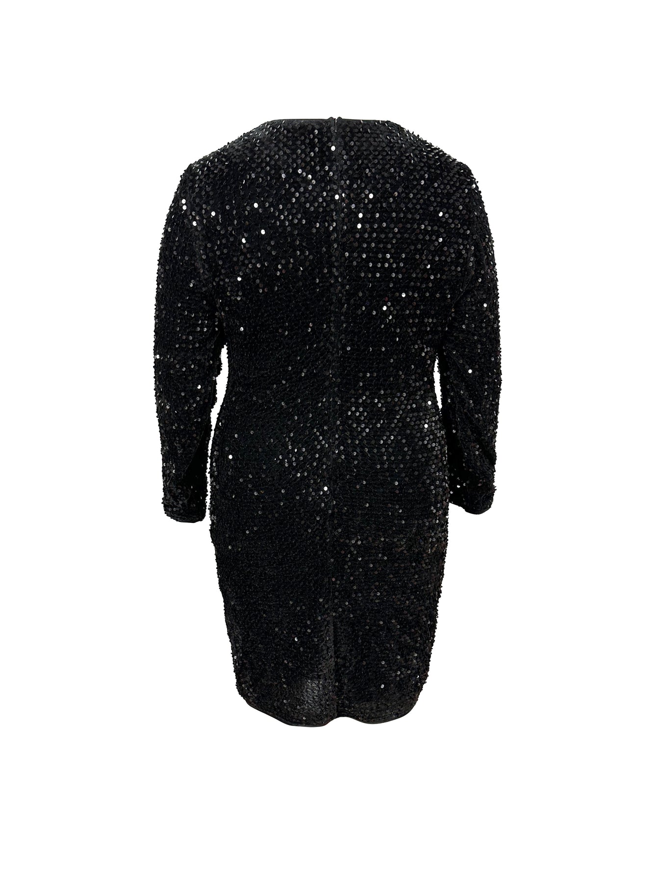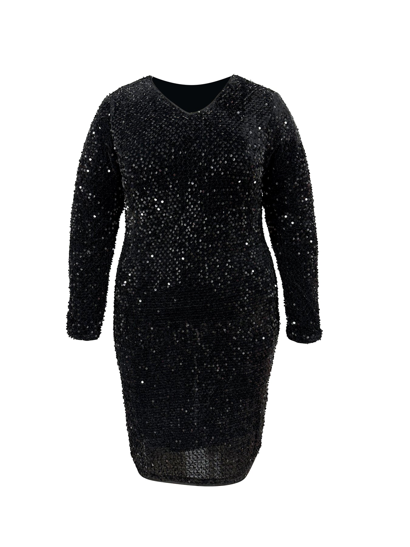 Make a statement at any formal event with our Plus Size Elegant Bridesmaid Dress. This stunning dress features a V-neckline, long sleeves, and a figure-flattering fit. The solid sequin design adds a touch of glamour to your look.