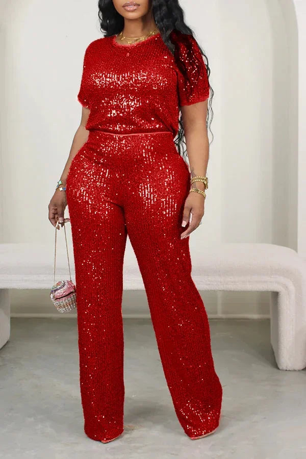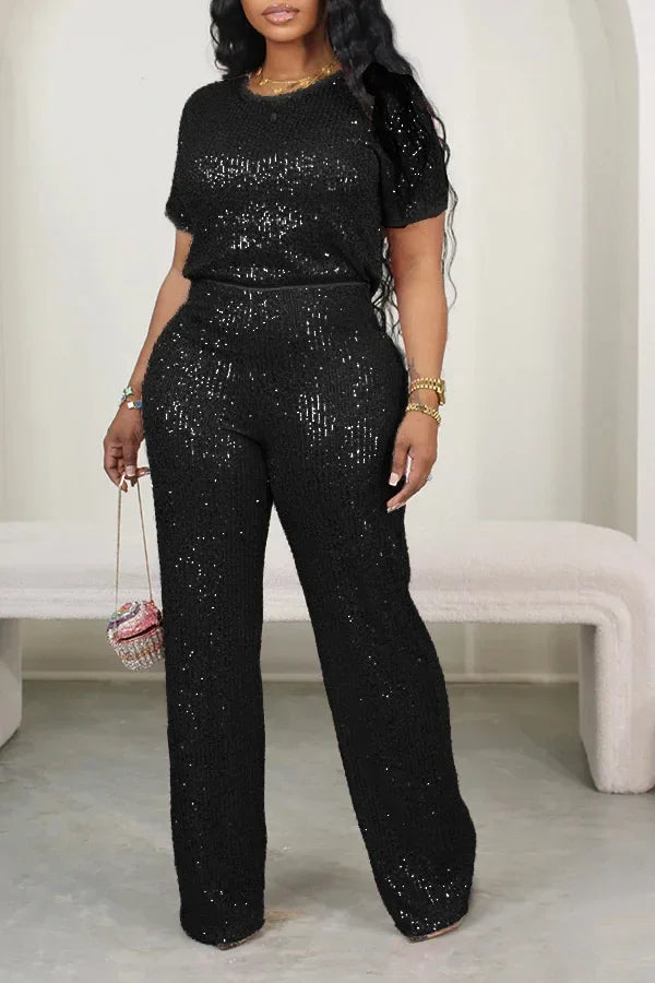 Introducing our Autumn Casual Sequin Two Piece Set for Women, the perfect blend of fashion and comfort. This set features a solid short-sleeved t-shirt and wide-leg pants, both adorned with eye-catching sequins. Whether you're running errands or heading out for a night on the town, this set is the perfect choice. Not only does it solve the problem of finding a stylish and comfortable outfit, but it also adds a touch of glamour to your wardrobe. Made with premium materials, this set is a best-seller and a limited time exclusive. Don't miss out on this perfect fit for any occasion.