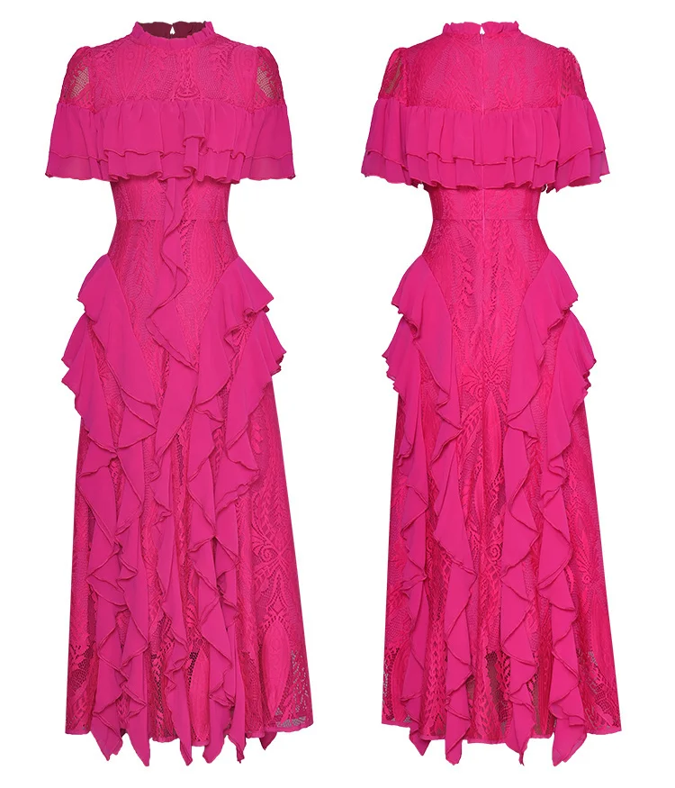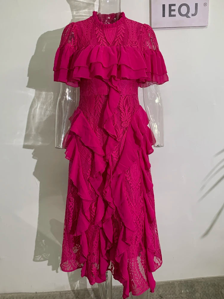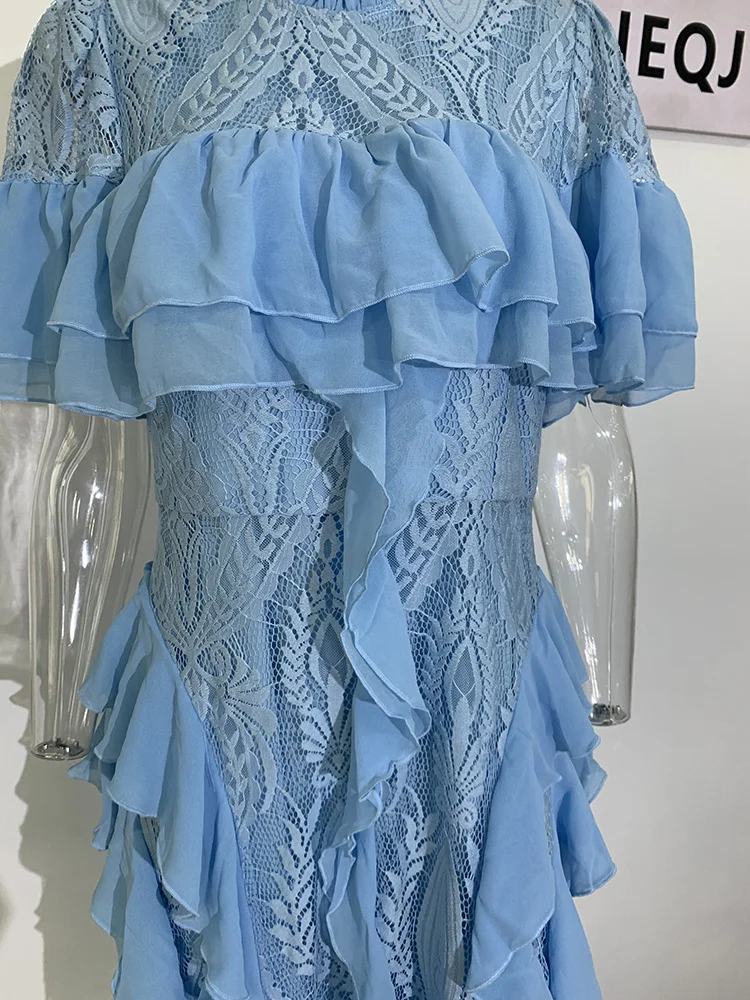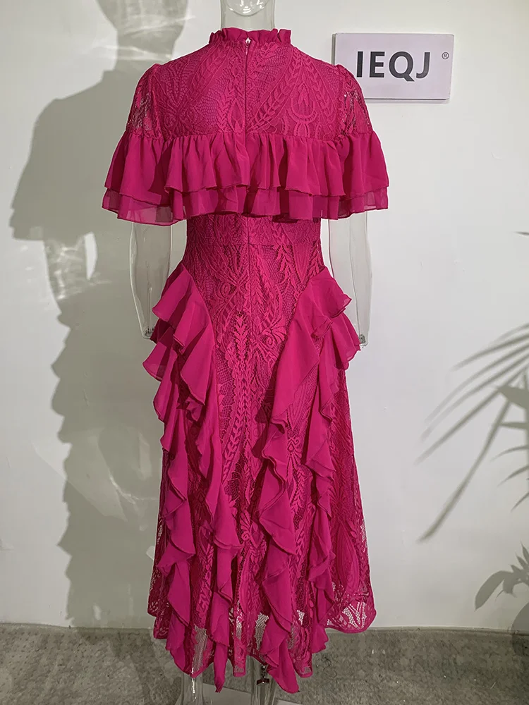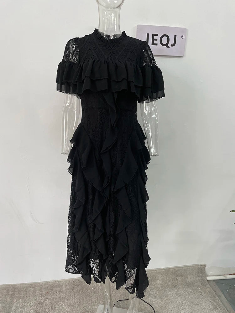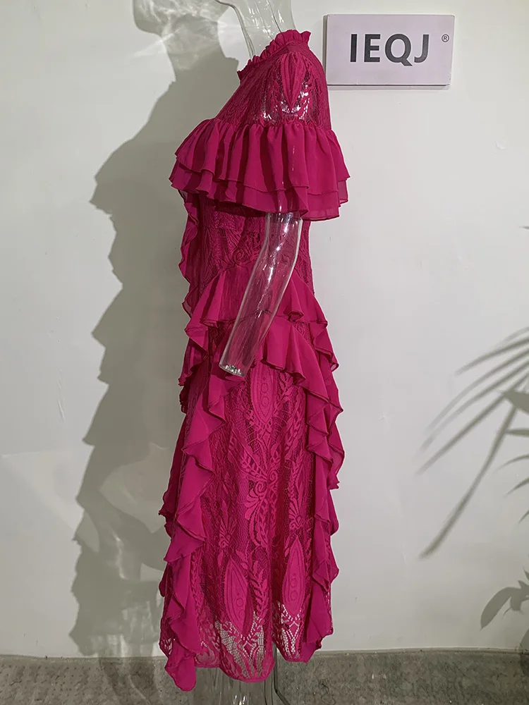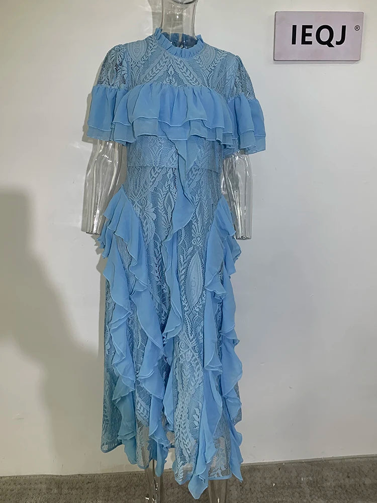 Introducing our IEQJ Fashion Designs Hollow Out Ruffled Evening Dress, the perfect choice for any special occasion. Made with high-quality materials, this dress features a stunning ruffled design and a sleek O-neckline, adding a touch of elegance to your look. The short sleeves make it perfect for the summer season, keeping you cool and comfortable all day long. Available in sizes S-2XL, our dress is designed to fit perfectly and flatter your figure. With its unique design and impeccable craftsmanship, our dress is a must-have for any fashion-forward woman. Don't miss out on this limited-time offer and elevate your wardrobe with our premium evening dress.