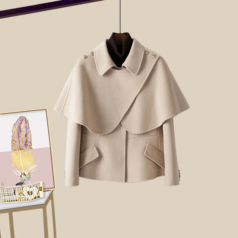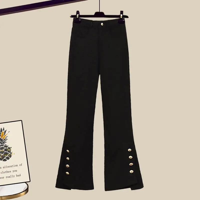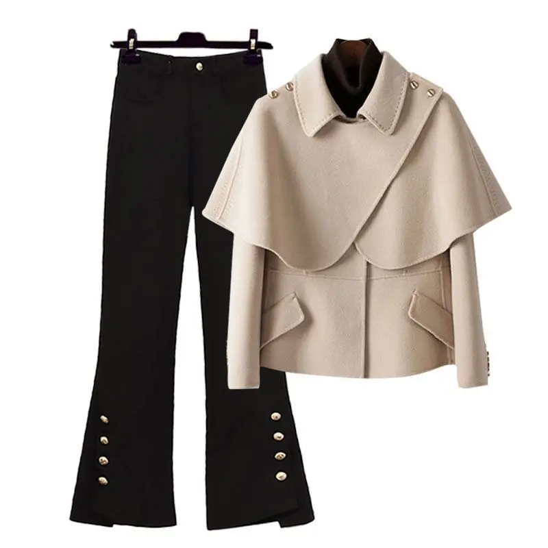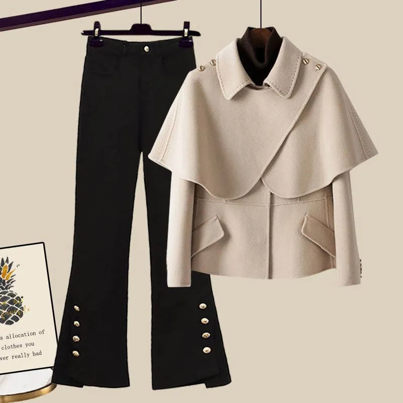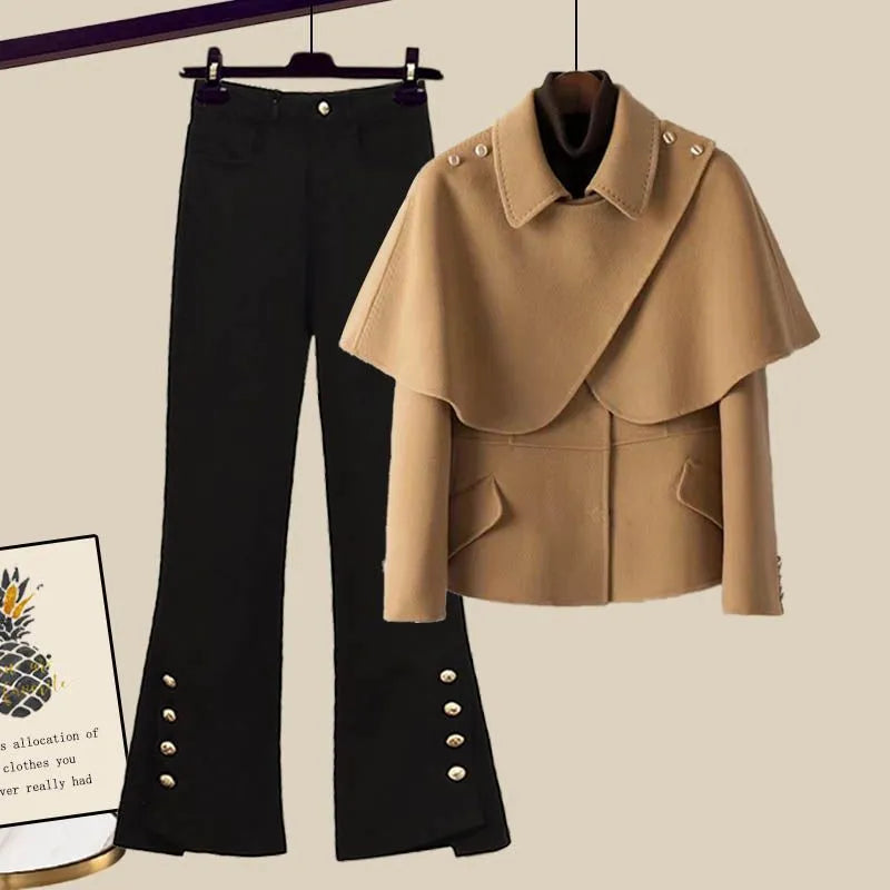 Introducing our latest addition to the fashion world - the Korean Retro Personality Cape Jacket Blazer Bell-bottoms Two-piece Elegant Women's Trousers Suit. This premium suit is designed to solve the problem of finding the perfect outfit for office and business events. The unique combination of a cape jacket and bell-bottom trousers adds a touch of elegance and personality to your look. Made with high-quality materials, this suit is a best seller and a must-have for any fashion-forward woman. Don't miss out on this exclusive limited time offer and upgrade your wardrobe with our perfect fit suit today.