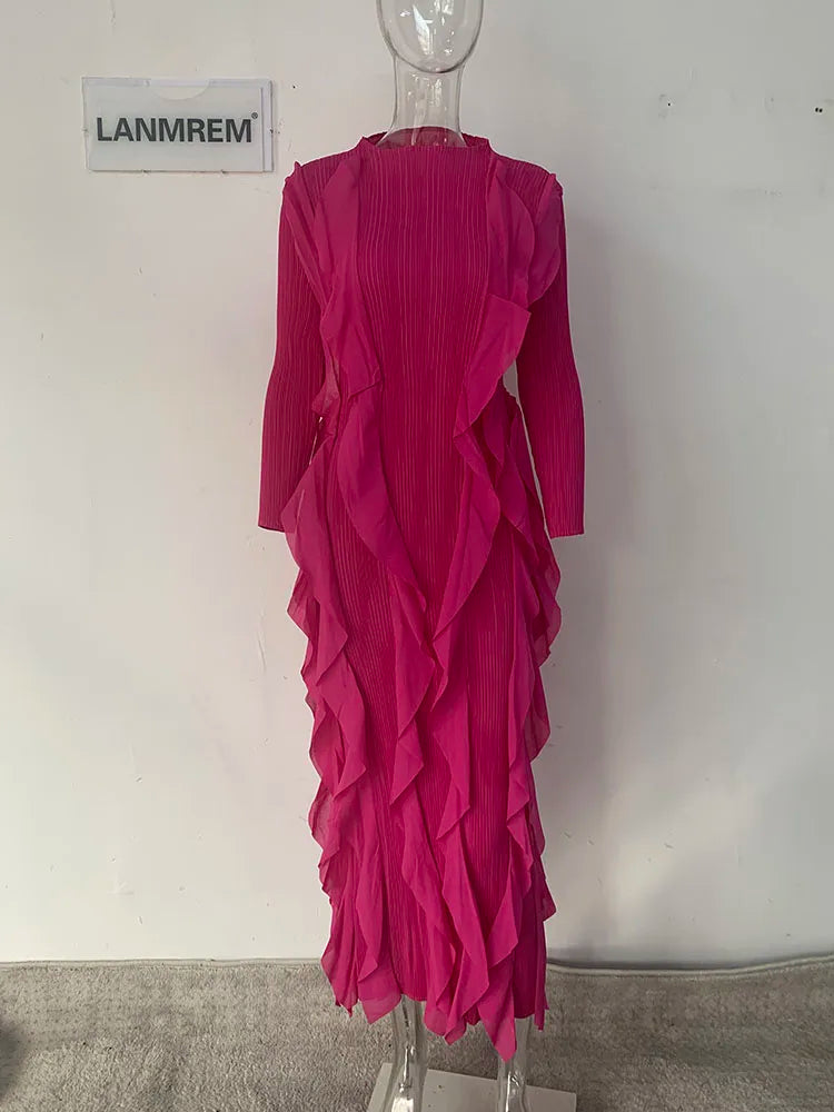Stylish LANMREM Pleated Dress for Women - Elegant Retro Design, Long Sleeves, 2024 Collection
