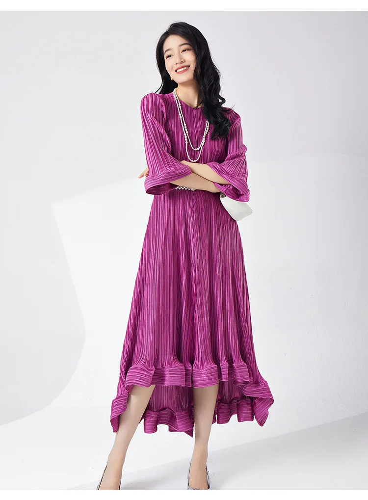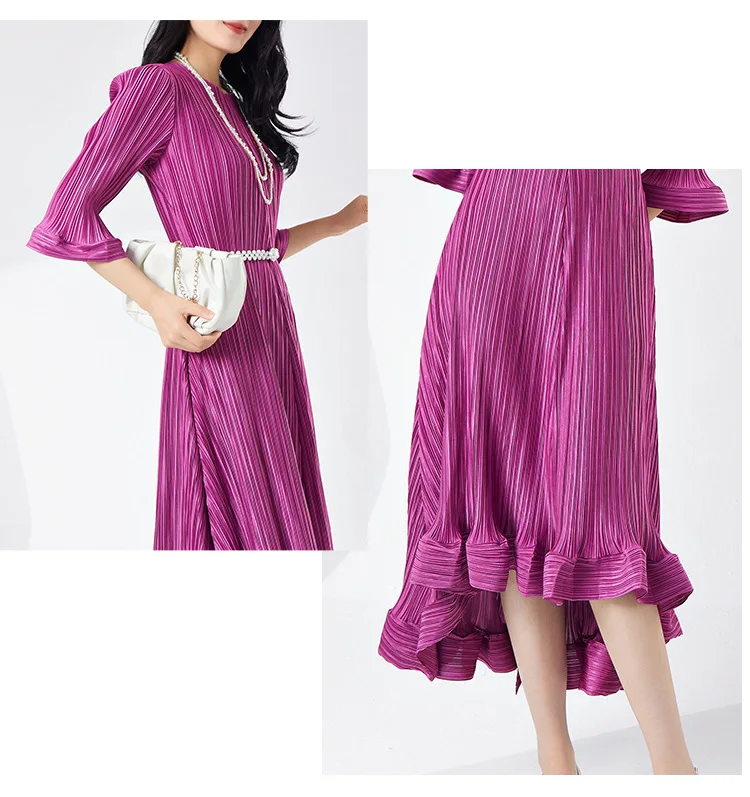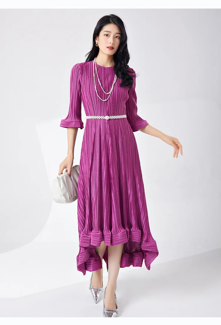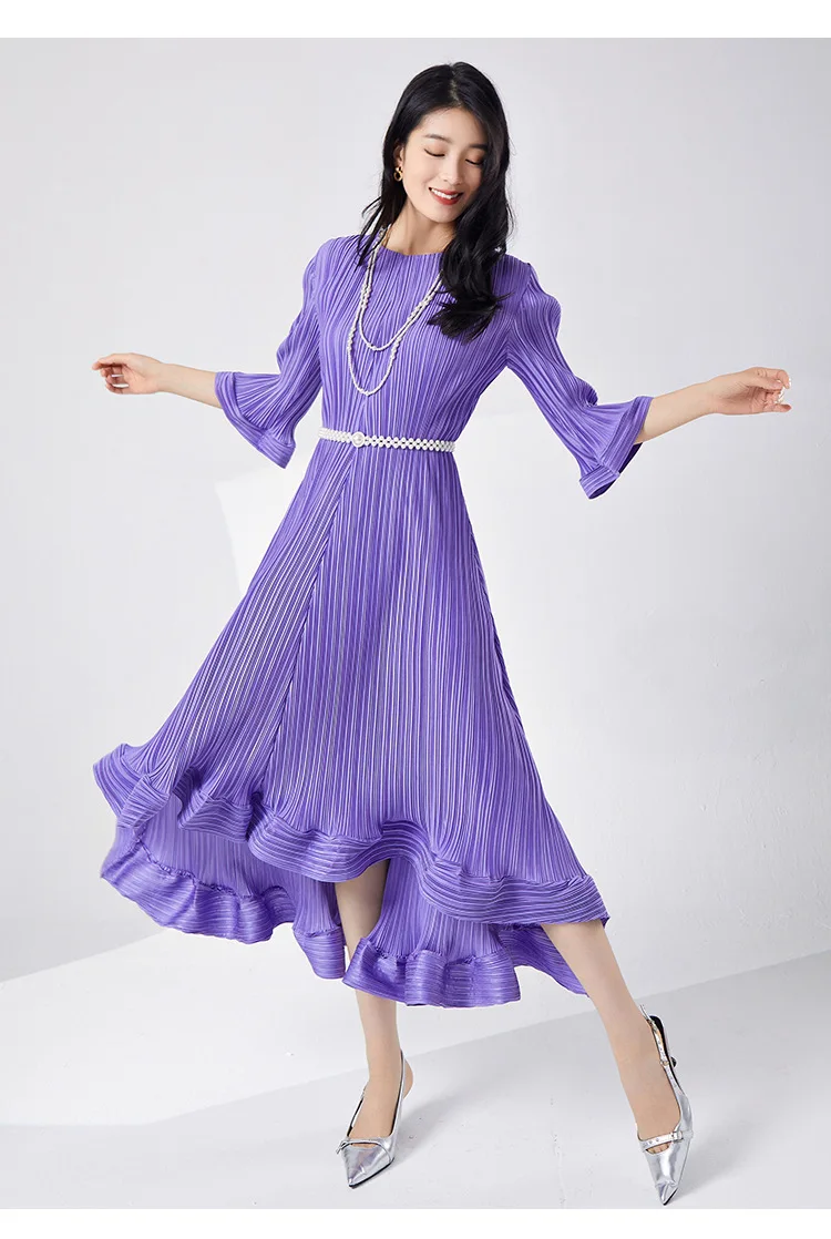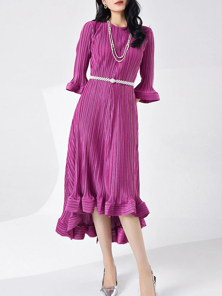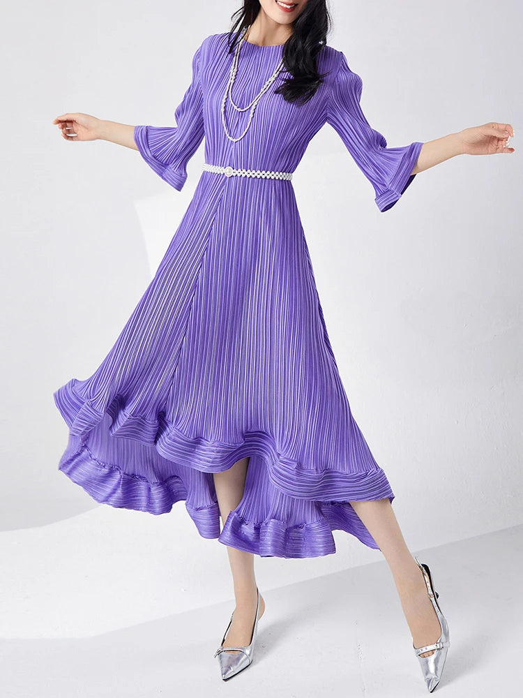 Introducing our GVUW Pleated Fashion Dress - the perfect addition to your wardrobe. This elegant dress features a flattering A-line silhouette, flare sleeves, and an irregular ruffled hemline for a touch of feminine charm. The included belt cinches at the waist to accentuate your figure. Made with premium materials, this dress is designed to be comfortable and stylish for any occasion. It's a best seller and a must-have for any fashion-forward woman. Hurry, this exclusive design is only available for a limited time. Get yours now and stand out in style!