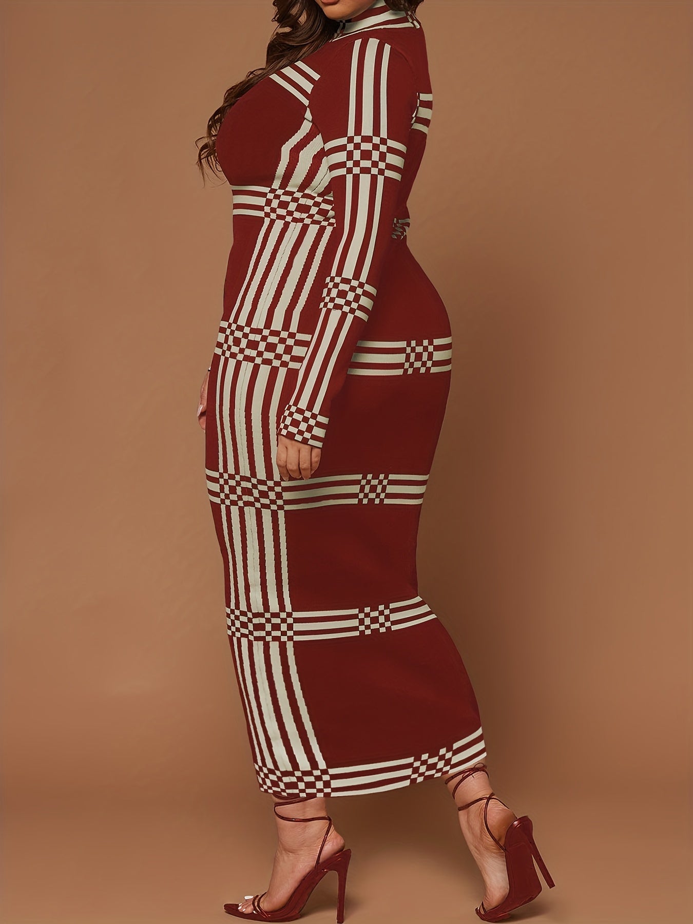 This plus size dress features a trendy colorblock geometric print and a comfortable turtleneck design. It is made with high-quality polyester and spandex for a fitted look and medium stretch. Perfect for all seasons, this dress is a must-have for any fashion-forward woman.