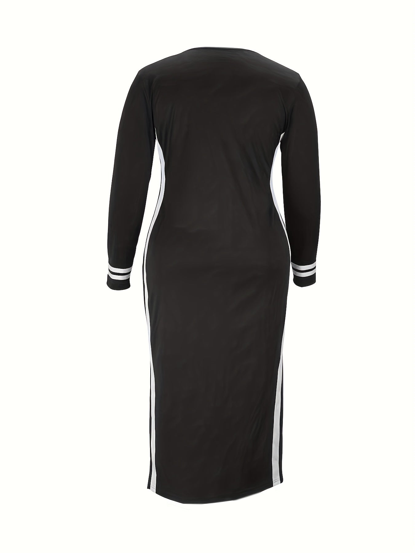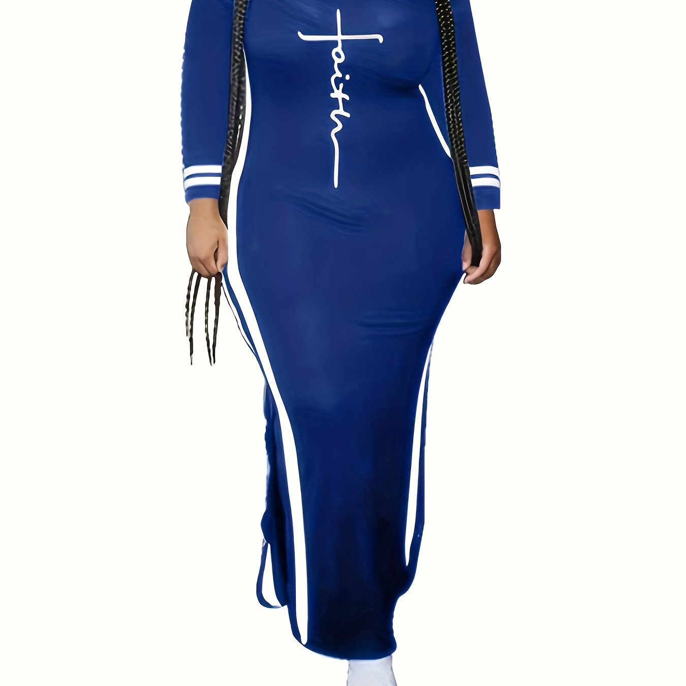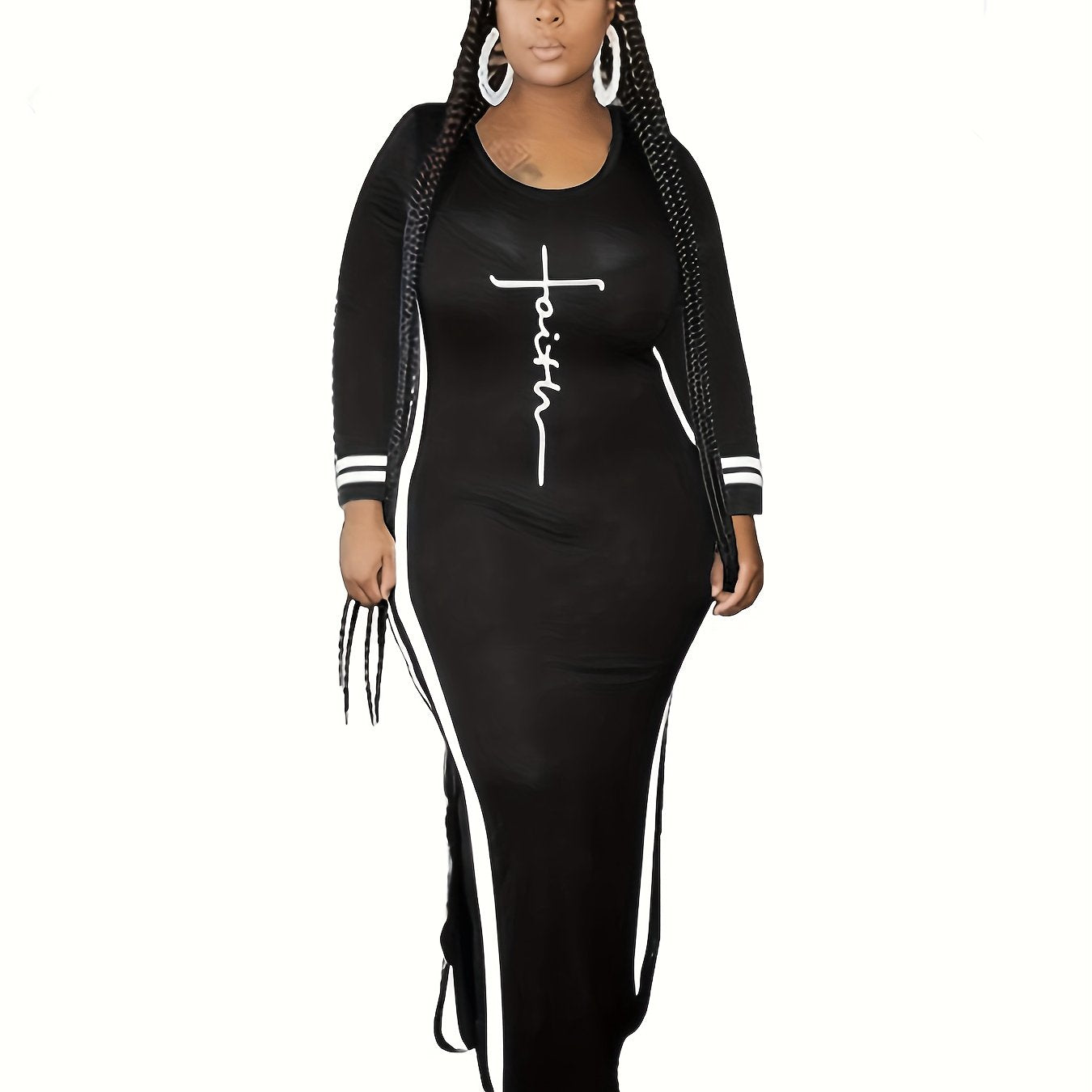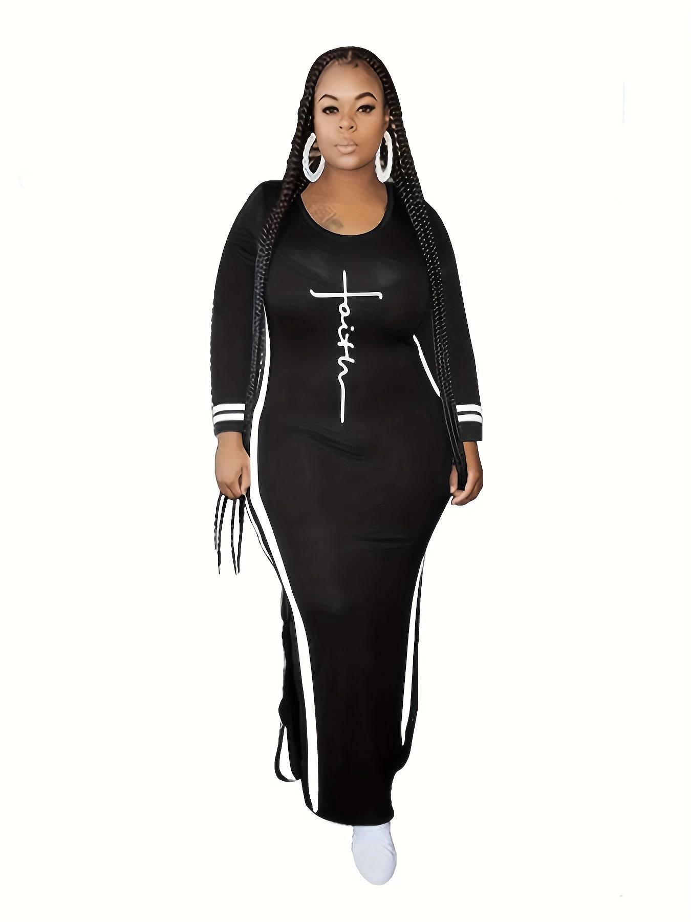 Elevate your casual wardrobe with our Plus Size Cross Letter & Stripe Print Dress. Made with a comfortable and stretchy polyester blend, this dress features a unique cross letter and stripe print design that adds a touch of personality to your look.
