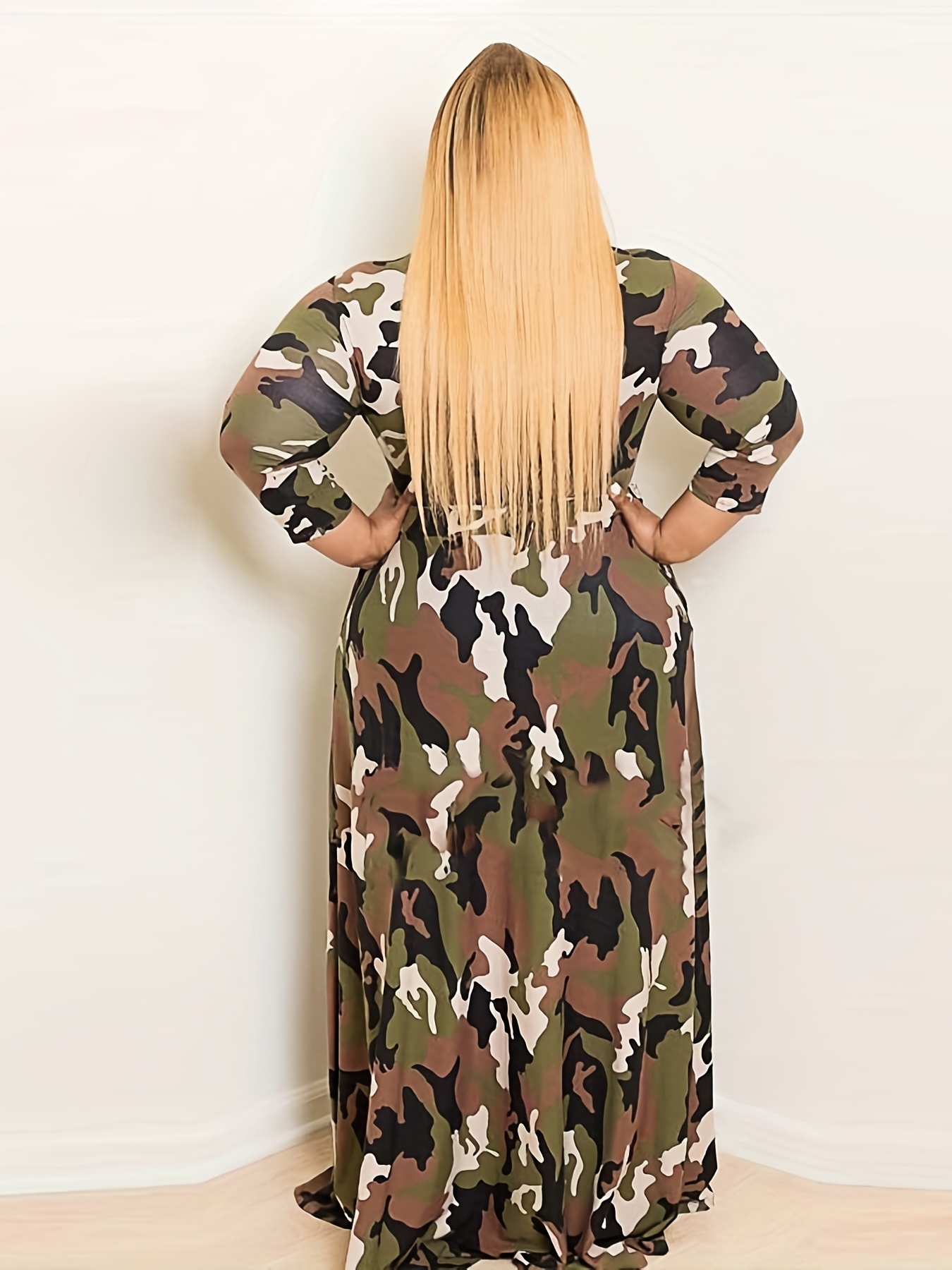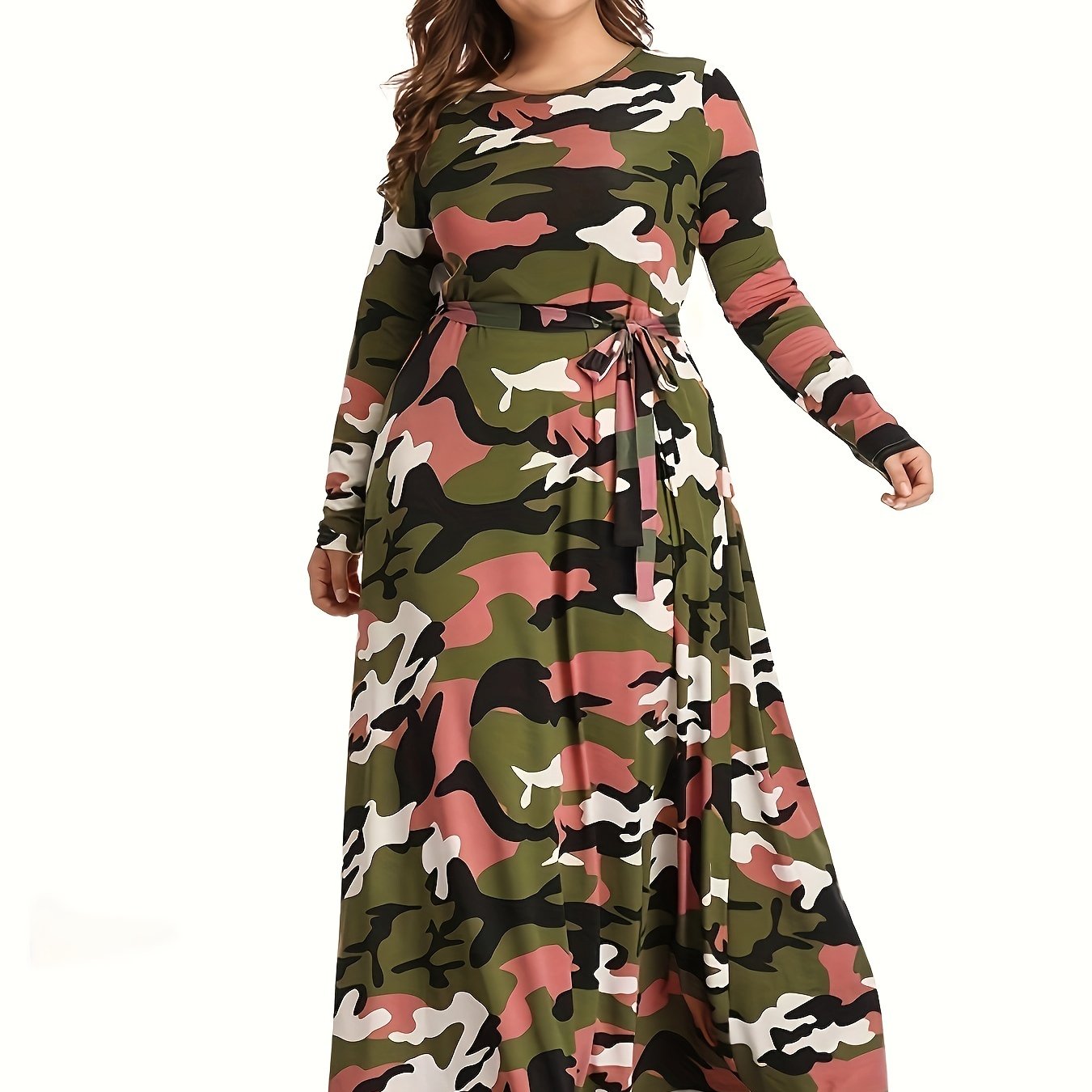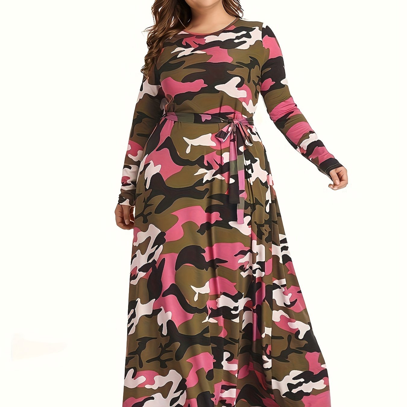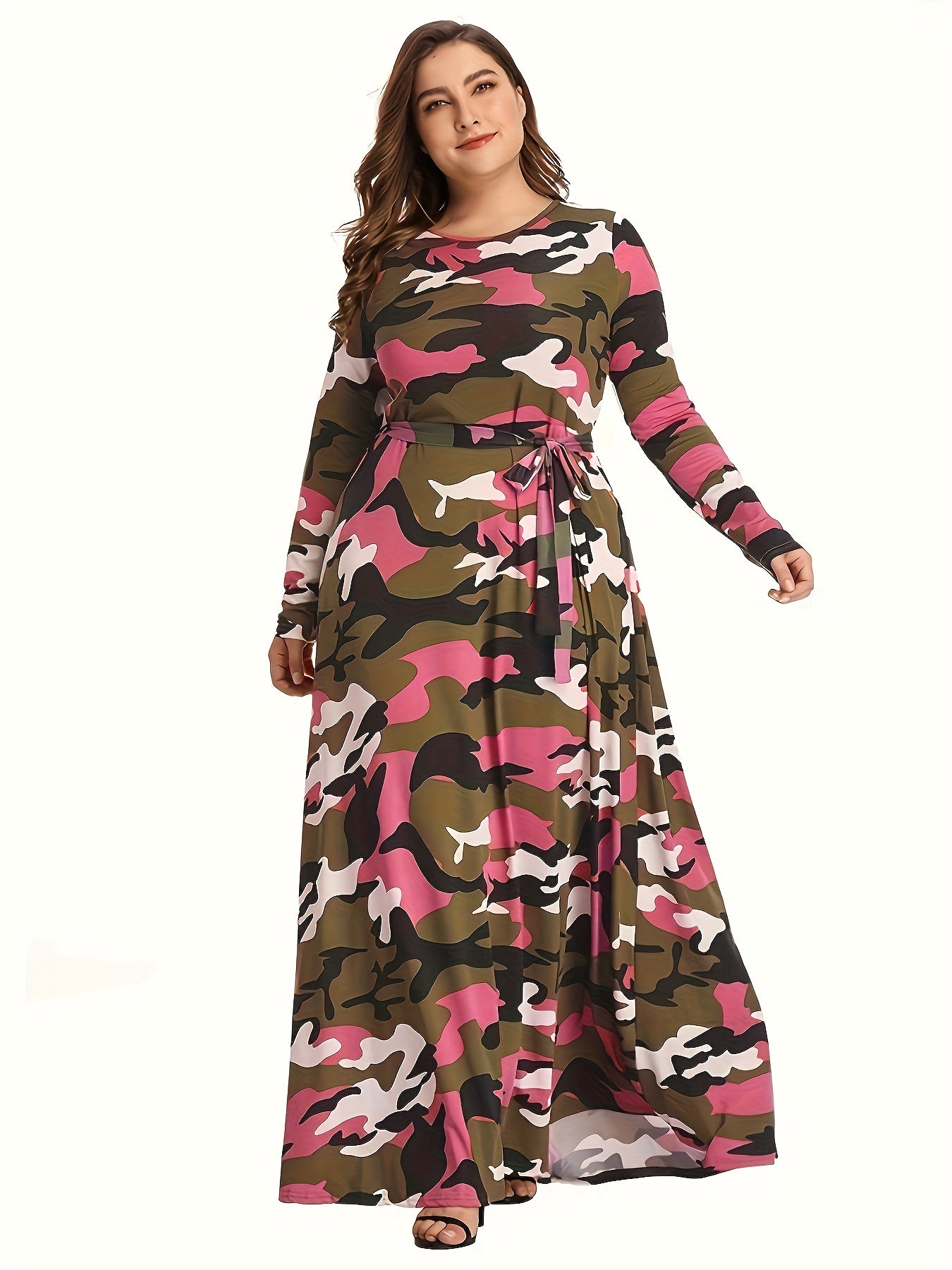 This plus size casual dress is perfect for any occasion. It features a trendy camo print, long sleeves, and comes with a belt for a flattering fit.