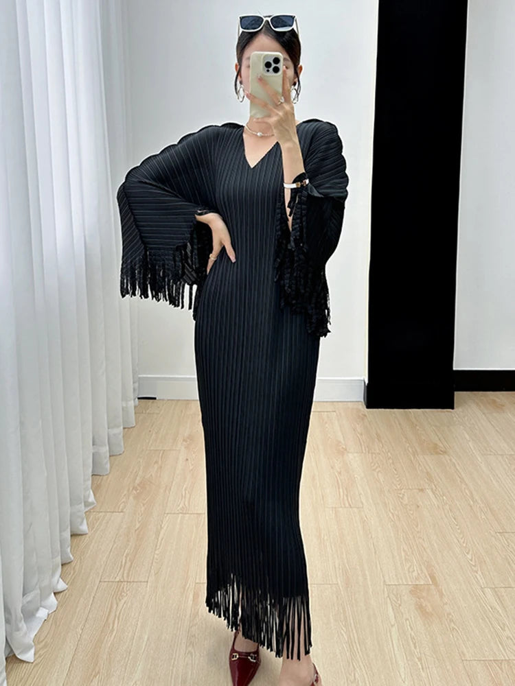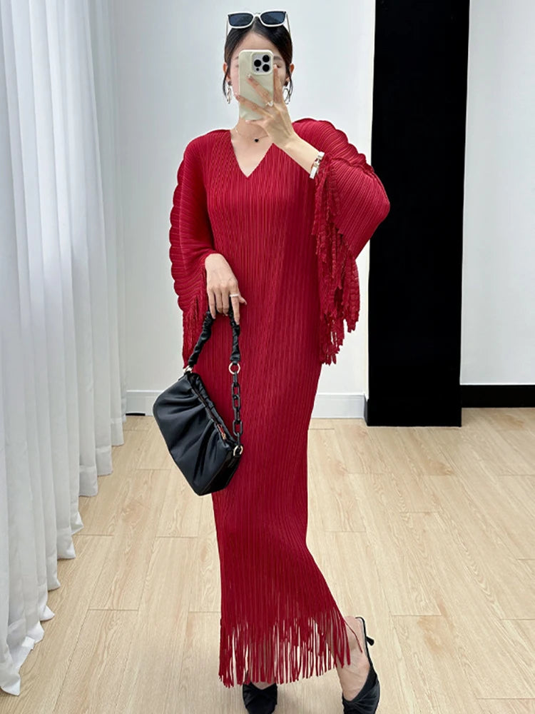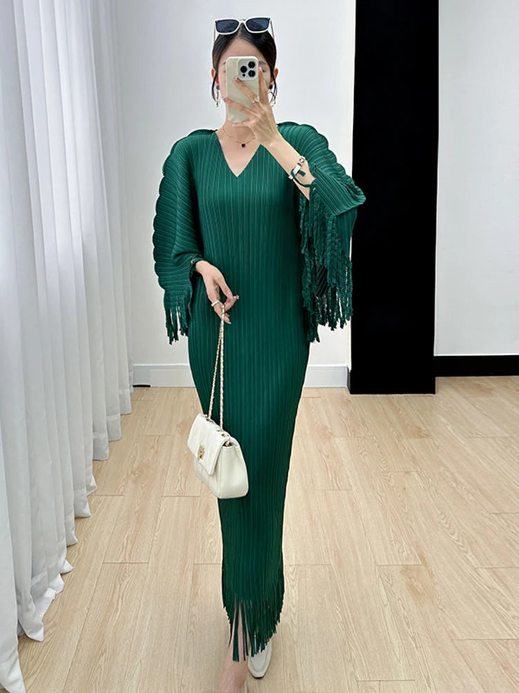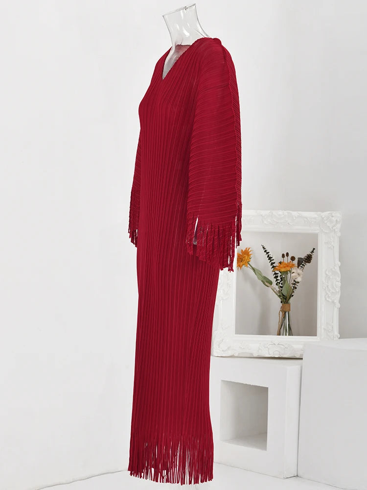 Introducing our LANMREM Tassel Pleated Dress - the perfect addition to your wardrobe for any party or festival! With its elegant V-neck, flowy batwing sleeves, and long length, this dress is designed to make you stand out in the crowd. Made with high-quality material, it is both comfortable and stylish, providing a perfect fit for sizes 90-130 in bust and 64-90 in waist. Our dress is available in a range of solid colors, making it a versatile choice for any occasion. Limited time offer - get yours today and experience the premium quality and exclusive design of our best-selling dress. Don't miss out on this must-have item that solves all your fashion woes. Trust us, you won't regret it.