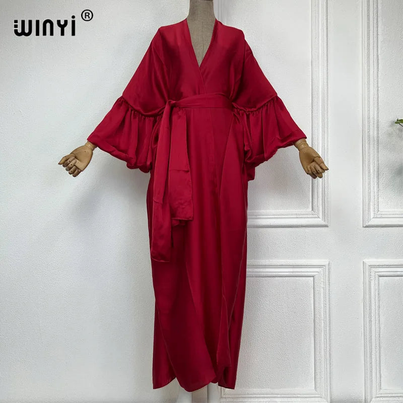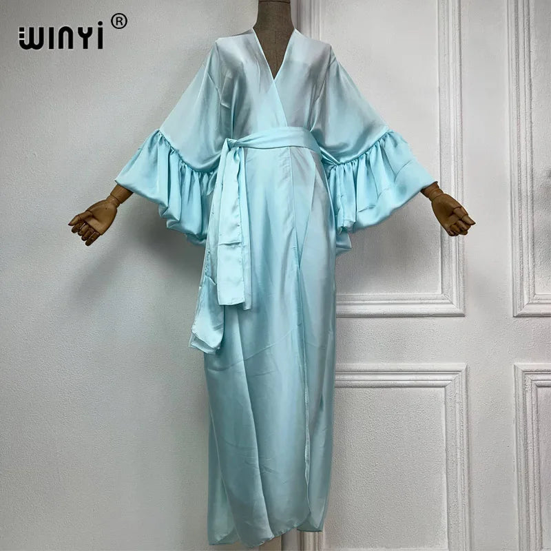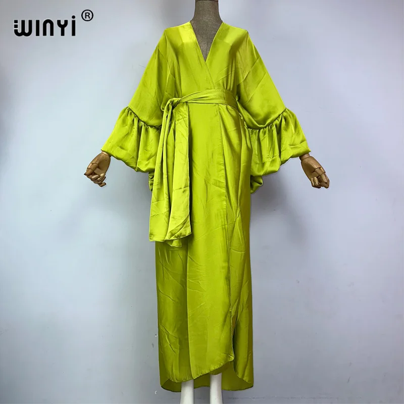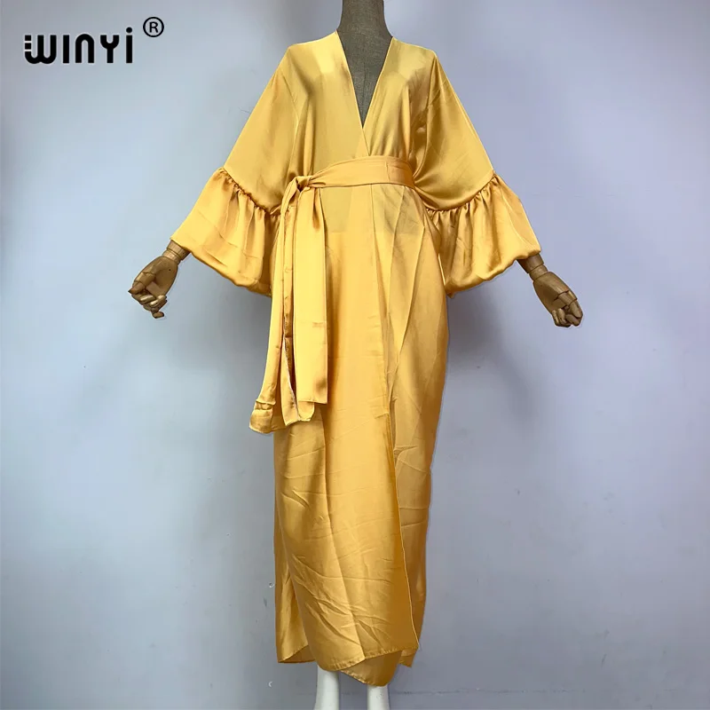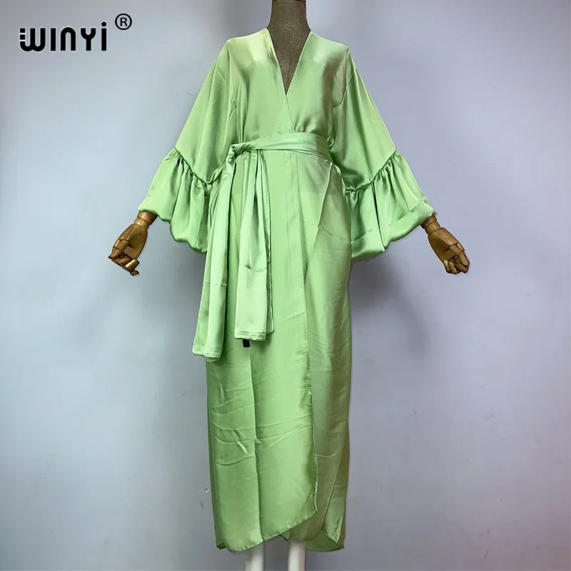 Introducing the WINYI monocolour Self Belted silk dress - the perfect addition to your summer wardrobe! This elegant dress is designed with bubble sleeves and a self belted waist, giving you a flattering silhouette and a touch of sophistication. Made from premium silk fabric, it's lightweight and perfect for your summer holiday or as a swim suit cover up. This versatile dress can also be worn as a kimono or cardigan, making it a must-have for any fashion-forward woman. Don't miss out on this exclusive limited time offer and get your hands on our best-selling dress today!