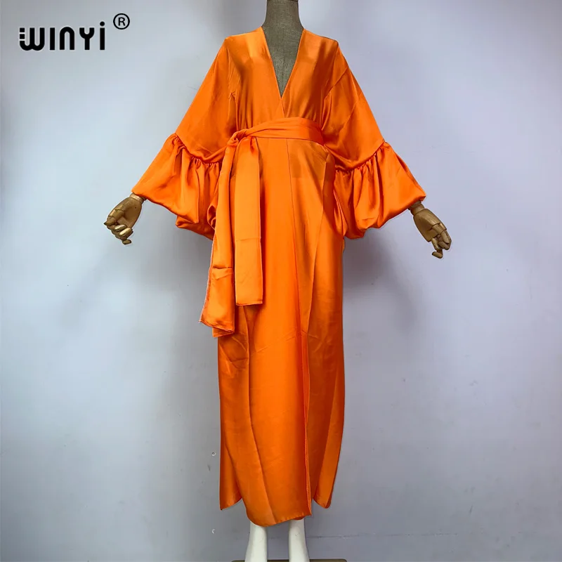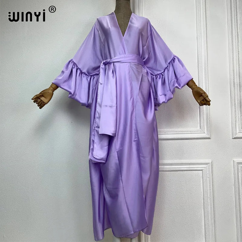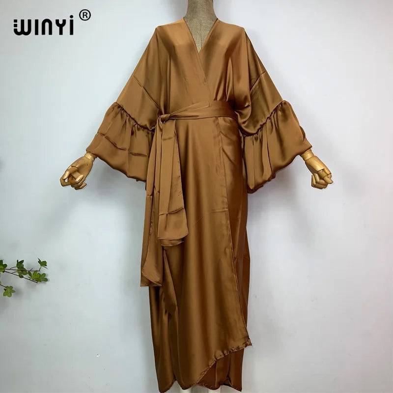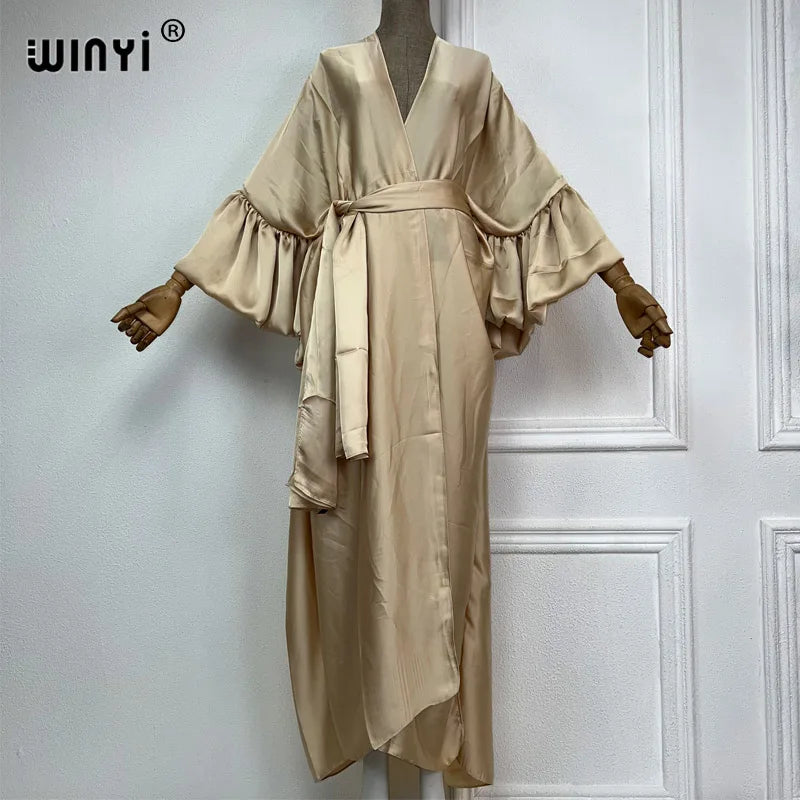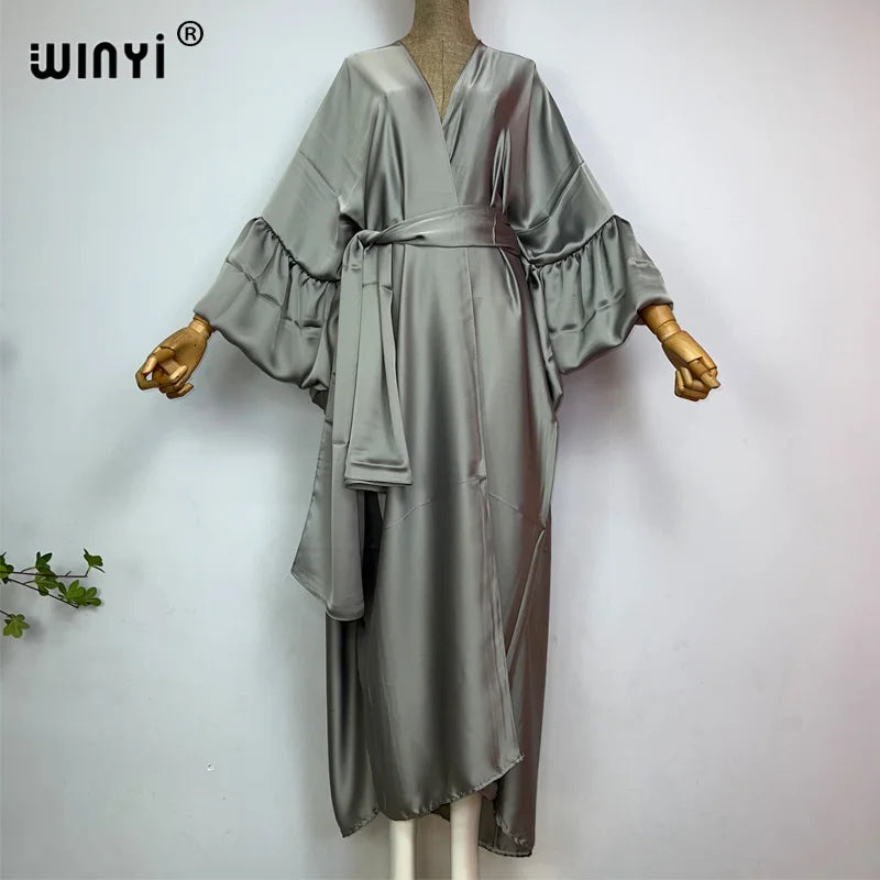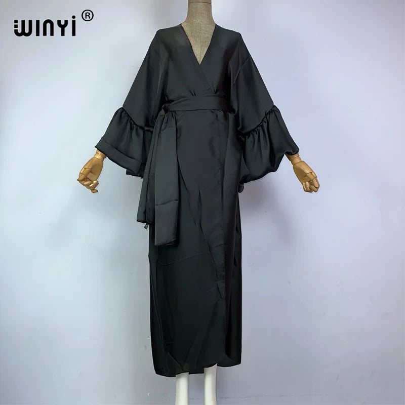 Introducing the WINYI monocolour Self Belted silk dress - the perfect addition to your summer wardrobe! This elegant dress is designed with bubble sleeves and a self belted waist, giving you a flattering silhouette and a touch of sophistication. Made from premium silk fabric, it's lightweight and perfect for your summer holiday or as a swim suit cover up. This versatile dress can also be worn as a kimono or cardigan, making it a must-have for any fashion-forward woman. Don't miss out on this exclusive limited time offer and get your hands on our best-selling dress today!