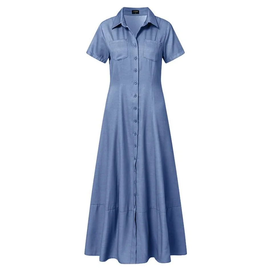 Introducing our best-selling fashion piece for the summer season - the Fashion Casual Elegant Long Dress! This dress is designed with a stylish turn-down collar and short sleeves, perfect for any party or casual outing. Made with premium materials, it offers a comfortable fit and a solid button design for added elegance. Say goodbye to the hassle of finding the perfect outfit, our dress solves all your fashion problems. Don't miss out on this exclusive limited time offer, get yours now and be the center of attention wherever you go!