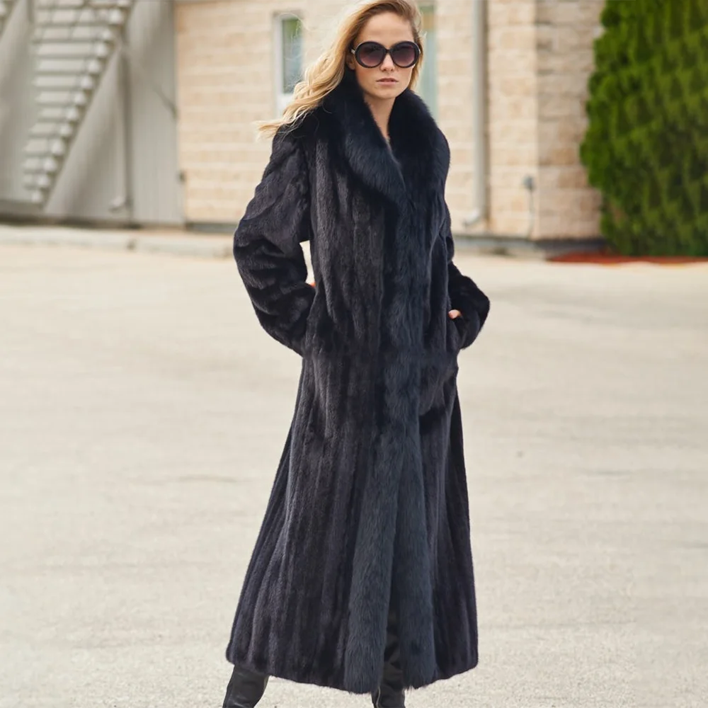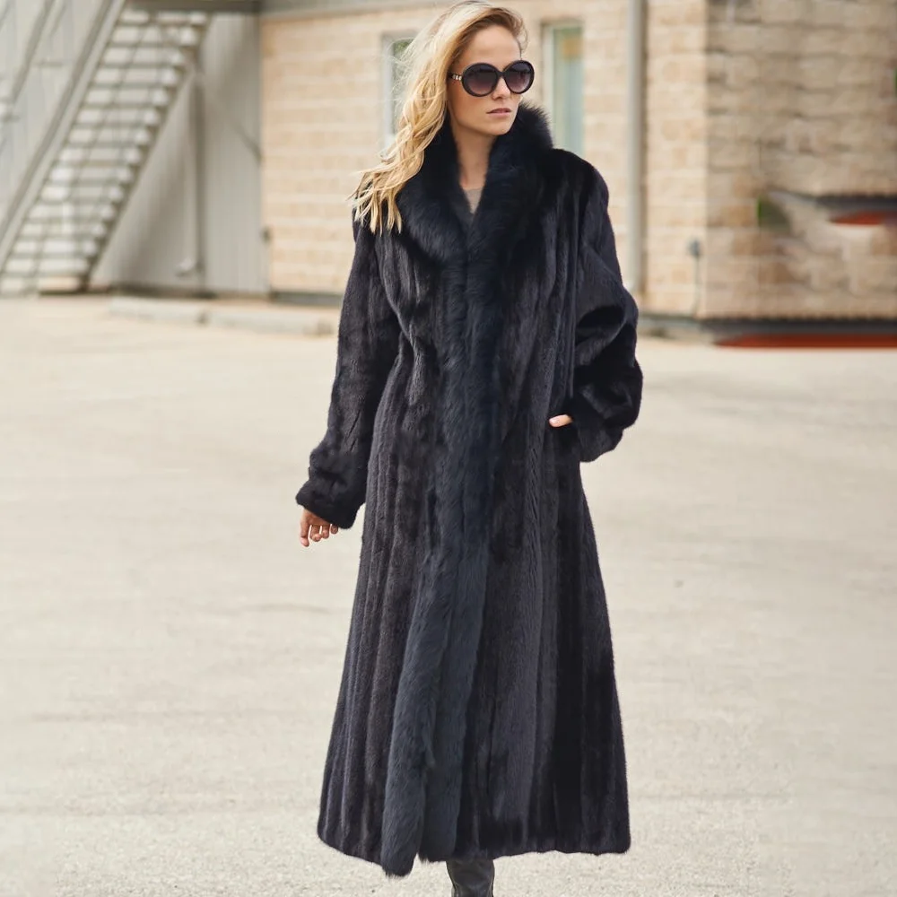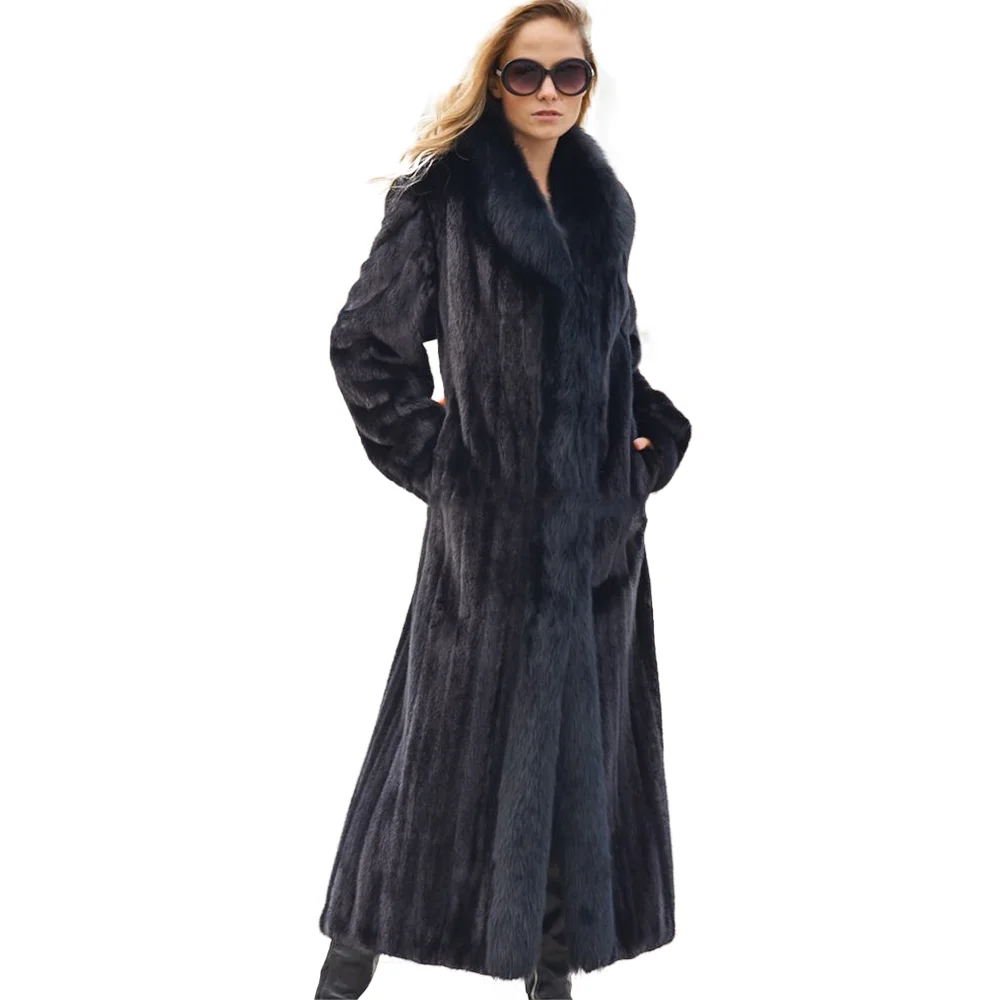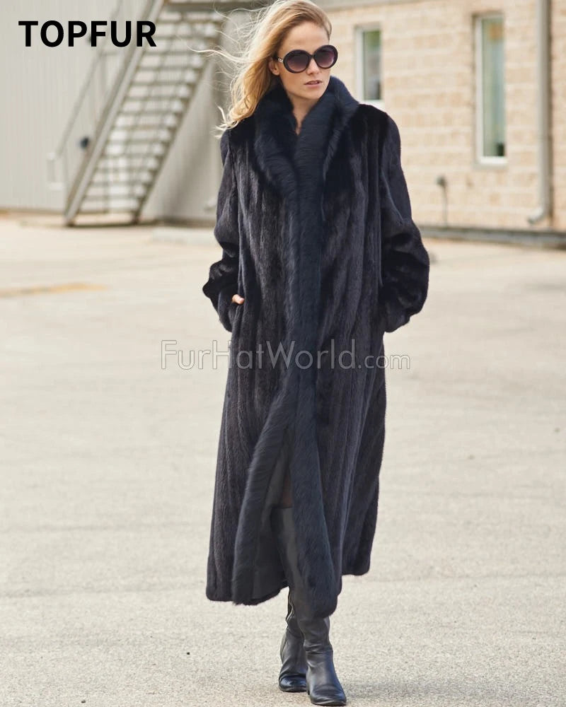 TOPFUR 100% Genuine Real Mink Fur Coat Black Long Sleeve With Fox Fur Collar 120 Cm Length Woman Winter Warm Jacket