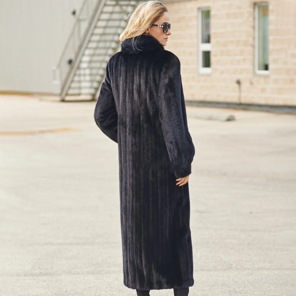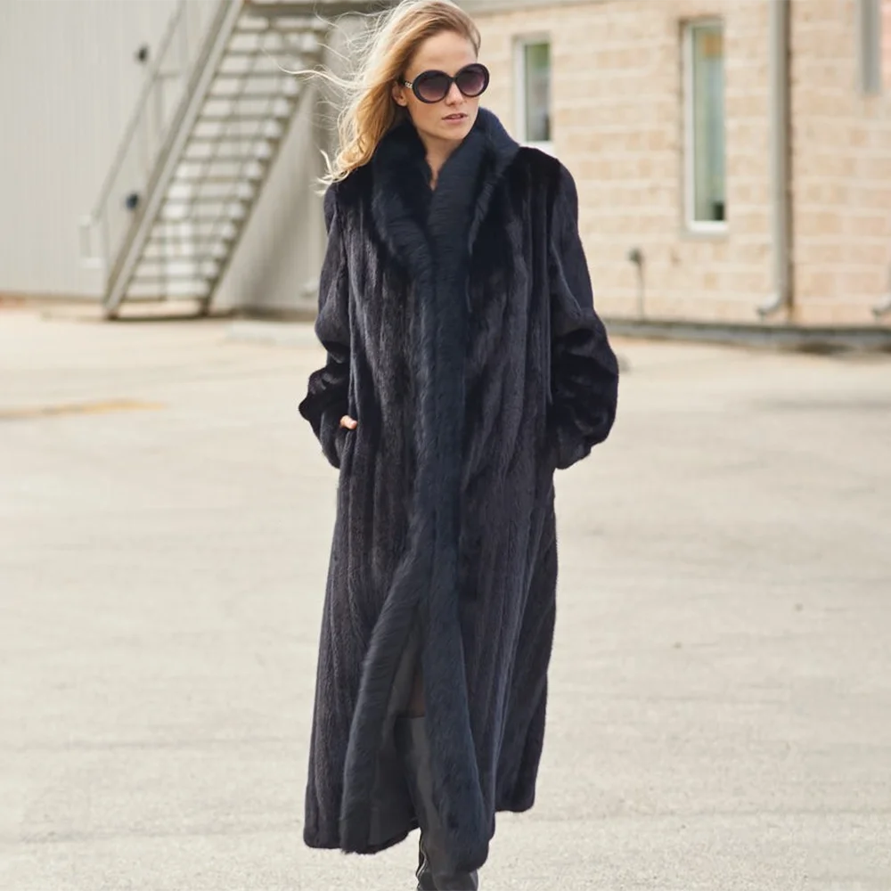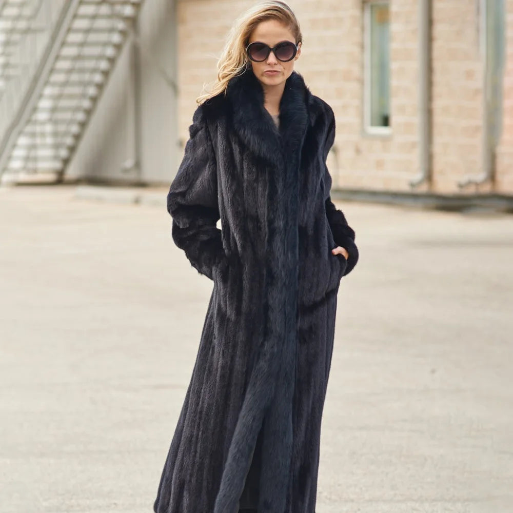 TOPFUR 100% Genuine Real Mink Fur Coat Black Long Sleeve With Fox Fur Collar 120 Cm Length Woman Winter Warm Jacket