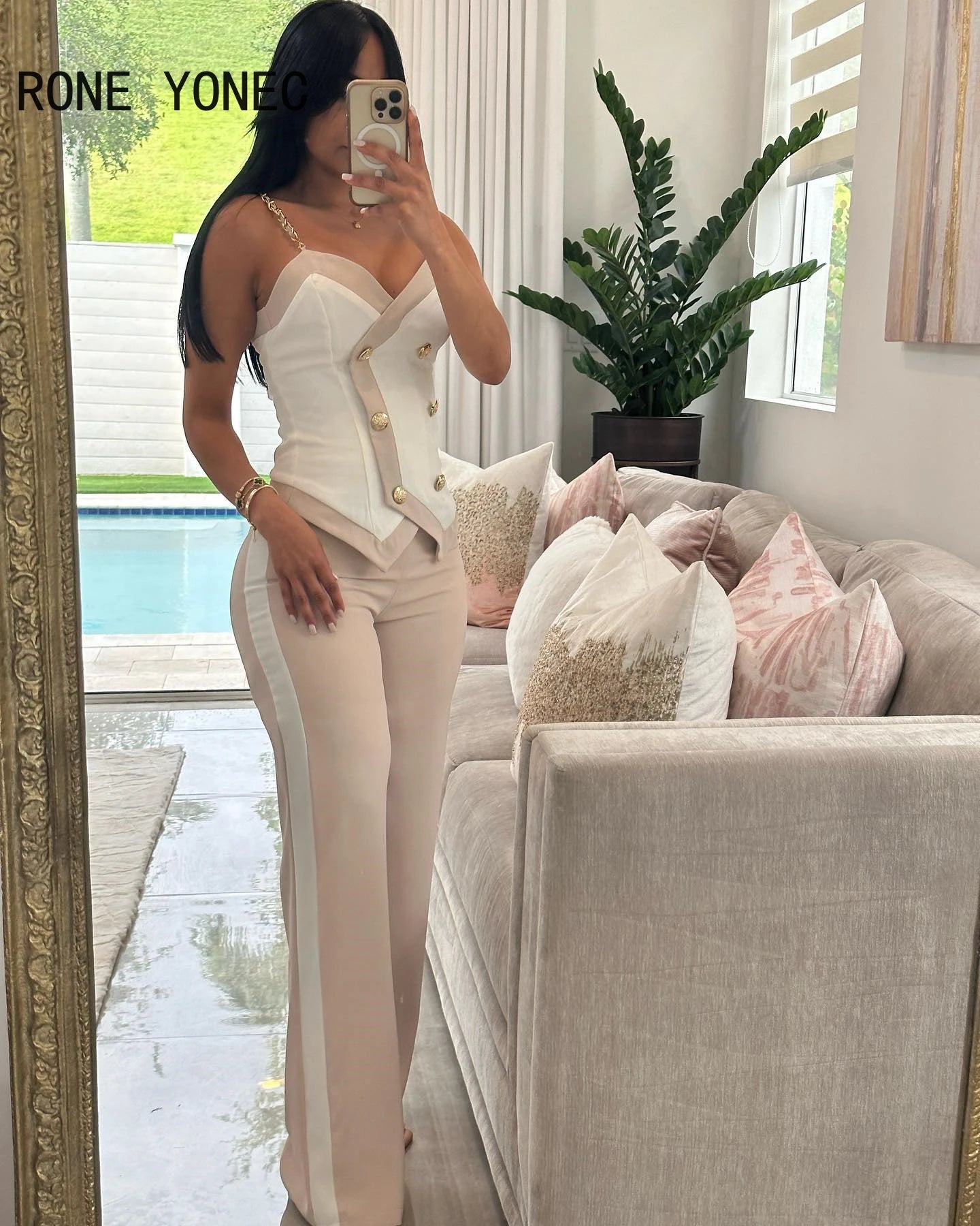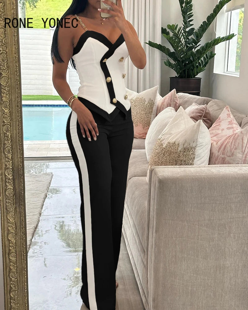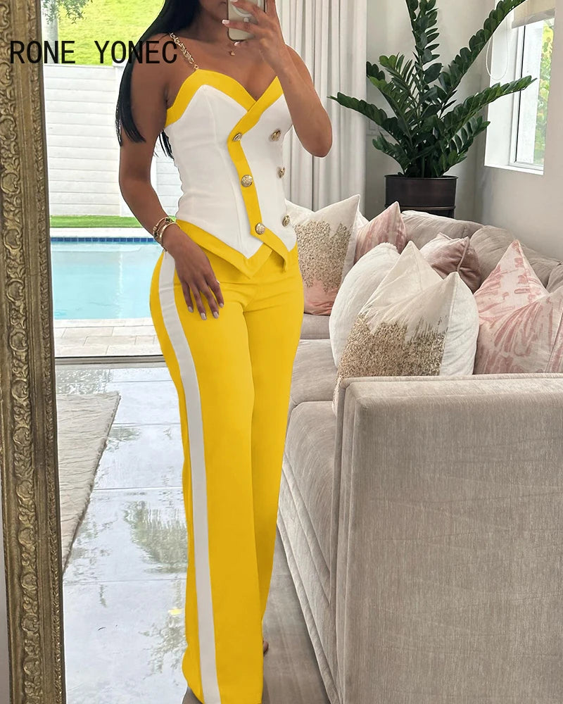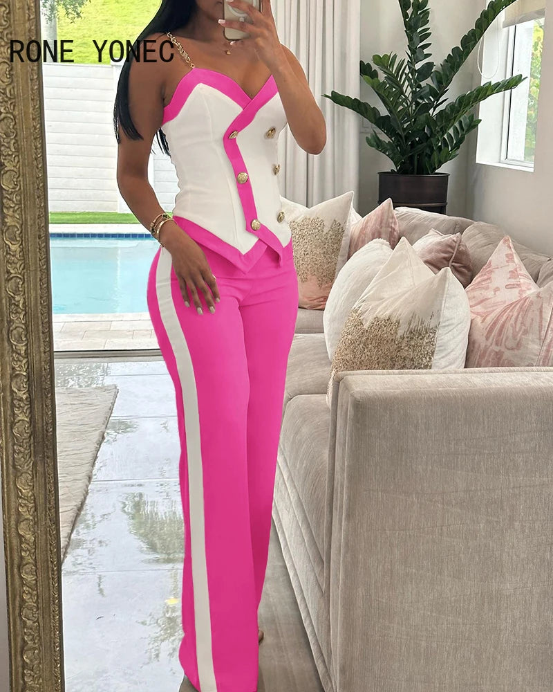 Introducing our Women's Sleeveless Vest and Working Pants Set - the perfect solution for a stylish and professional look. Made with deep double-breasted chain straps, patchwork pattern, and side stripes, this set is designed to make you stand out in the workplace. Our premium quality fabric ensures a comfortable fit, while the measurement chart helps you find your perfect size. With a slight color difference due to lighting, this set is exclusively designed for the modern working woman. Limited time offer - get your best seller set now and be on the go in style!