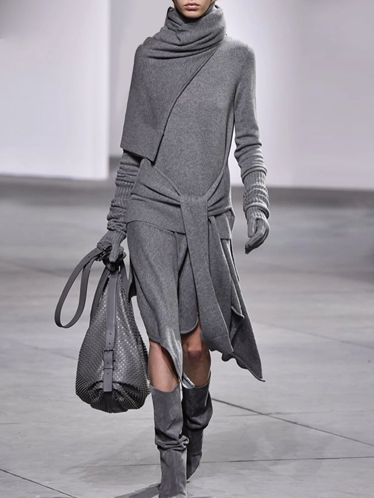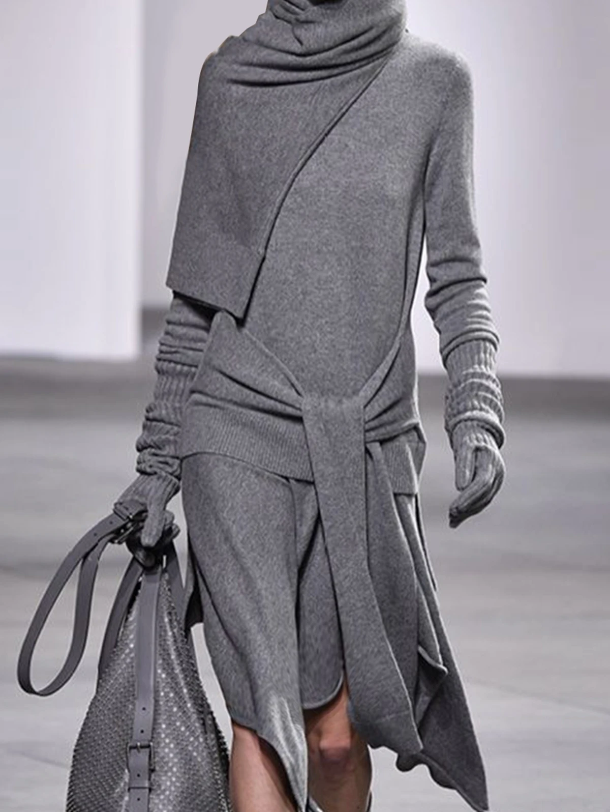 Elevate your style game with our Vintage Asymmetrical Midi Dress featuring a cowl neck and tied-up long sleeves for a chic look that stands out from the crowd.